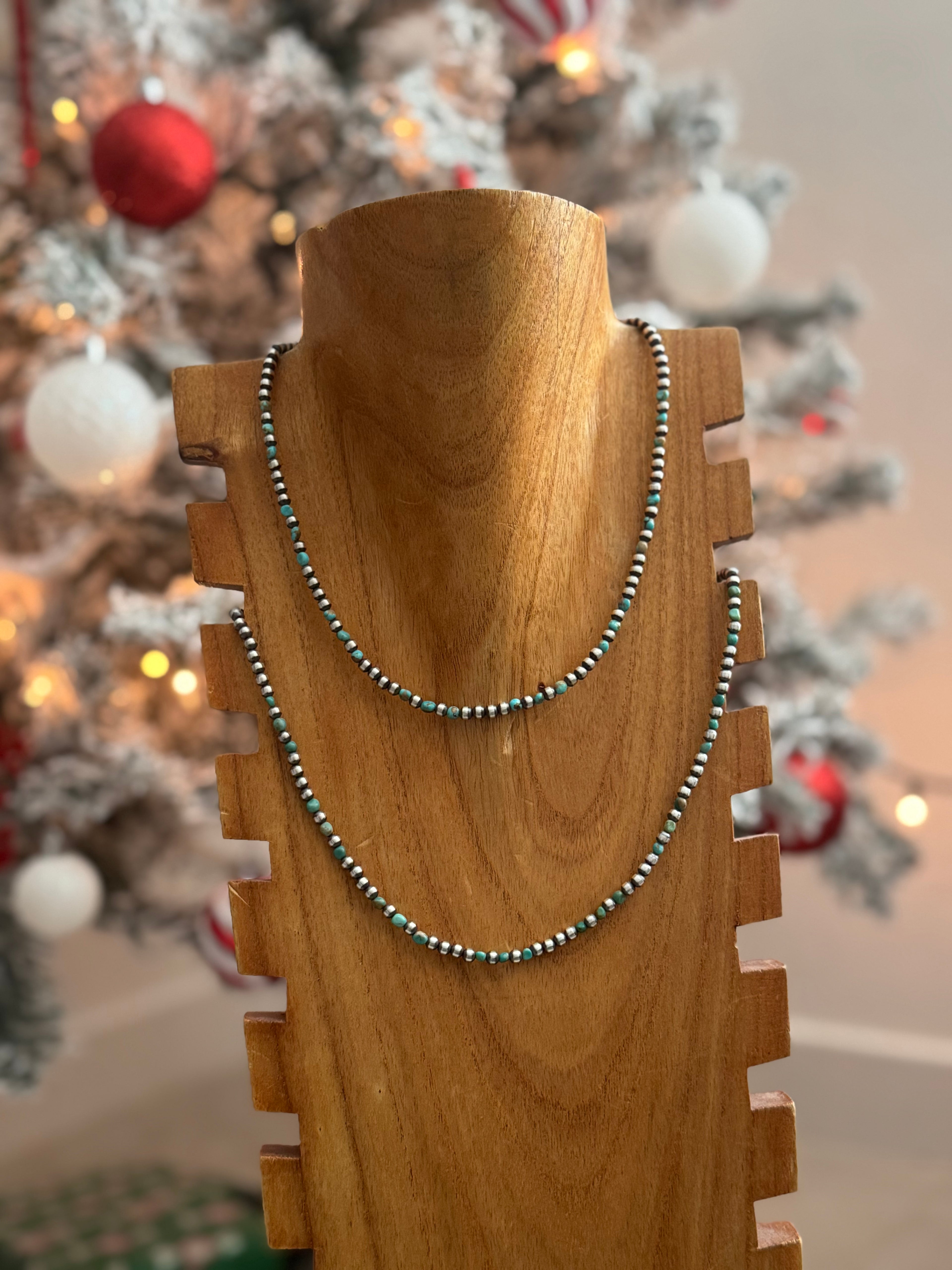 Navajo Strung Kingman Turquoise & Sterling Silver Beaded Pearl Necklace. It measures 18 inches long.