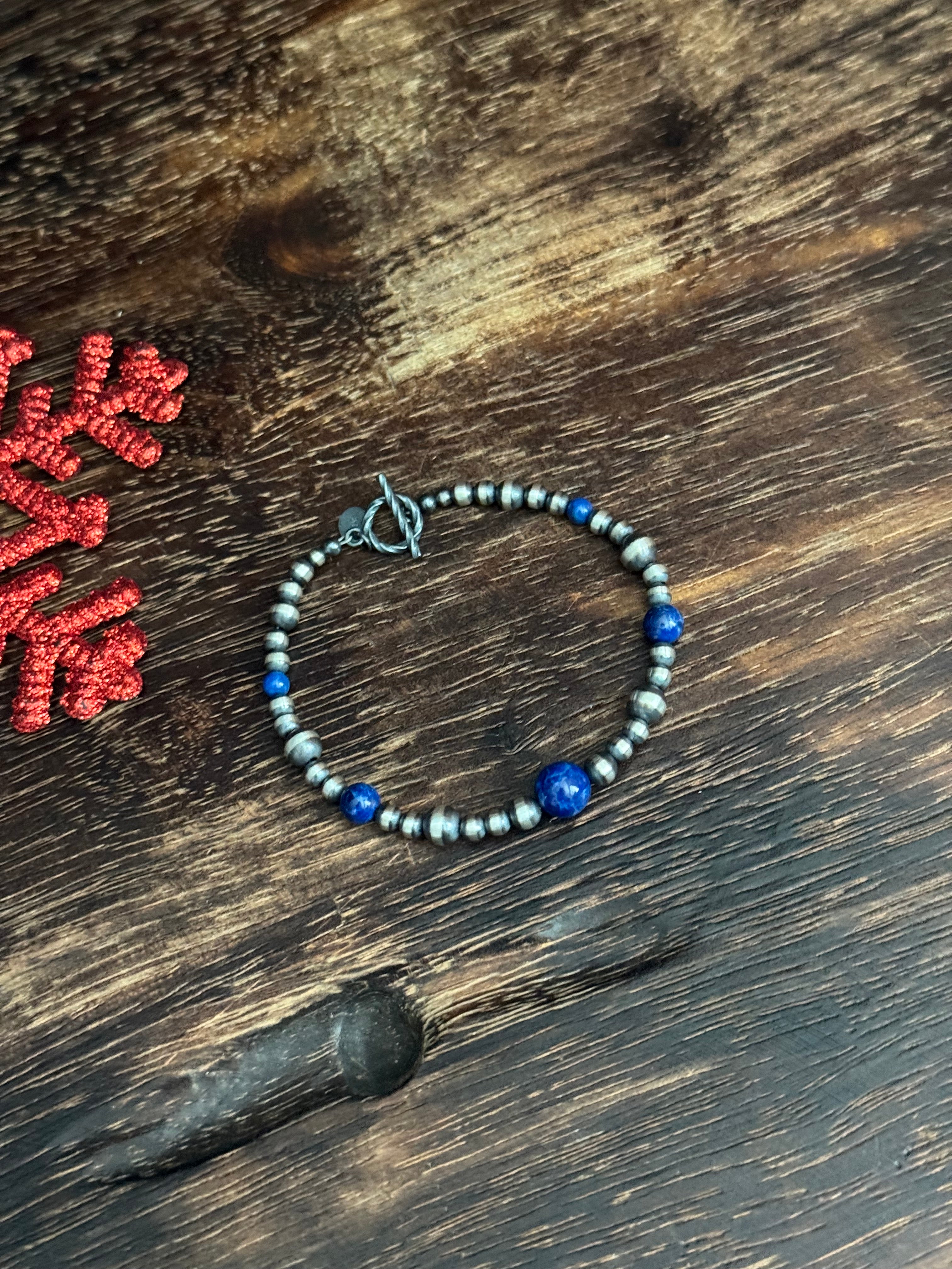 Navajo Strung Lapis & Sterling Silver Pearl Beaded Bracelet. It measures 7 1/2 inches long.