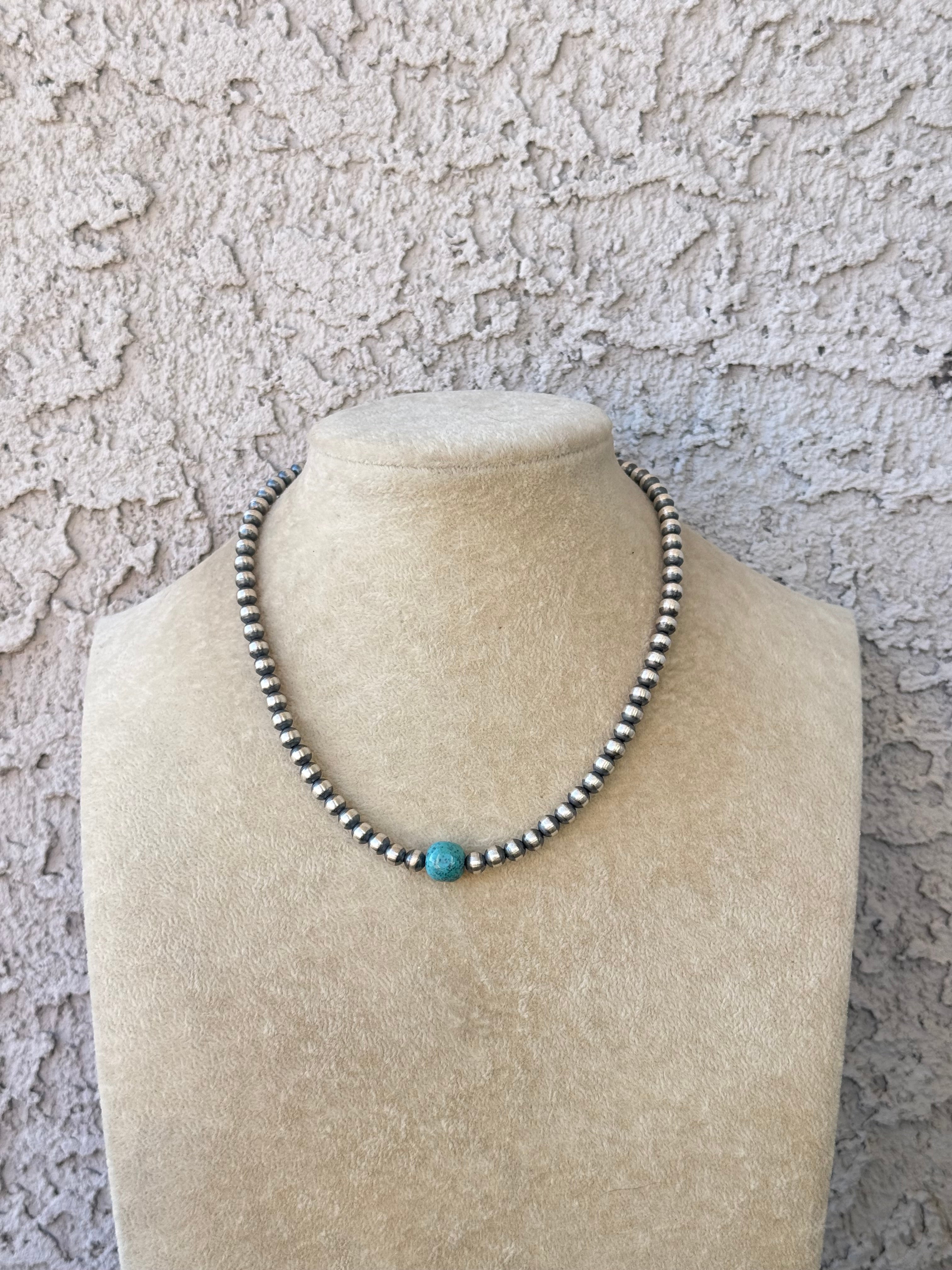 Navajo Strung Egyptian Turquoise & Sterling Silver Pearl Necklace. It measures 14 inches long.