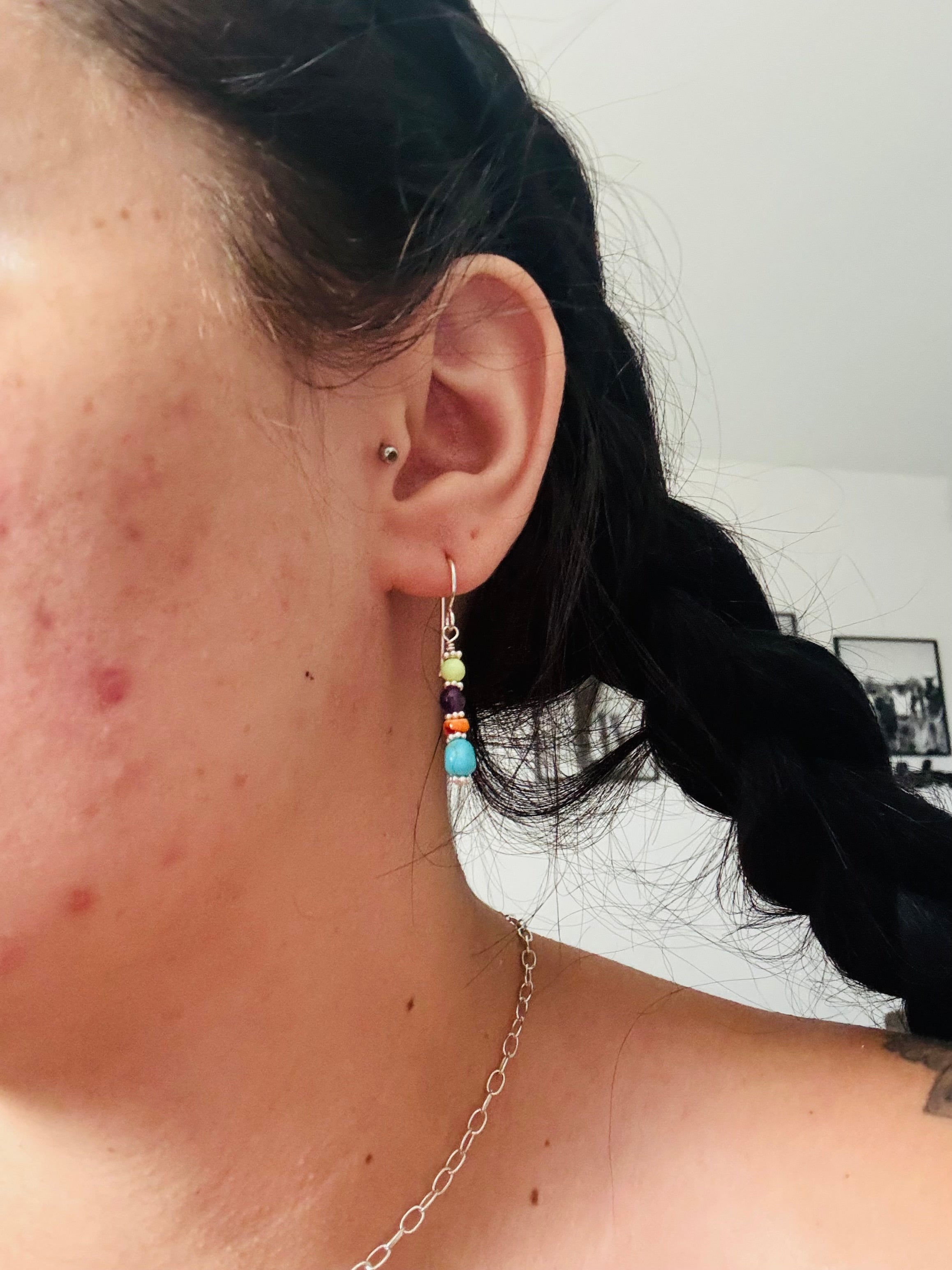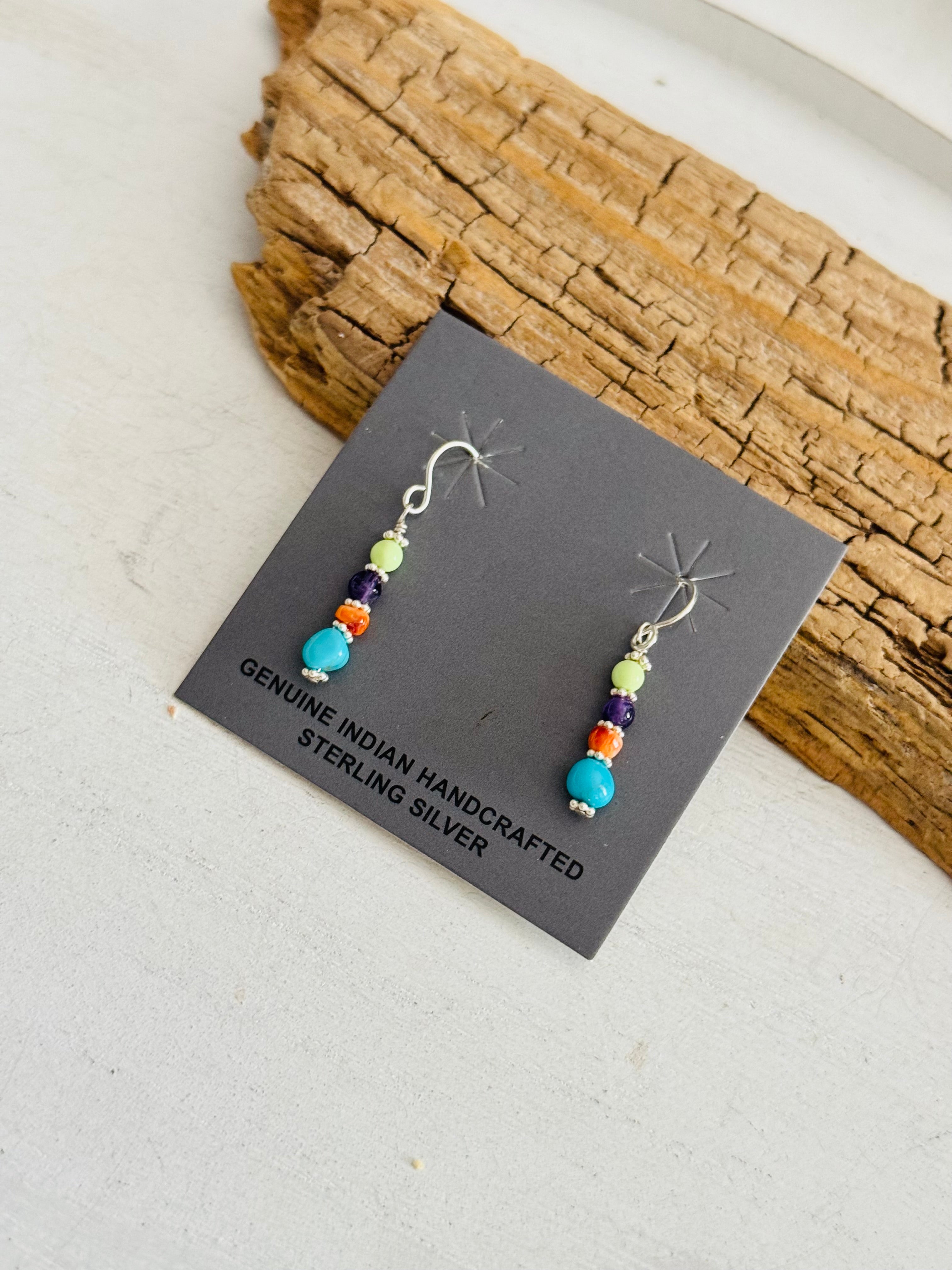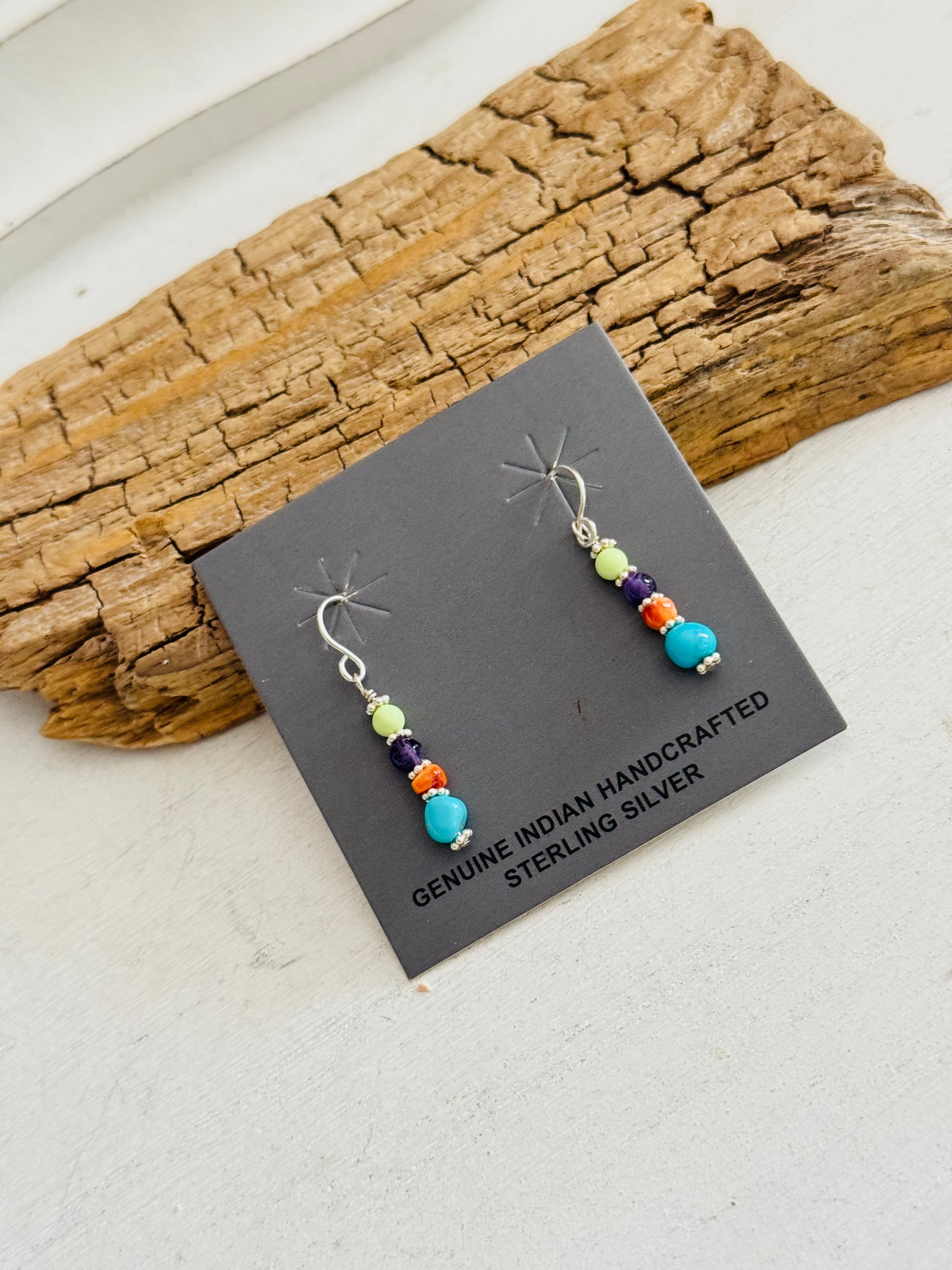 Navajo Strung Multi Stone & Sterling Silver Beaded Dangle Earrings. It measures 1 1/4 inches long.