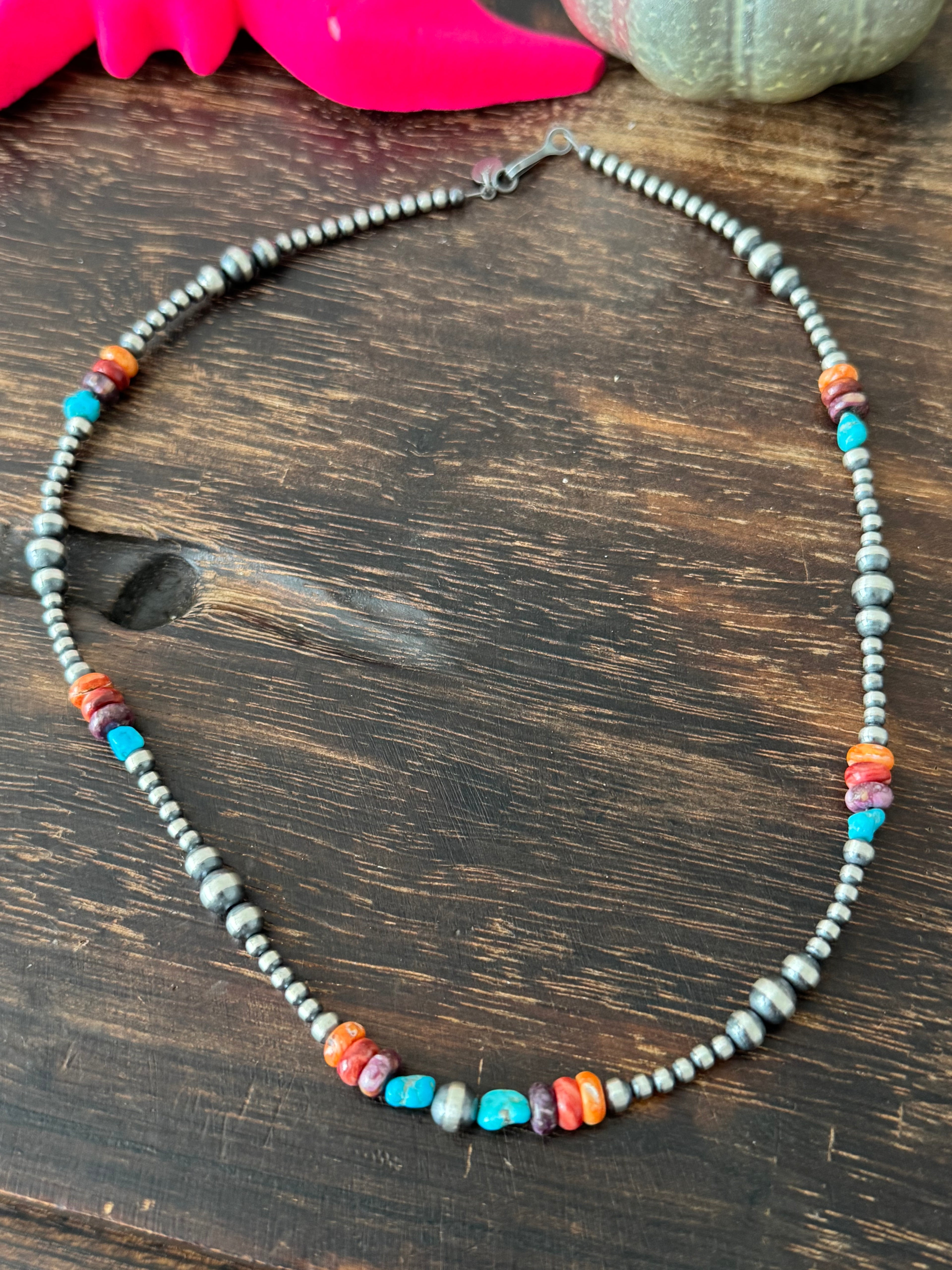 Navajo Strung Multi Stone & Sterling Silver Graduated Pearl Necklace
