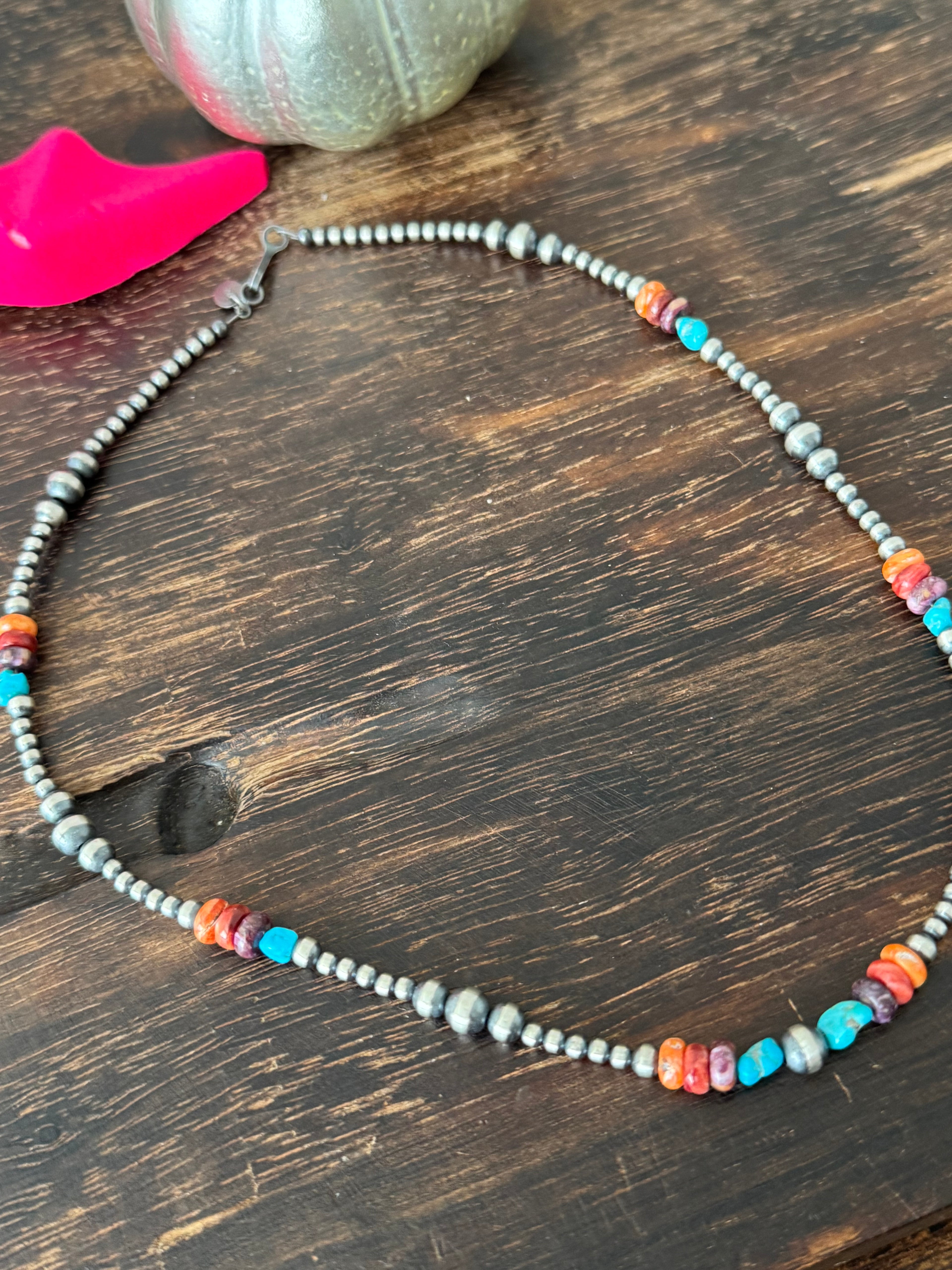 Navajo Strung Multi Stone & Sterling Silver Graduated Pearl Necklace. They measure 18 inches long. Single Stranded Necklace.