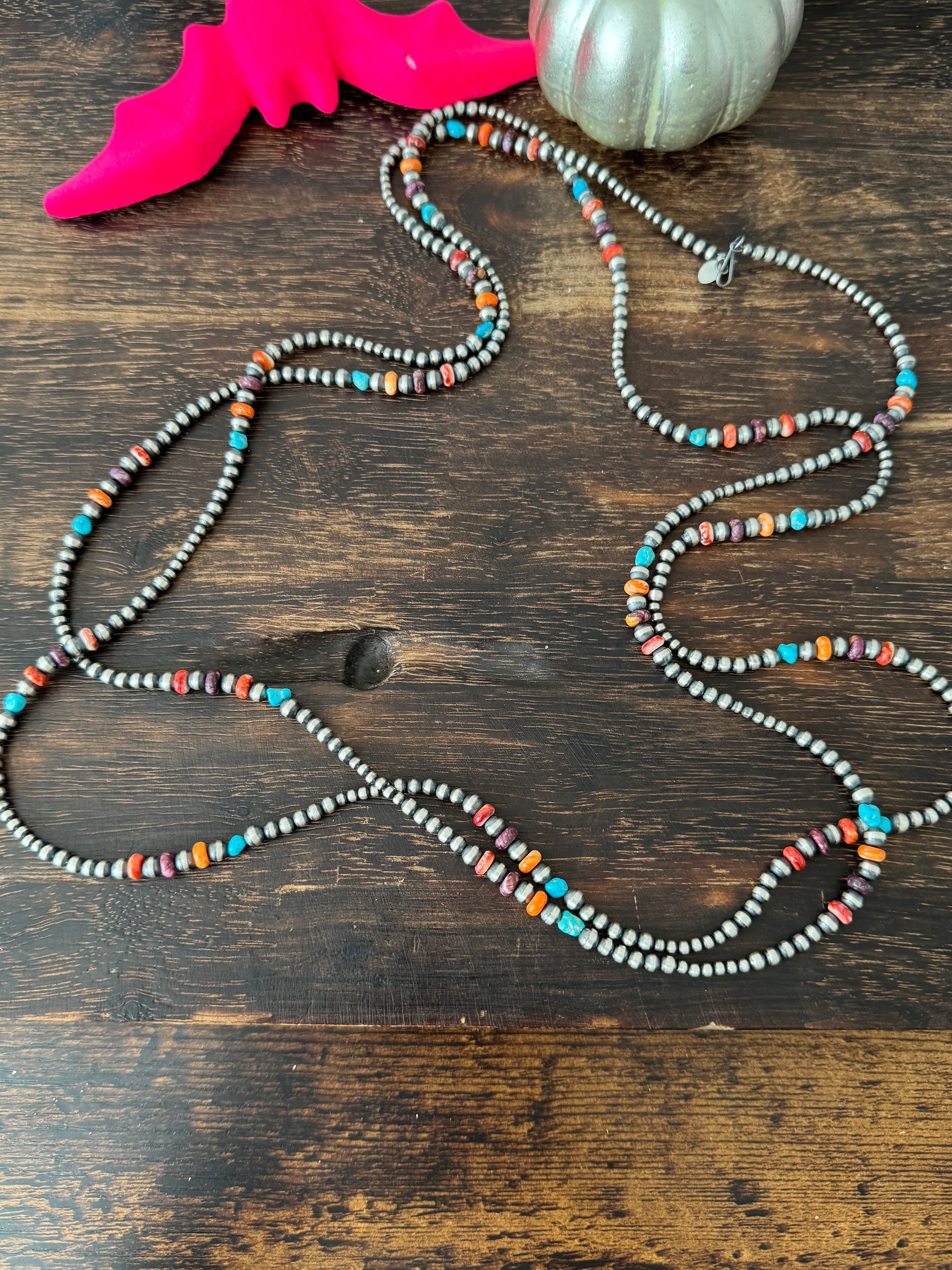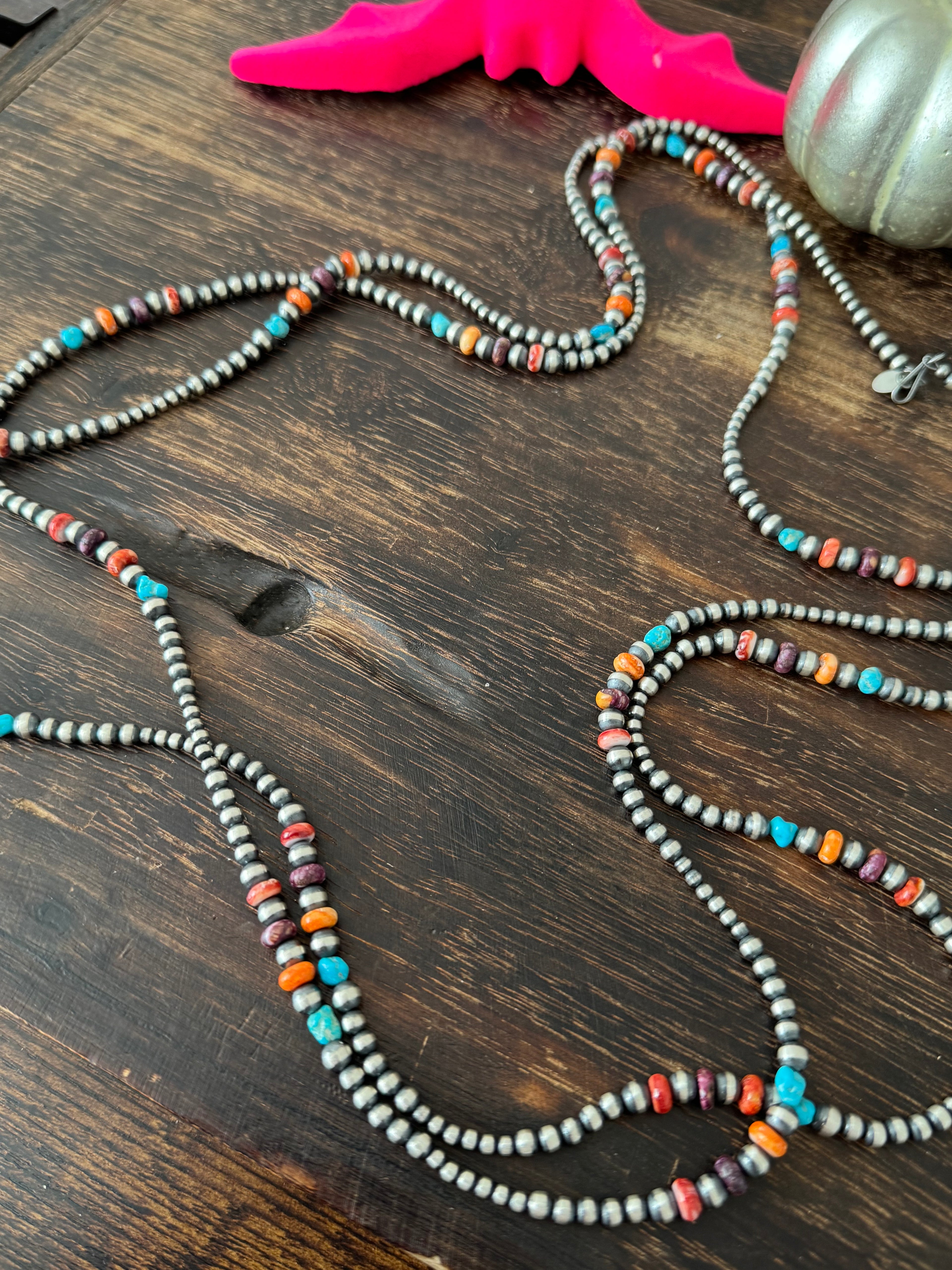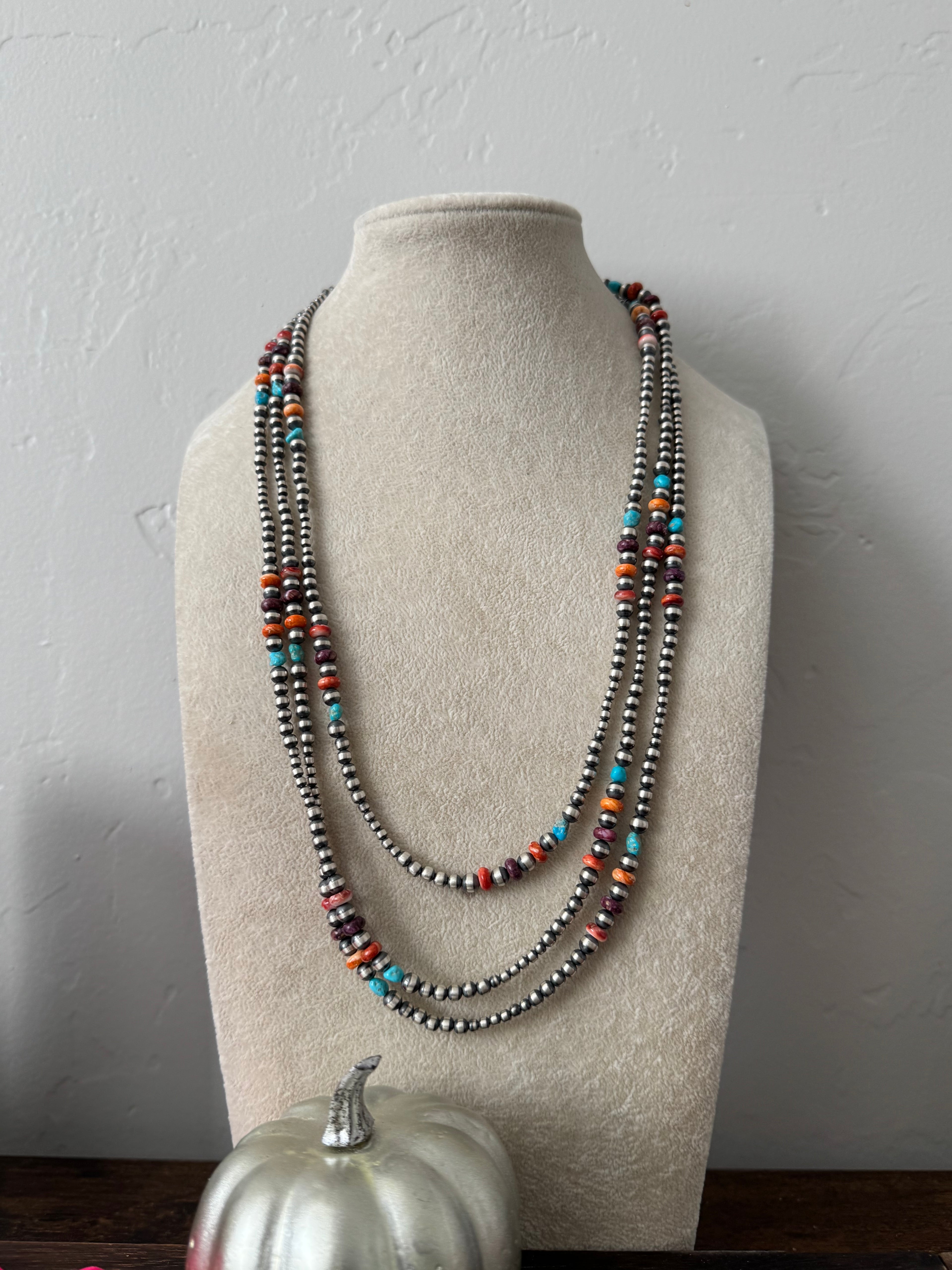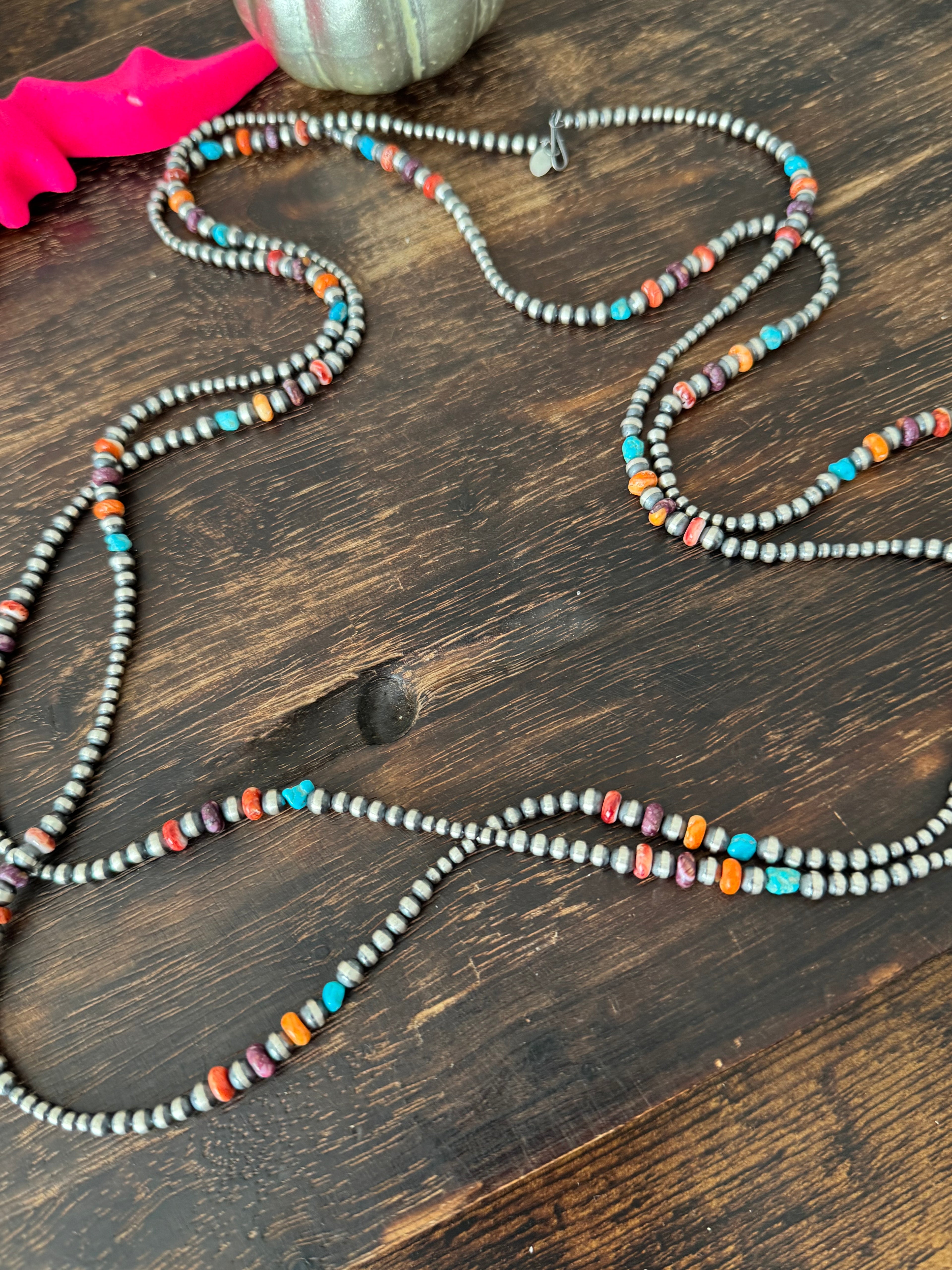 Navajo Strung Multi Stone & Sterling Silver Graduated Pearl Necklace. They measure 72 inches long. Single Stranded Necklace.