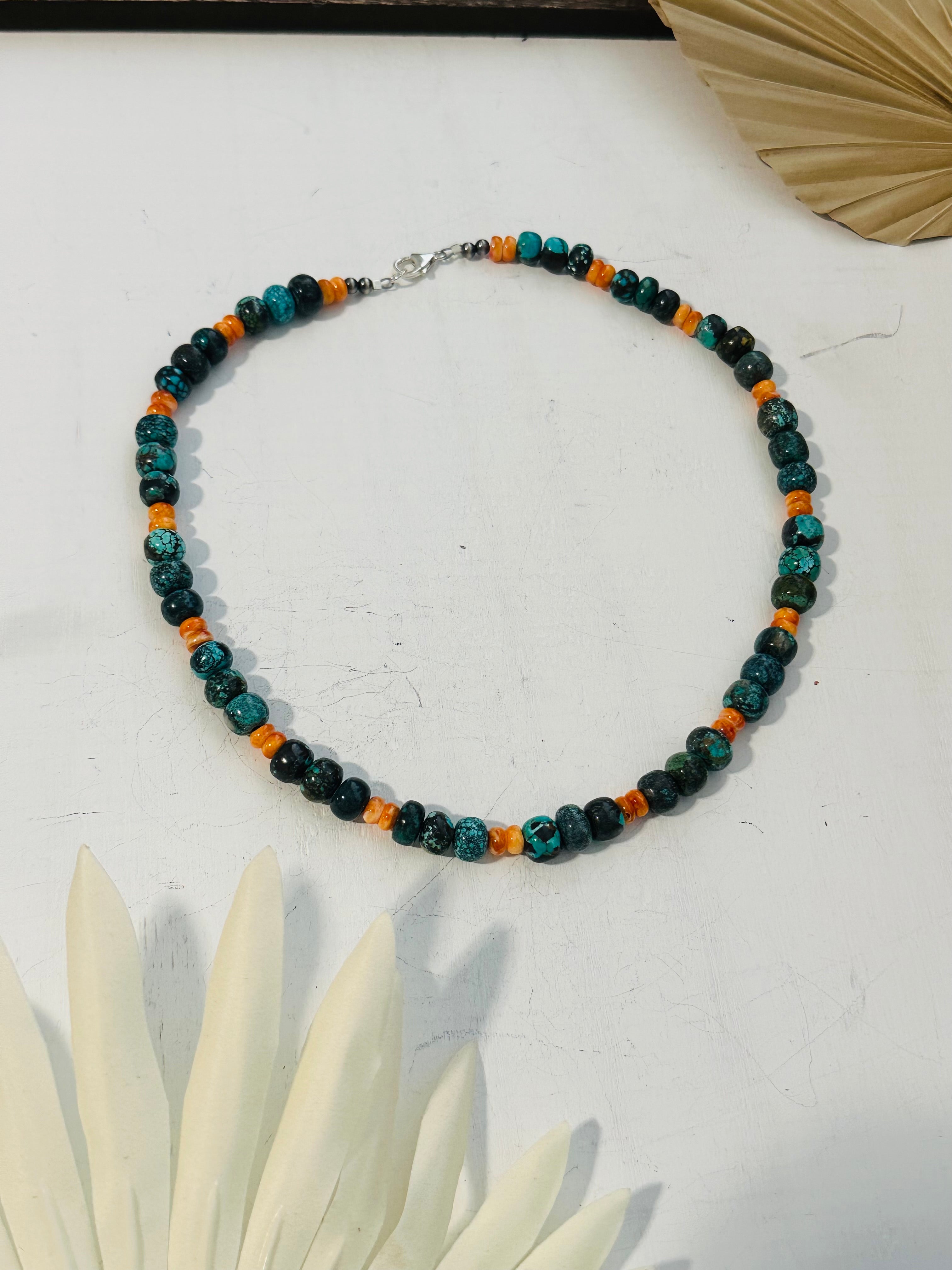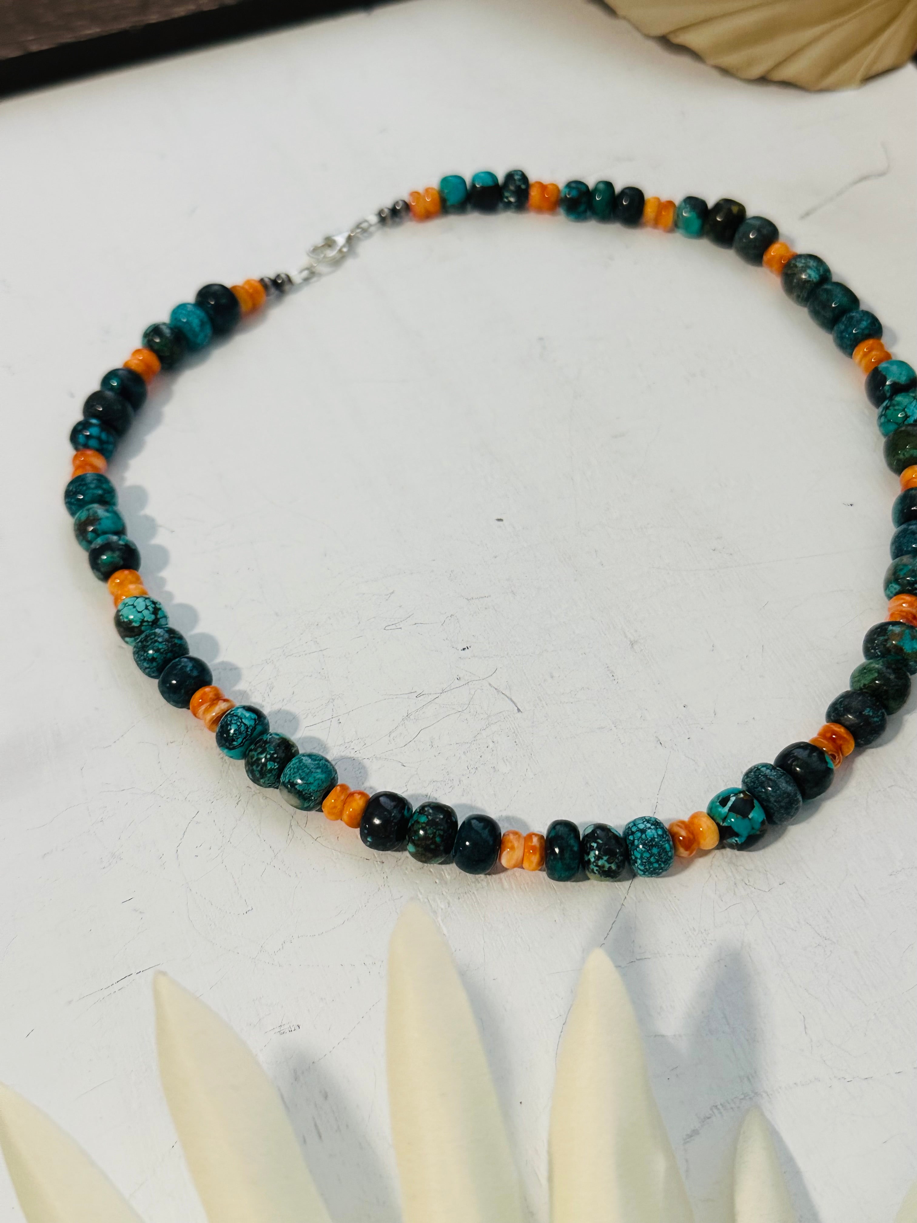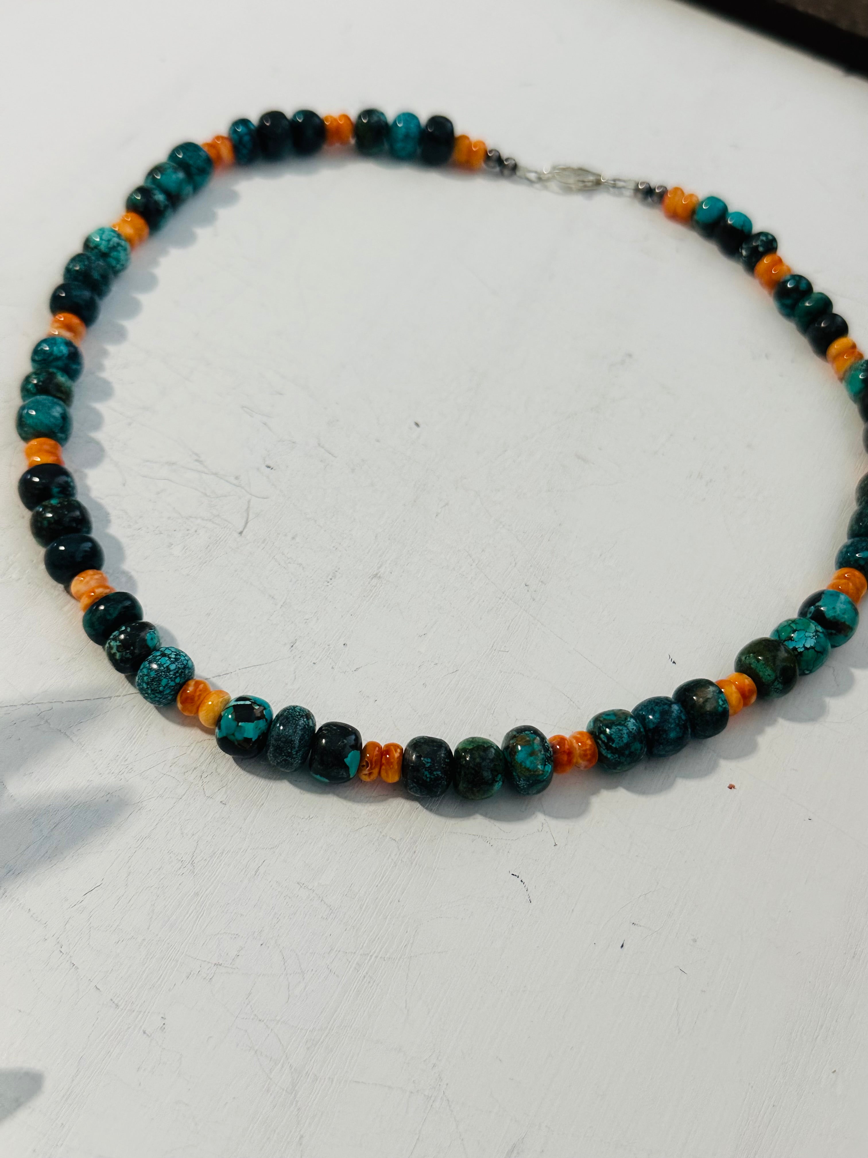 Navajo Strung Kingman Turquoise & Sping Oyster Beaded Necklace. They measure 19 inches long. Single Stranded Necklace.