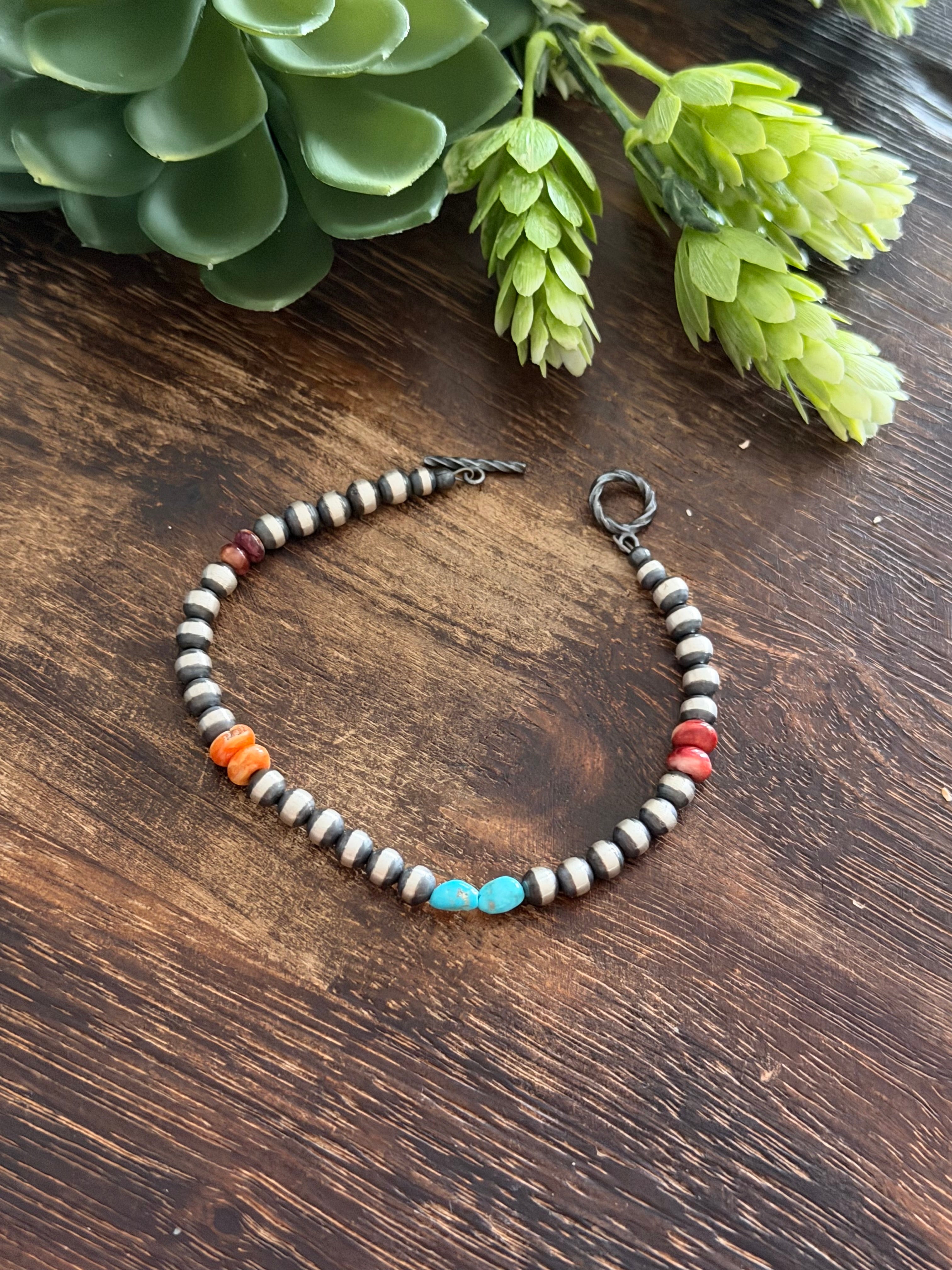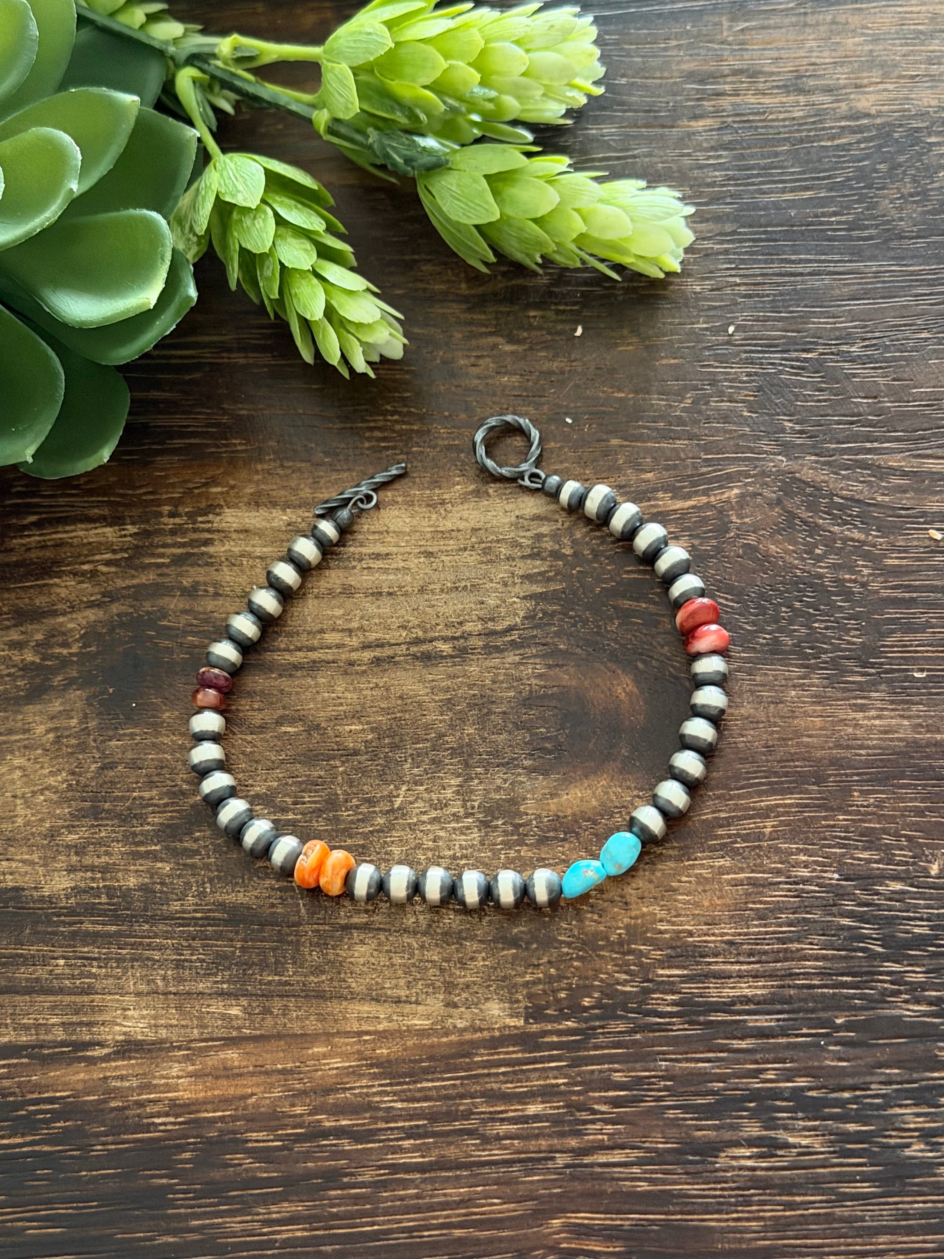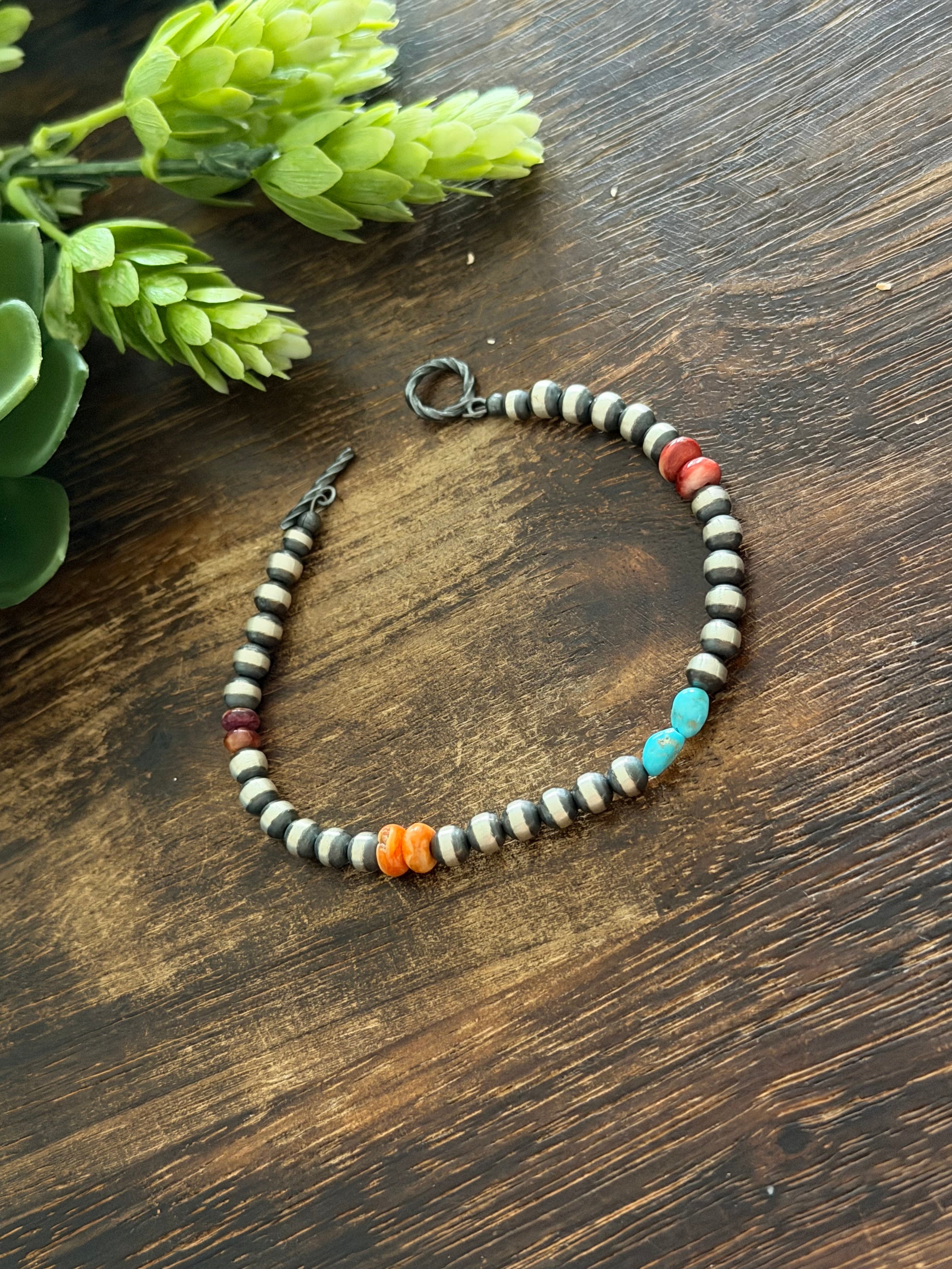 Navajo Strung Multi Stone & Sterling Silver Machine Made Pearl Beaded Bracelet