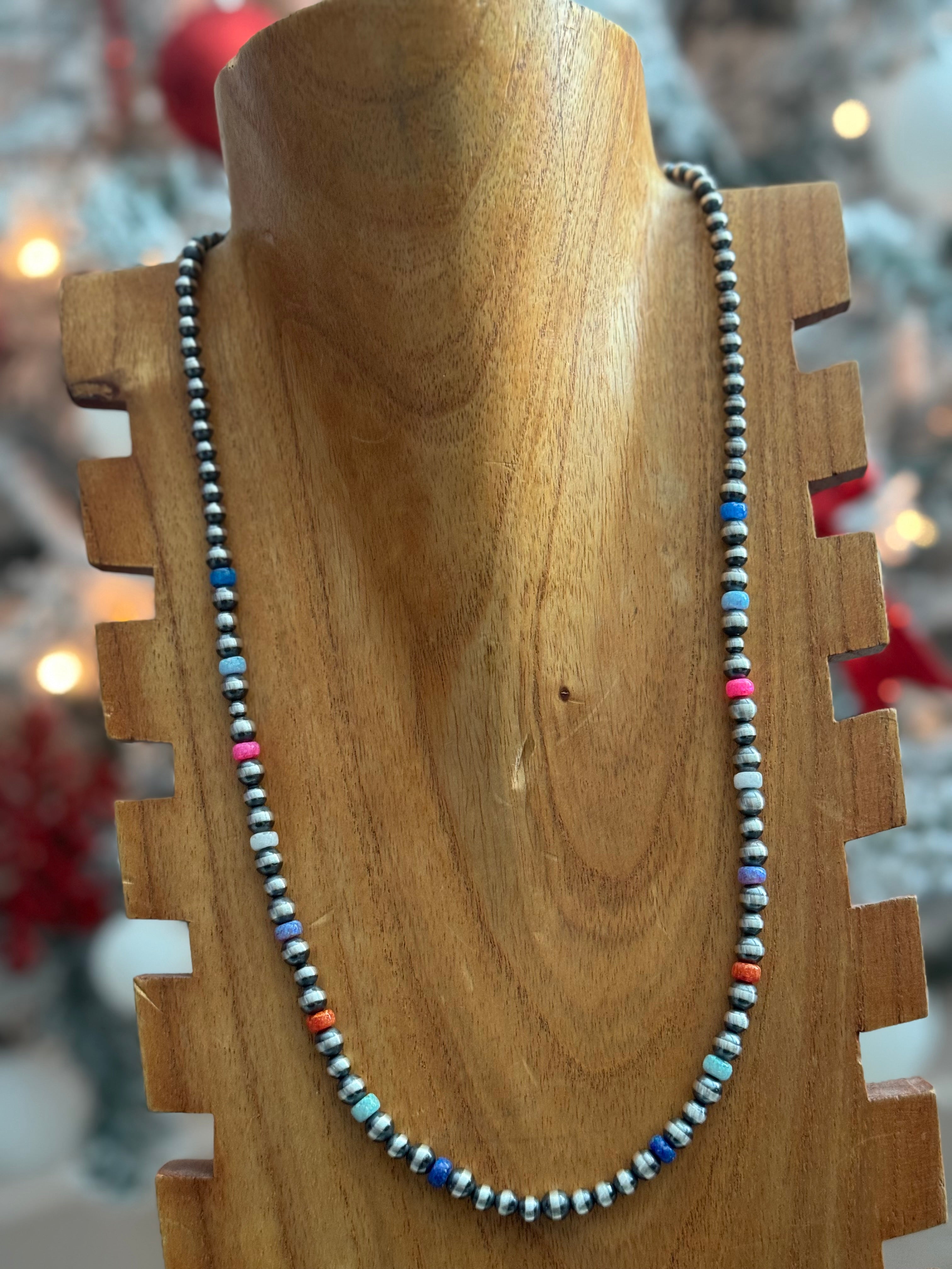 Navajo Strung Opal (Man Made) & Sterling Silver Beaded Pearl Necklace. It measures 24 inches long.