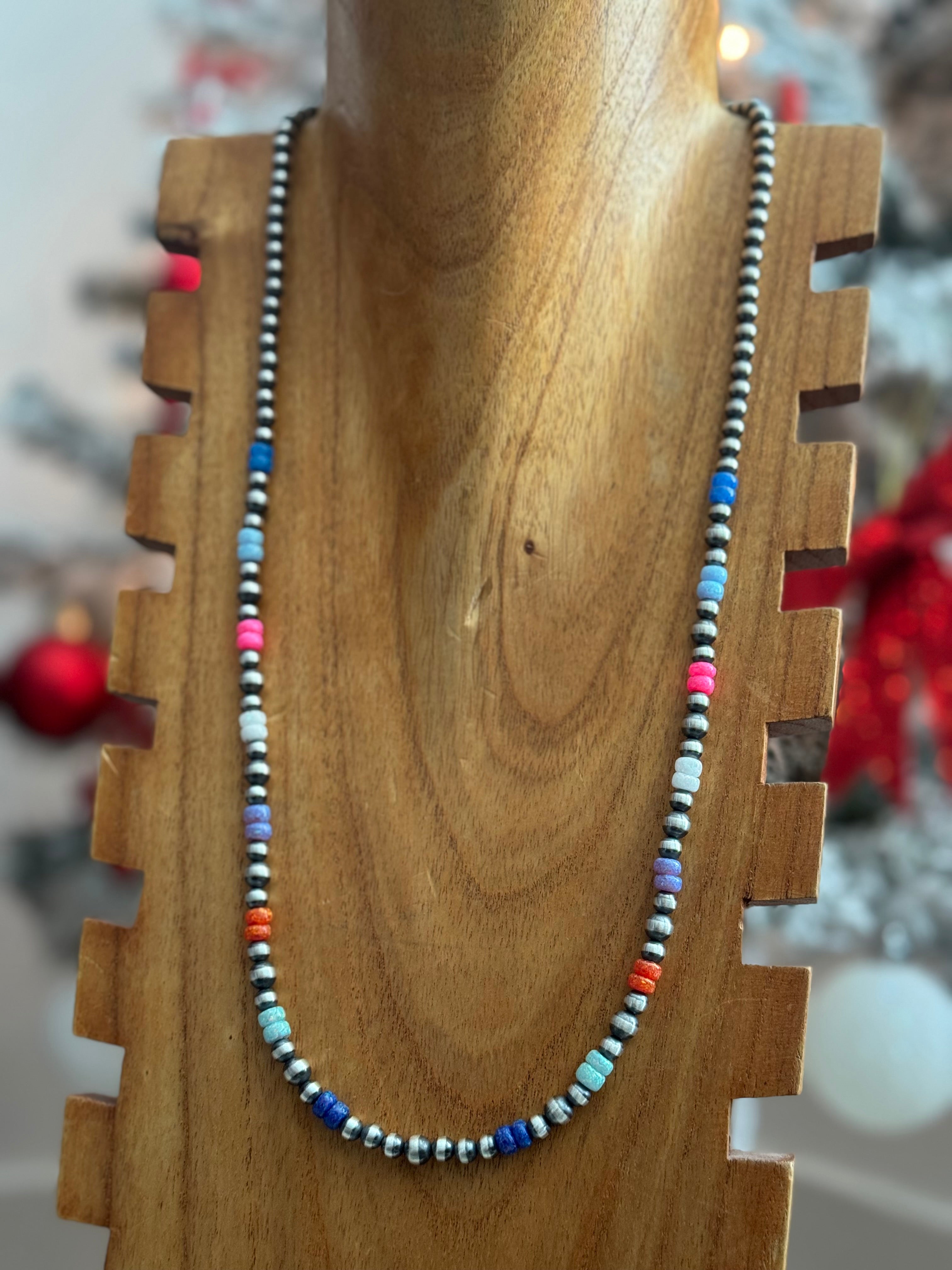 Navajo Strung Opal (Man Made) & Sterling Silver Beaded Pearl Necklace. It measures 26 inches long.