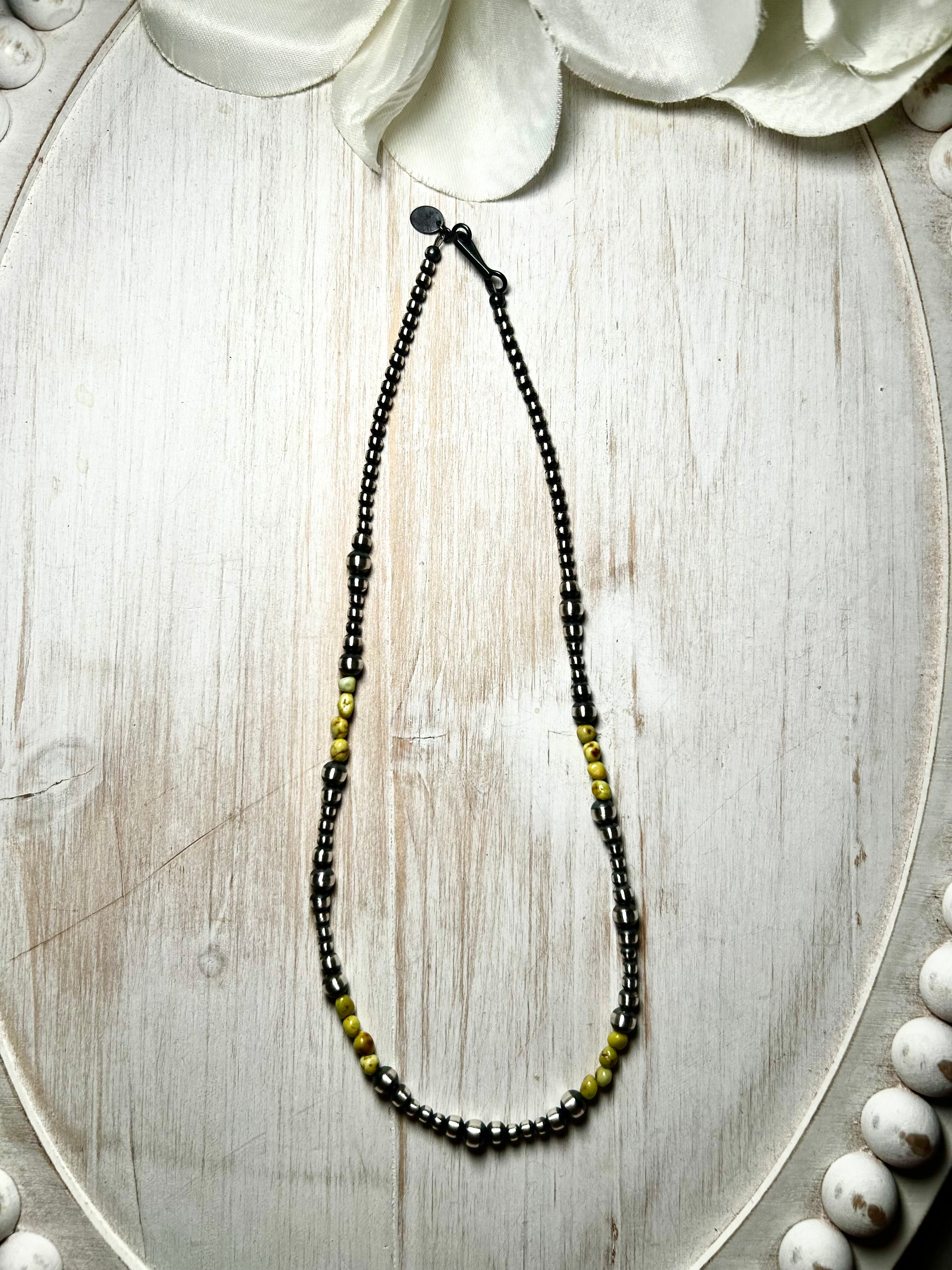 Navajo Strung Palomino Variscite & Sterling Silver Necklace. It measures 16 inches long.