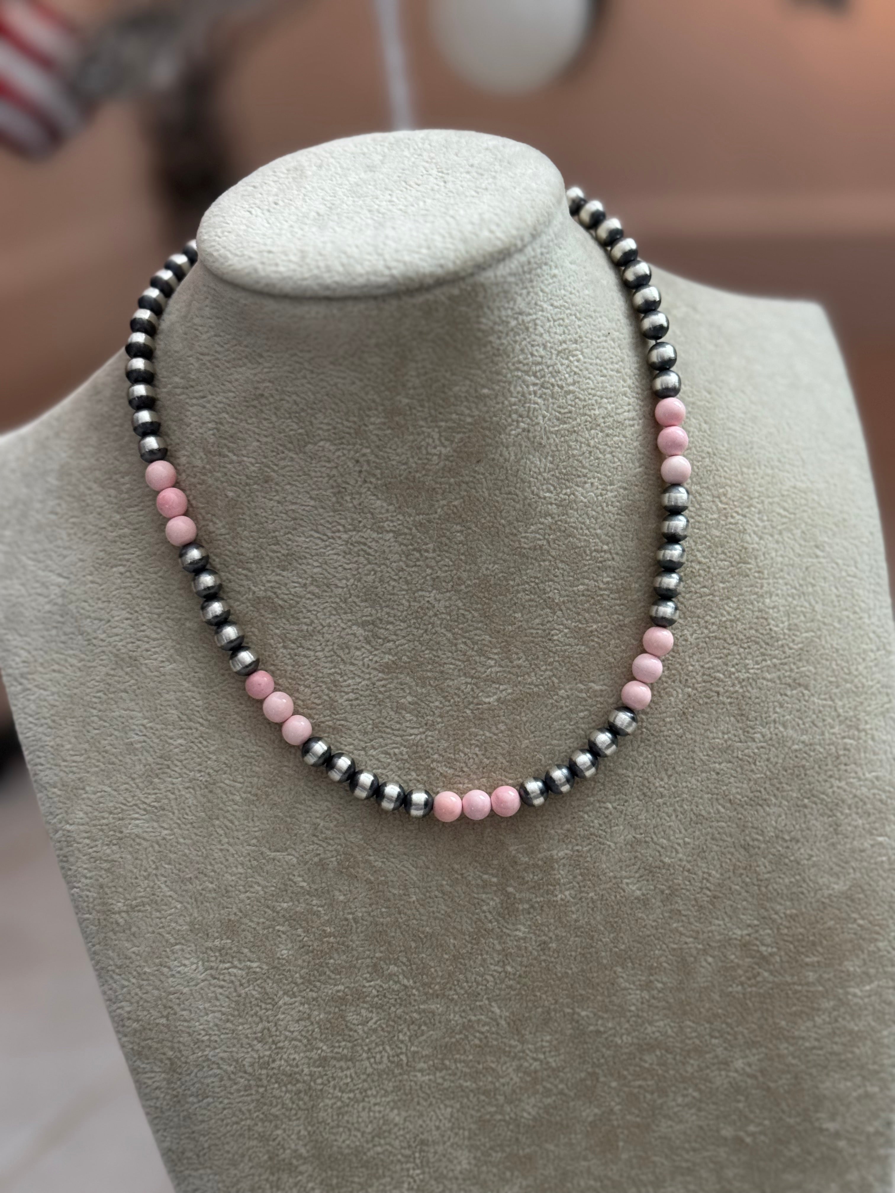 Navajo Strung Pink Conch & Sterling Silver Pearl Necklace. It measures 16 inches long.