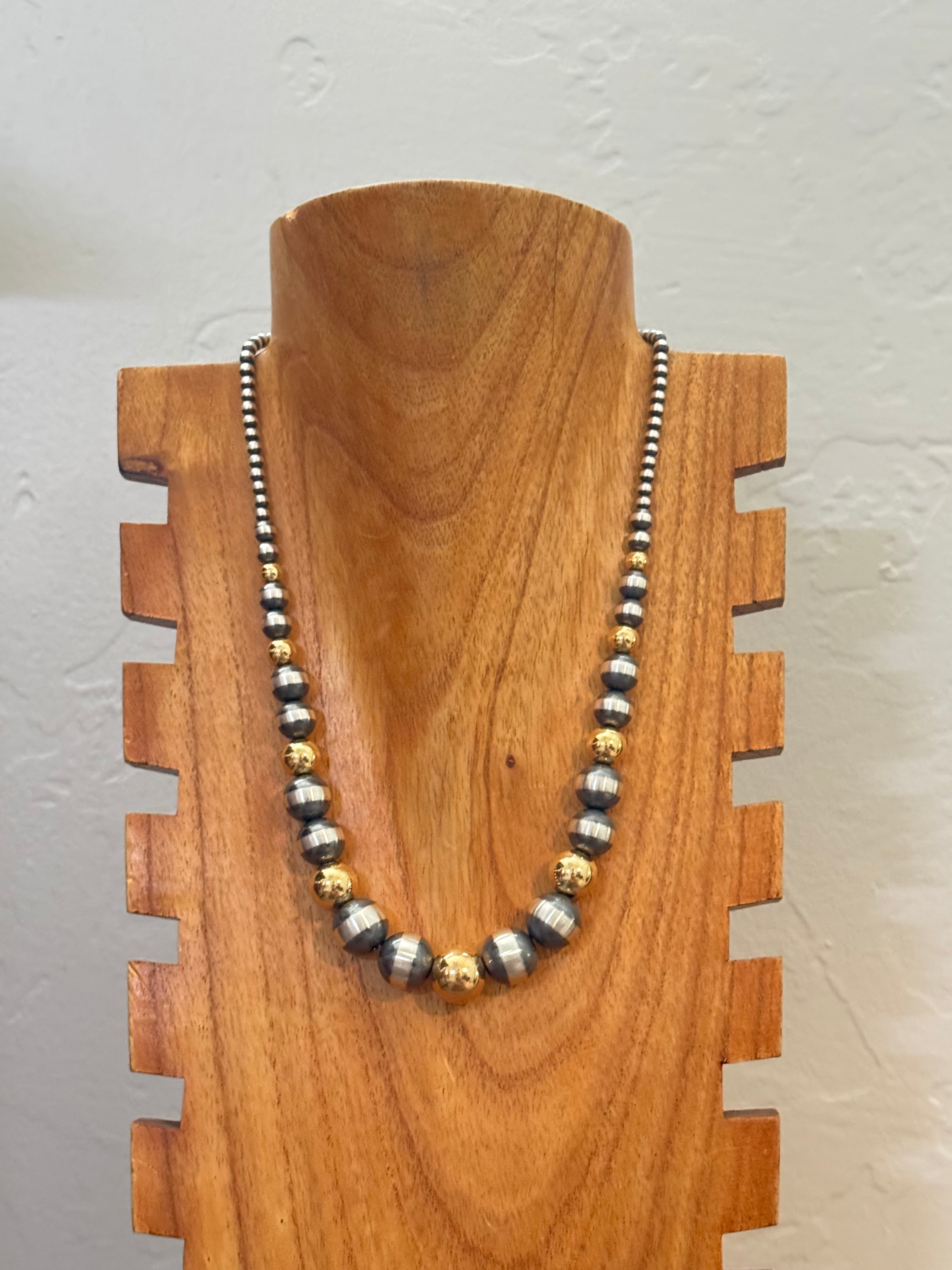 Navajo STRUNG Sterling Silver & 14 kt Gold Plate Graduated Pearl Necklace. 4-14 MM beads. It measures 20 inches long.
