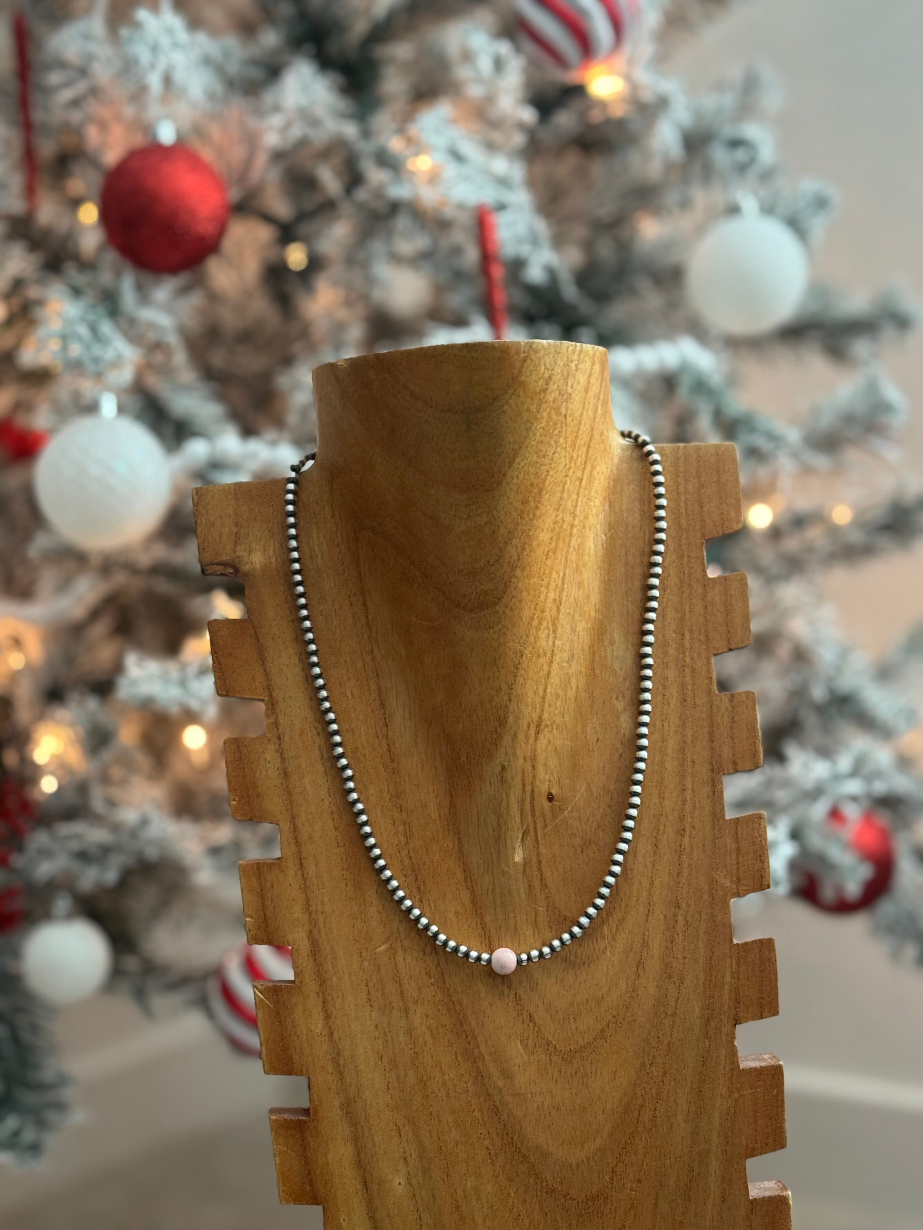 Navajo Strung Pink Conch & Sterling Silver Pearl Necklace. It measures 20 inches long.