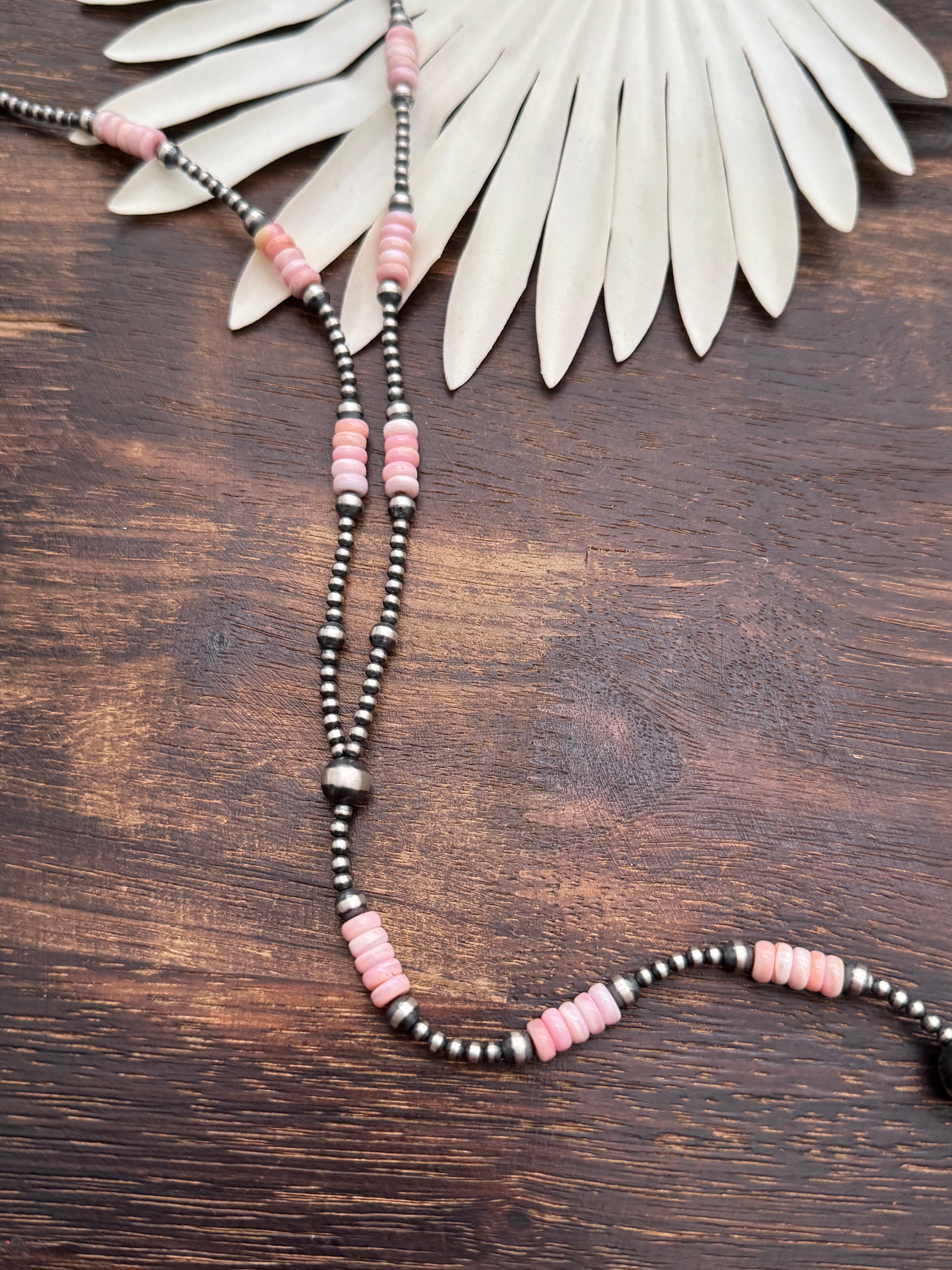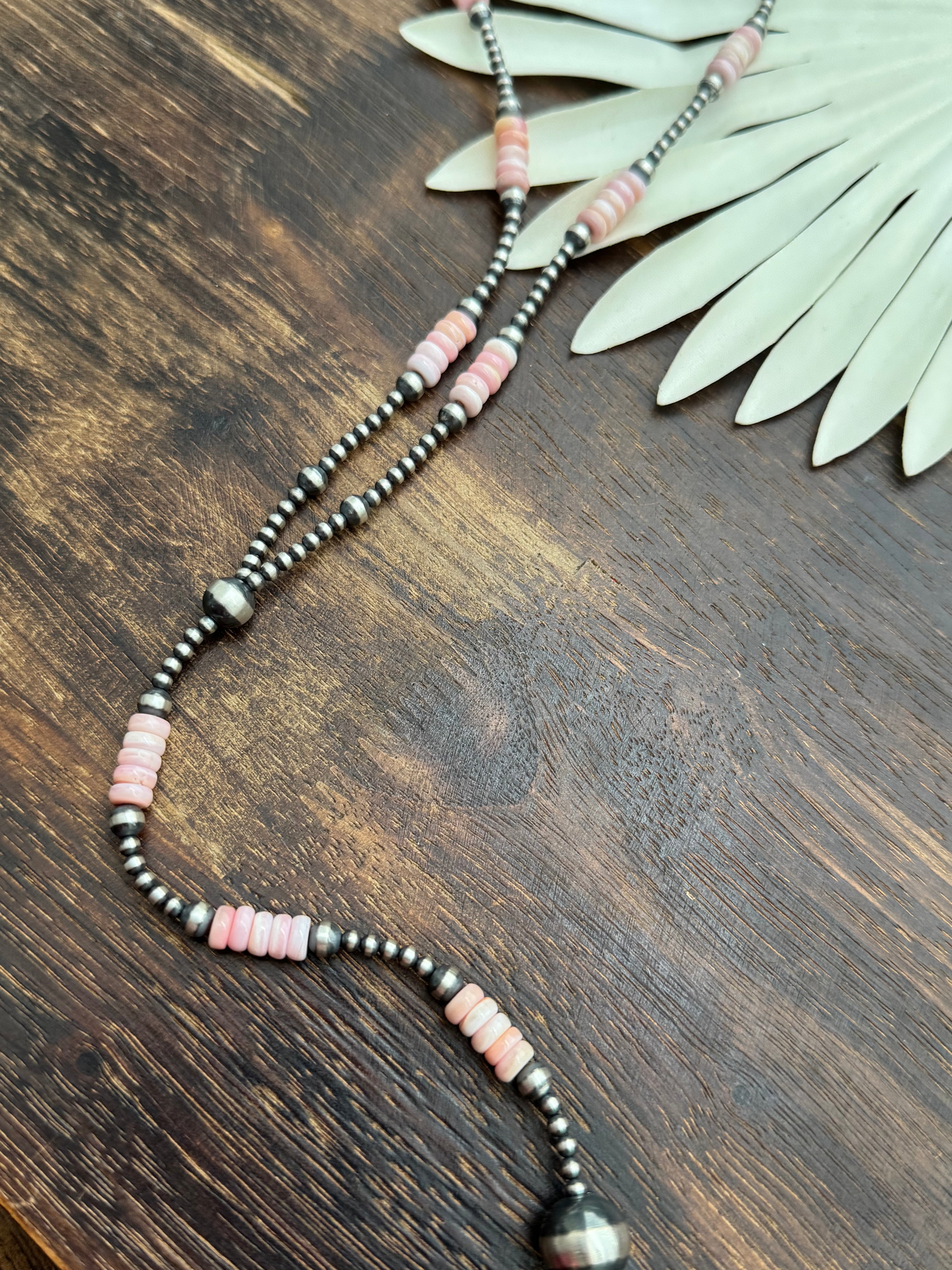 Navajo Strung Pink Conch & Sterling Silver Pearls Beaded Lariat Necklace
