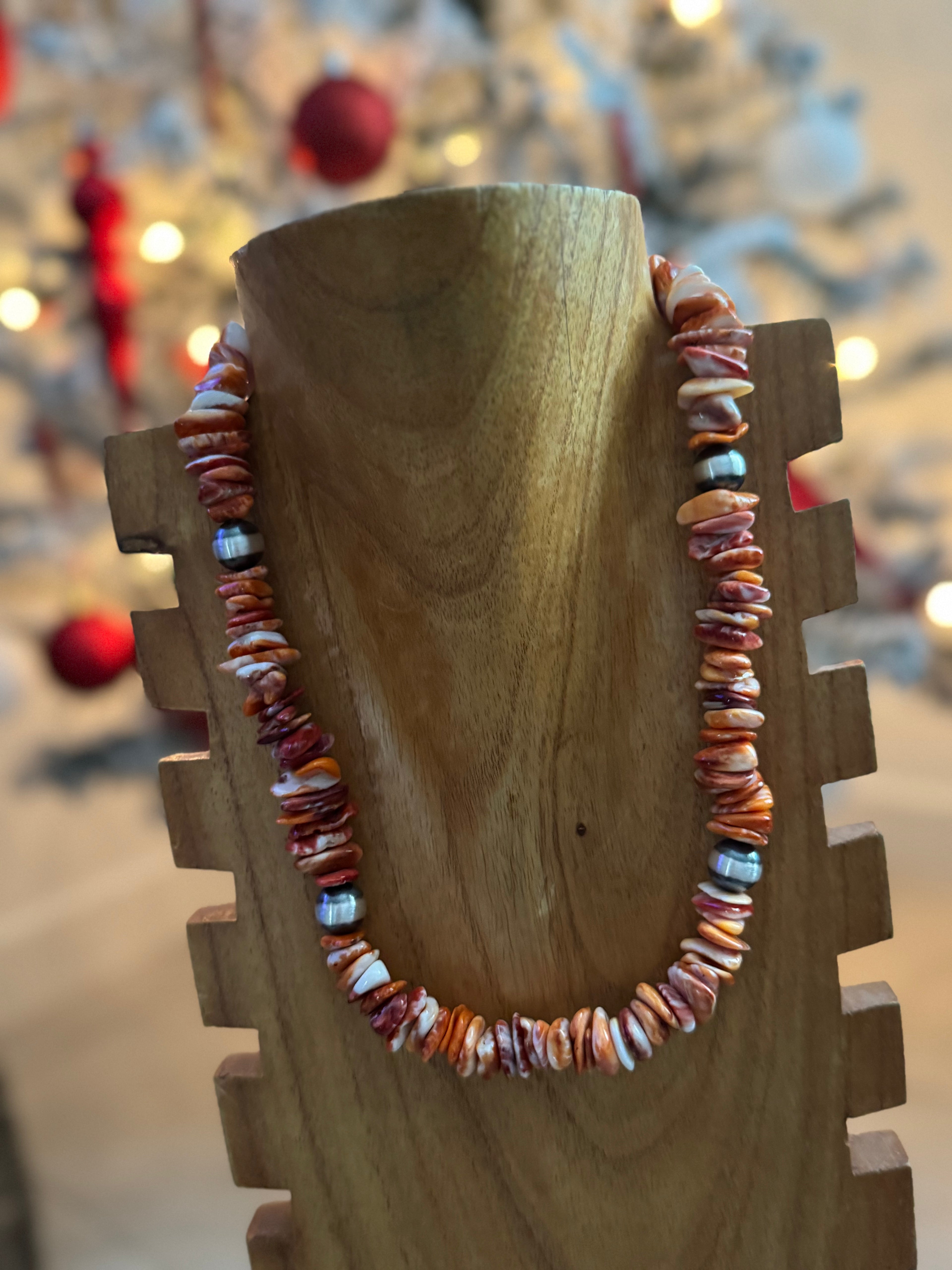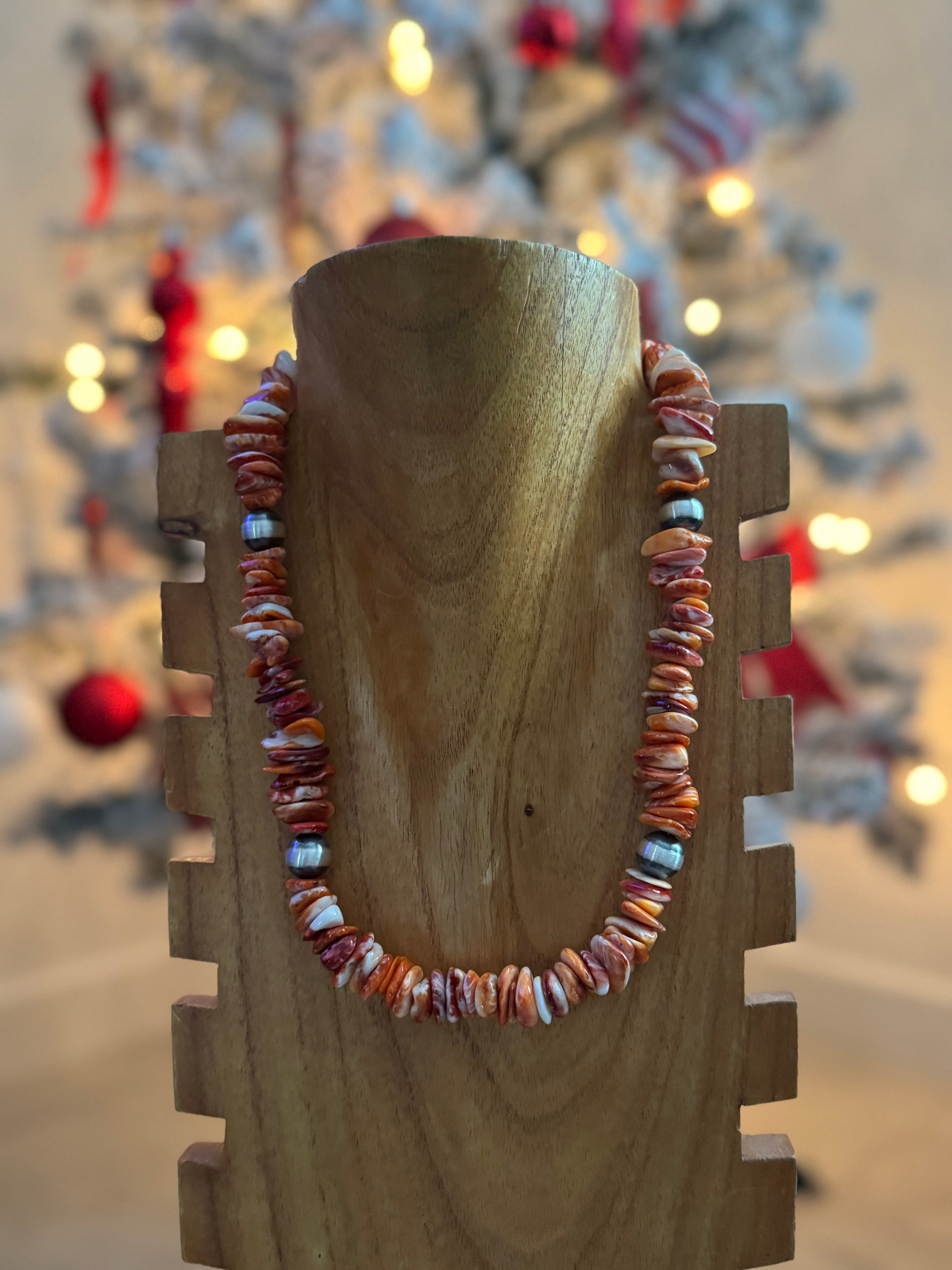 Navajo Strung Red/Orange Spiny Oyster & Sterling Silver Pearl Necklace. Measures 19-20 1/2 inches long.
