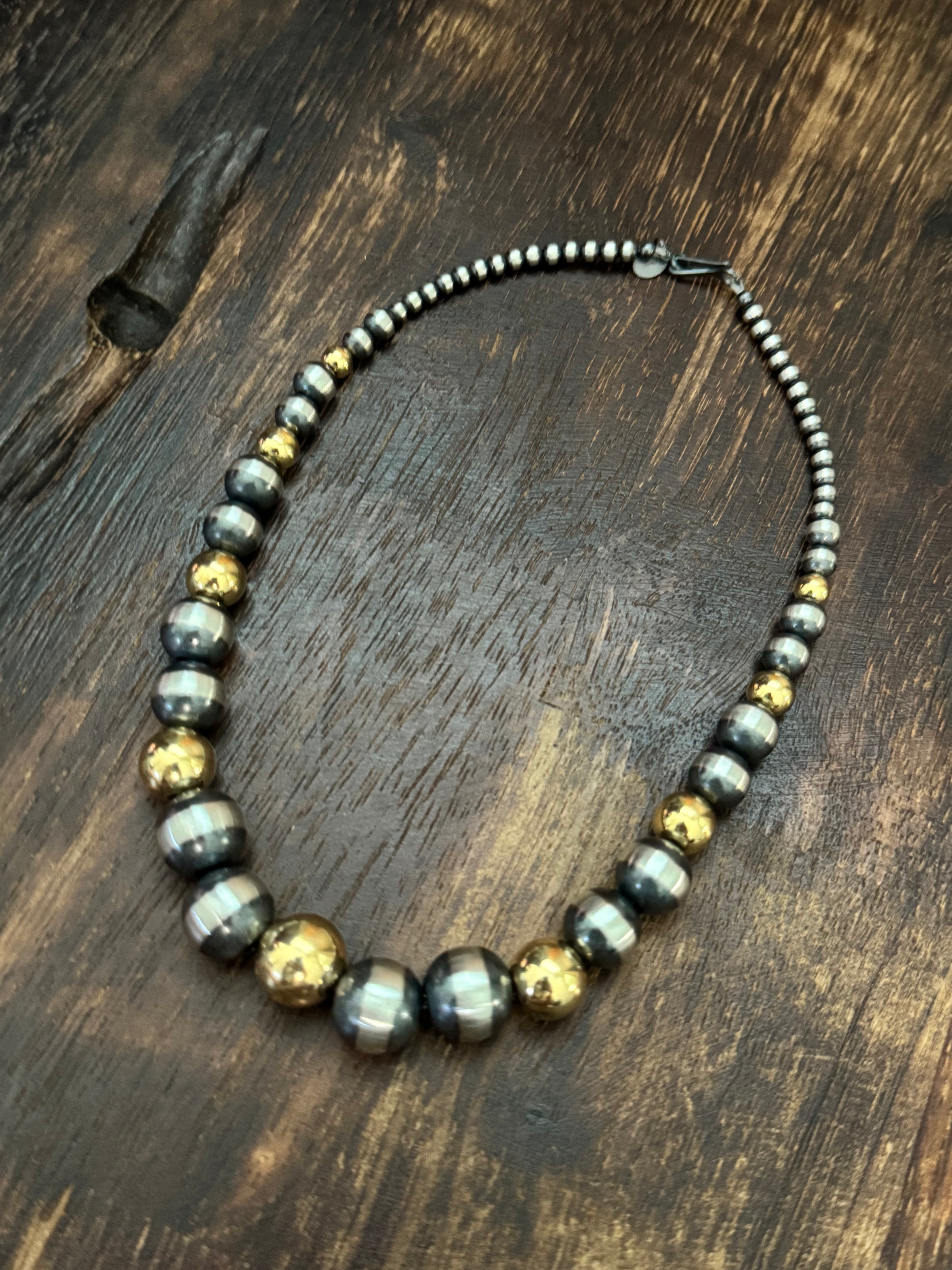 Navajo STRUNG Sterling Silver & 14 kt Gold Plate Graduated Pearl Necklace. 4-14 MM beads. It measures 16 inches long.