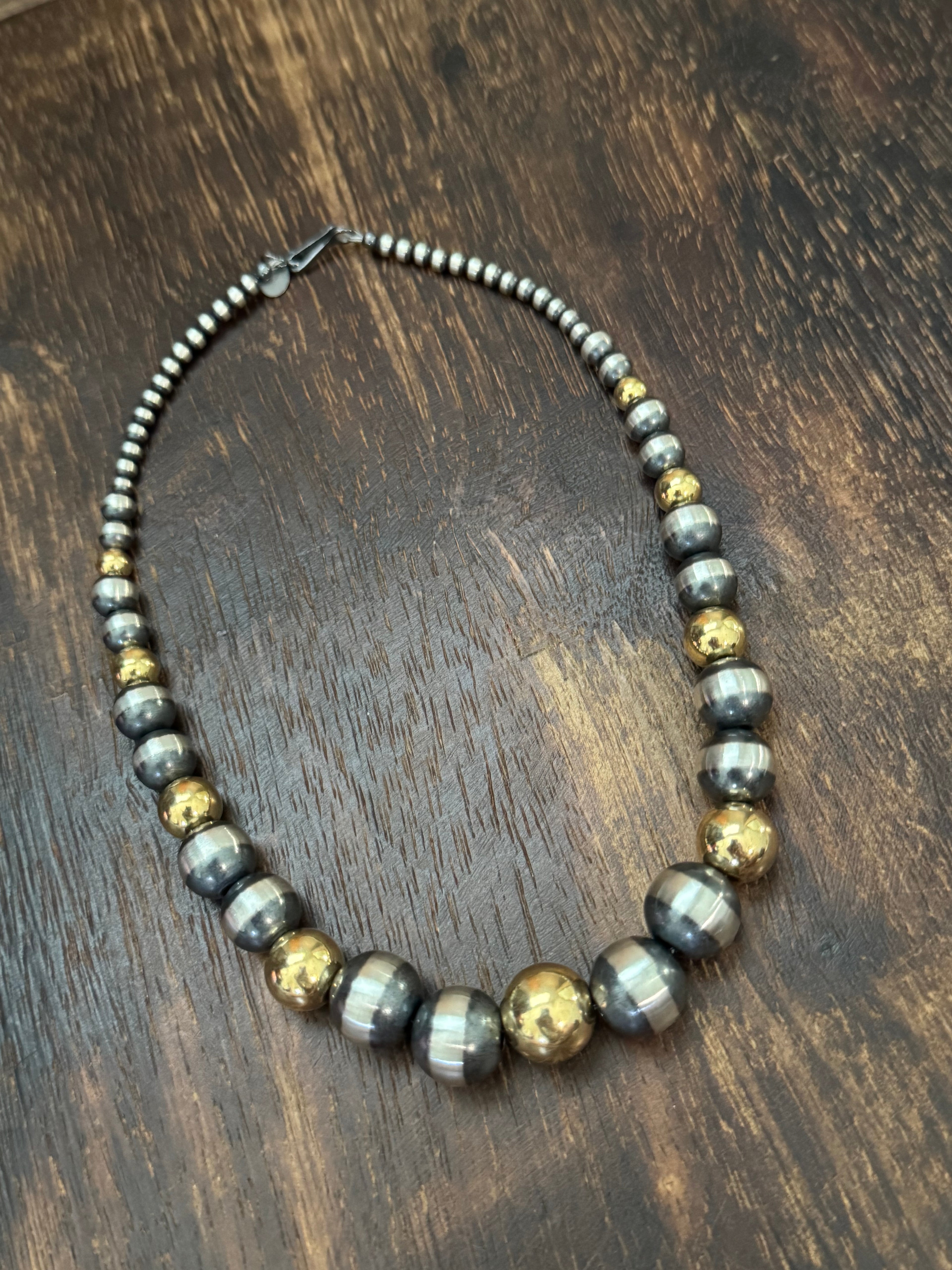 Navajo STRUNG Sterling Silver & 14 kt Gold Plate Graduated Pearl Necklace. 4-14 MM beads. It measures 18 inches long.