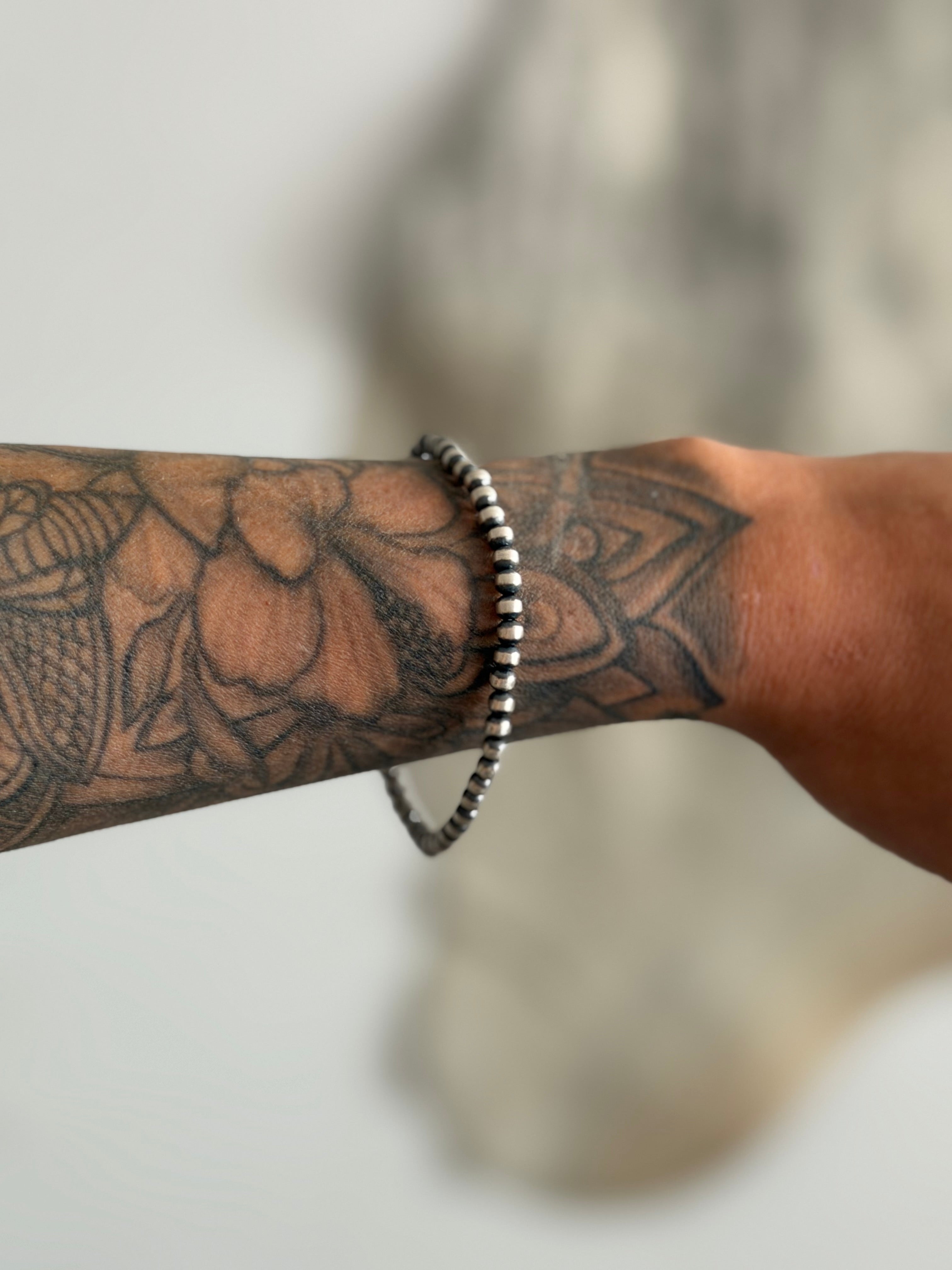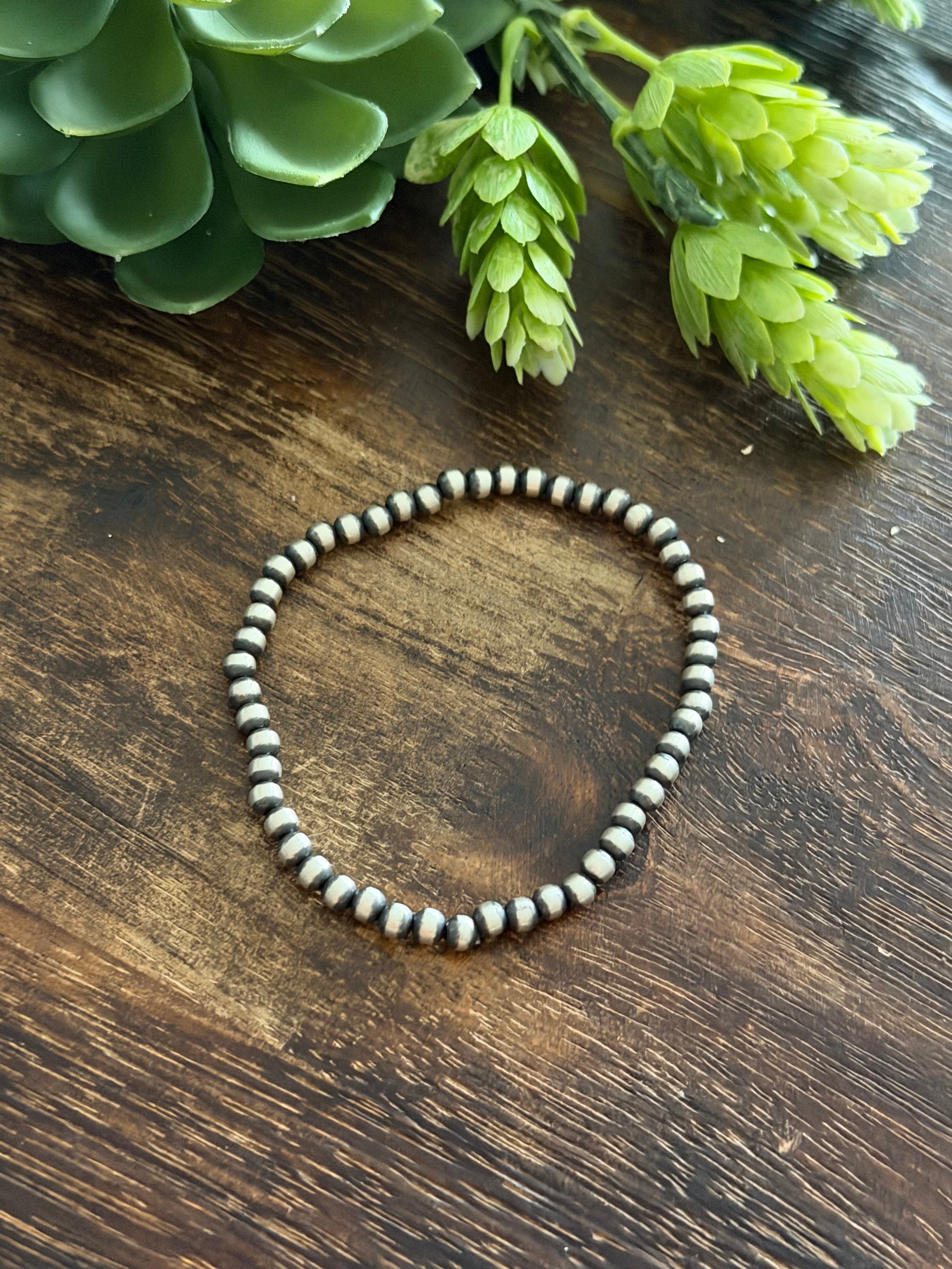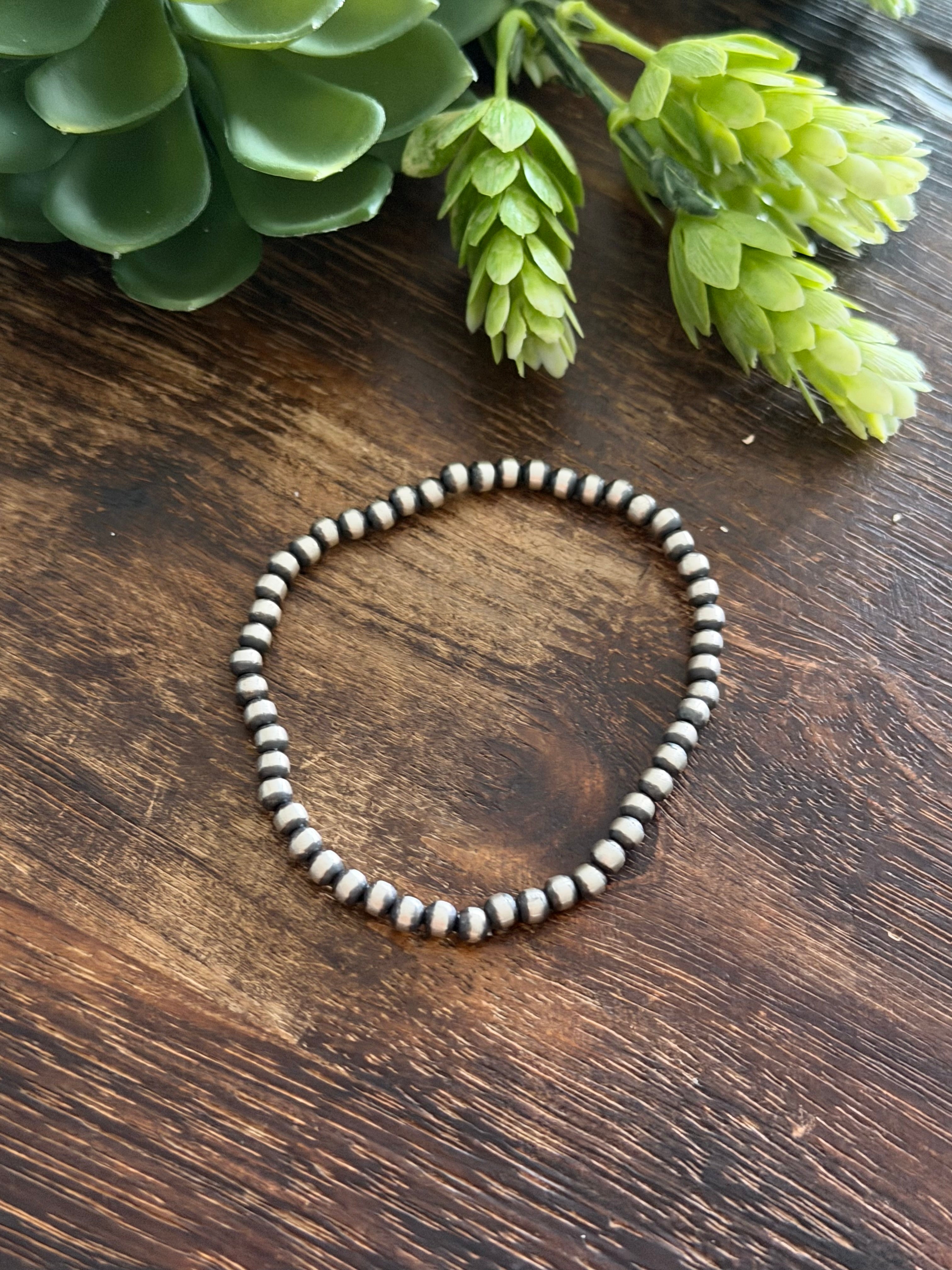 Navajo Strung Sterling Silver 4 MM Machine Made Pearl Stretch Bracelet. They measure 6 inches inside circumference. Very stretchy