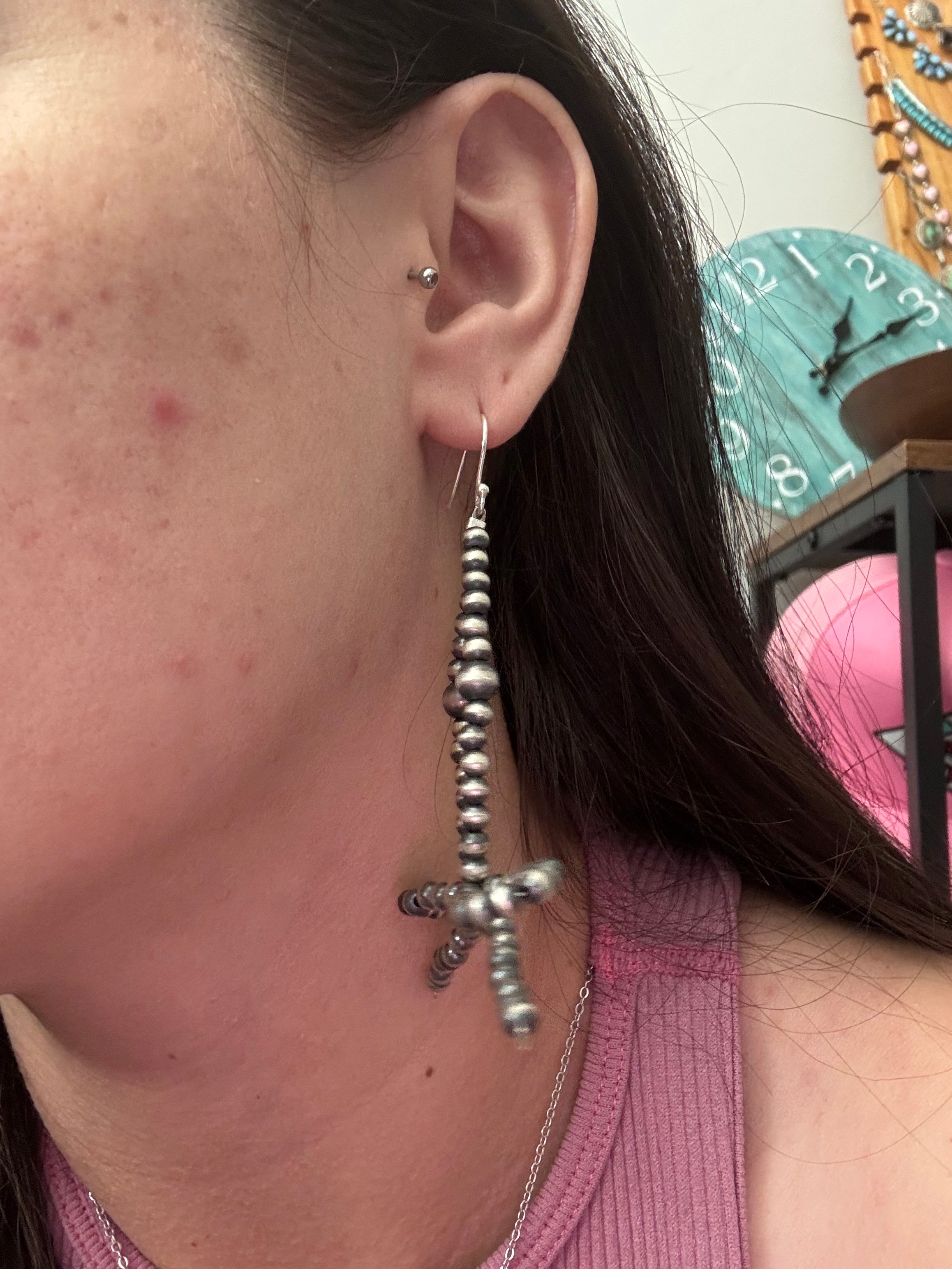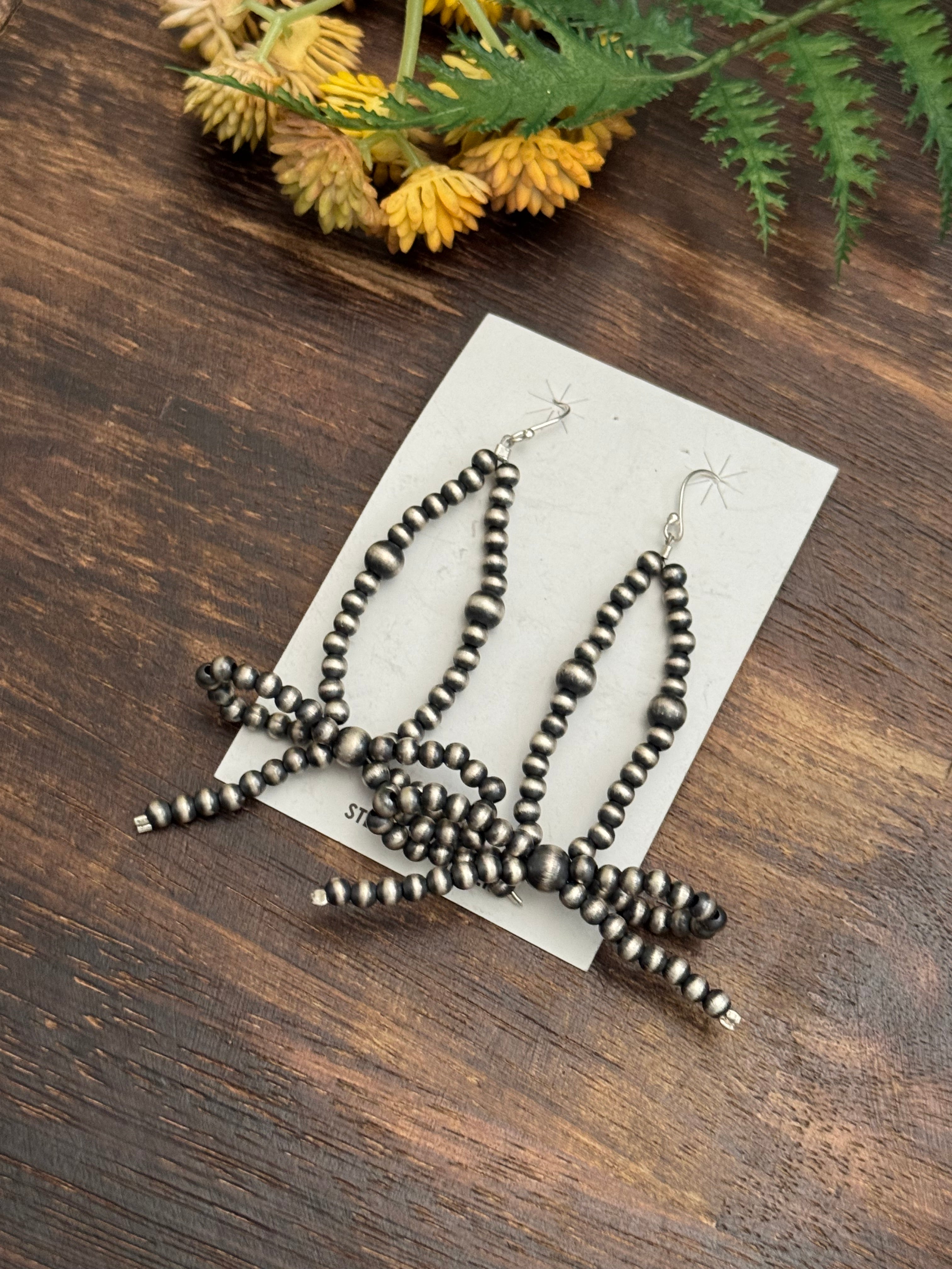 Have a spice in your everyday. Navajo Strung Sterling Silver Graduated Pearls Dangle Bow Earrings. It measures 3 1/8 inches long.