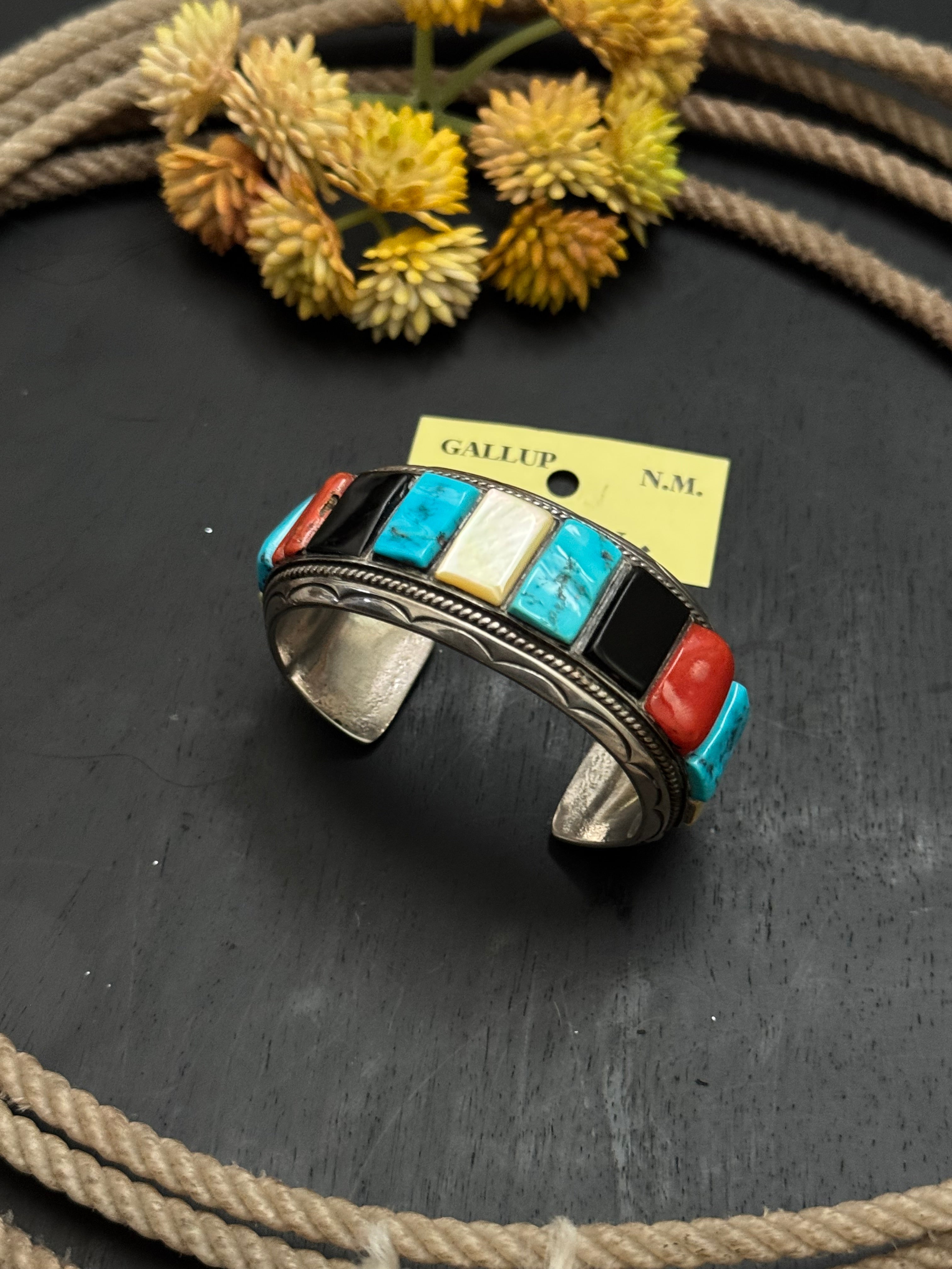 OLD PAWN Navajo Made Multi Stone & Sterling Silver Cuff Bracelet. It measures 7/8 of an inch wide with an inside circumference of 4 5/8 inches and a gap of 1 inch. Signed by the artist and stamped sterling silver.