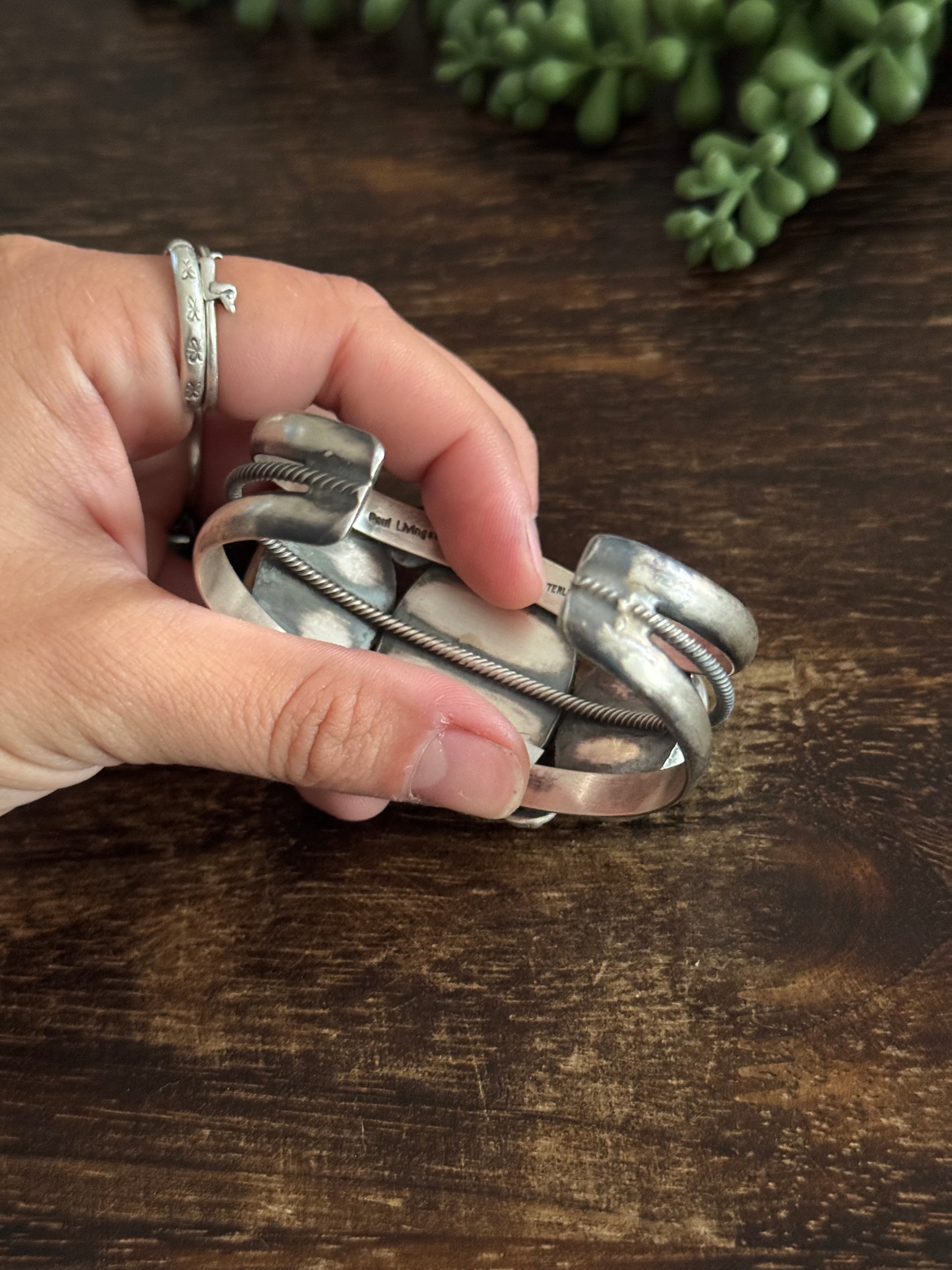 Paul Livingston Mixed Turquoise & Sterling Silver Cuff Bracelet. It measures 1 3/8 inches wide with an inside circumference 5 3/4 inches and a gap just under 1 inch. Signed by the artist and stamped sterling silver.