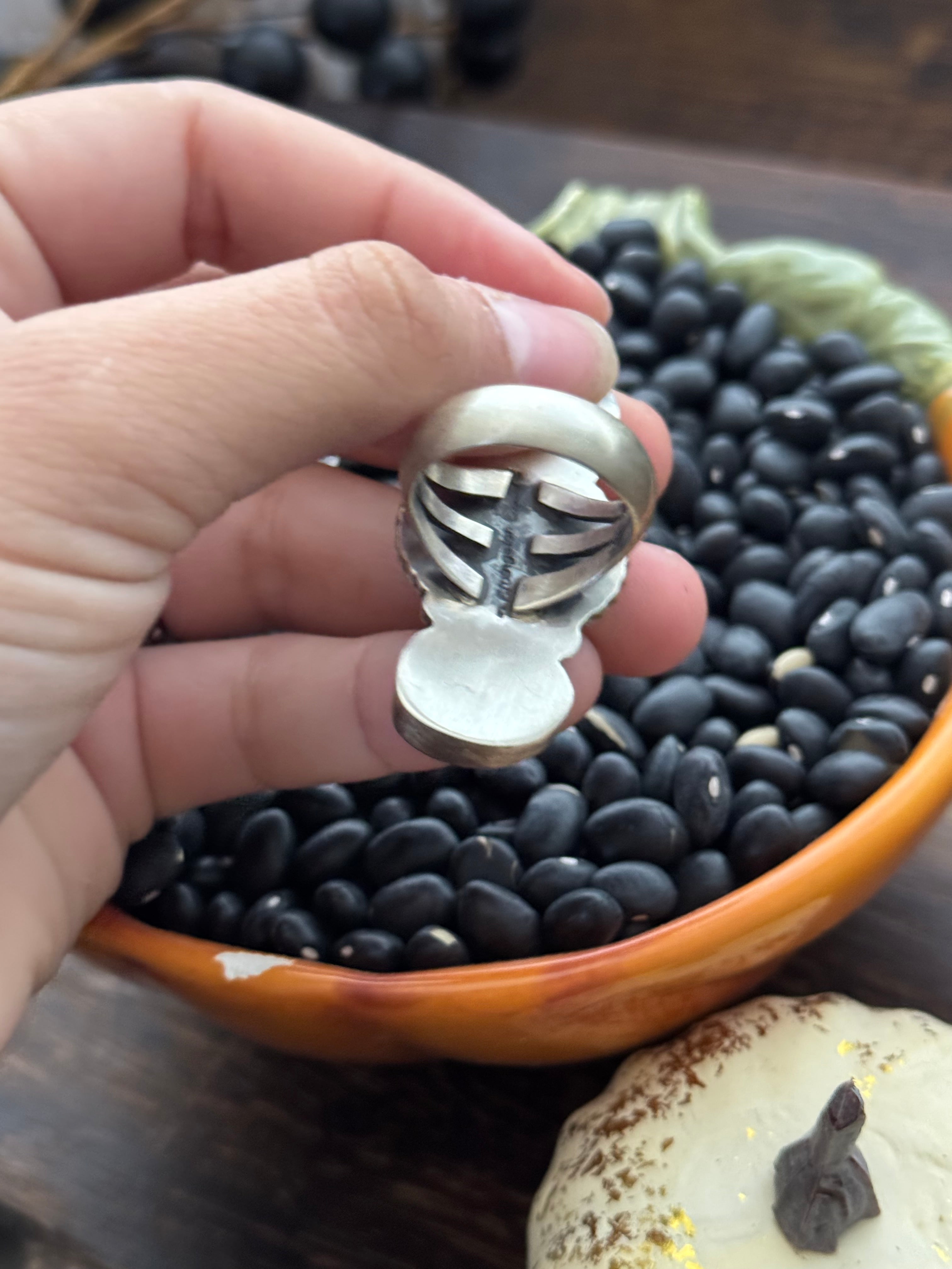 Paul Livingston Valley Blue Turquoise & Sterling Silver Ring Size 8.25. It measures 1 1/2 inches long and 7/8 of an inche wide. Signed by the artist and stamped sterling silver.