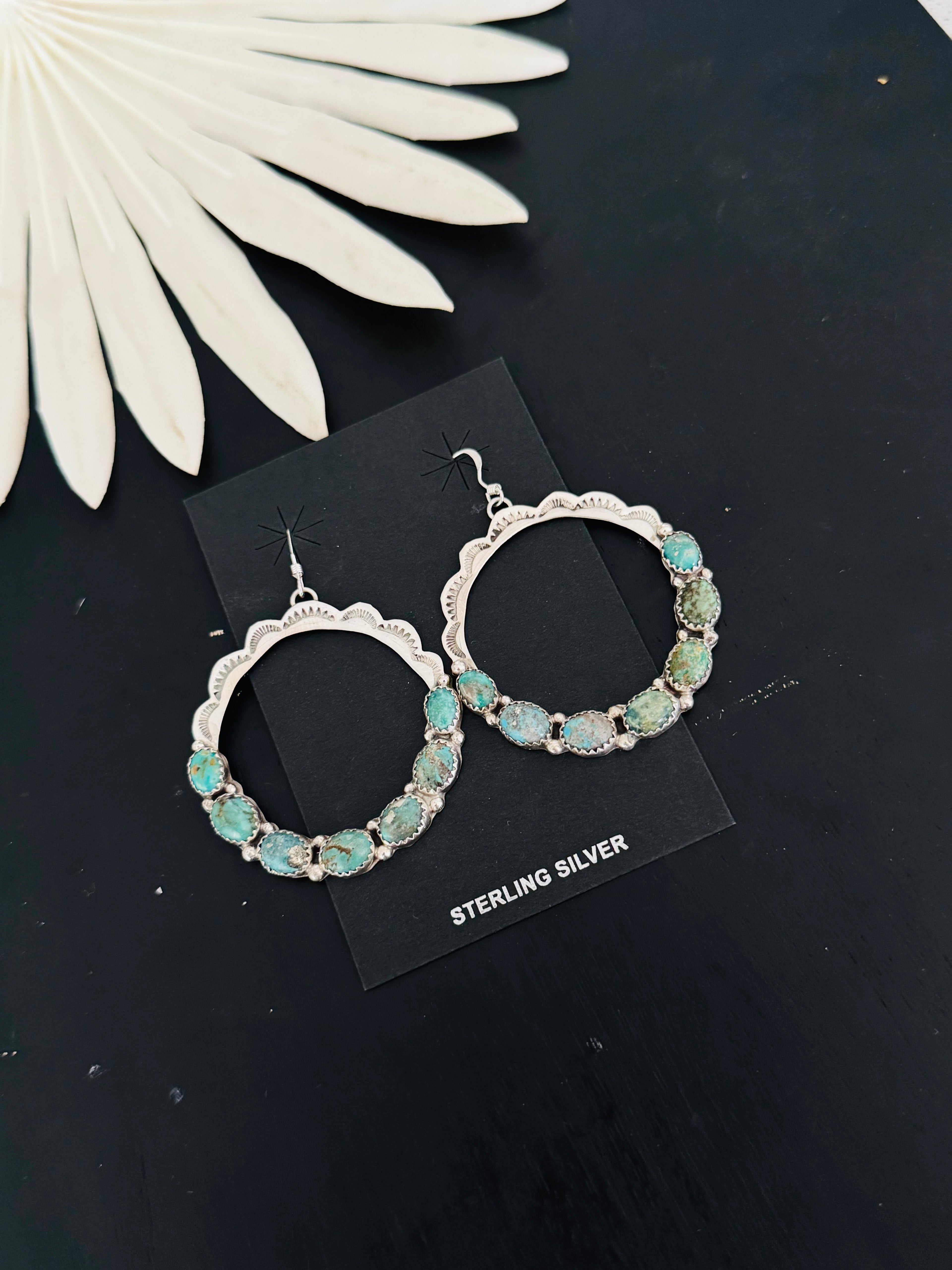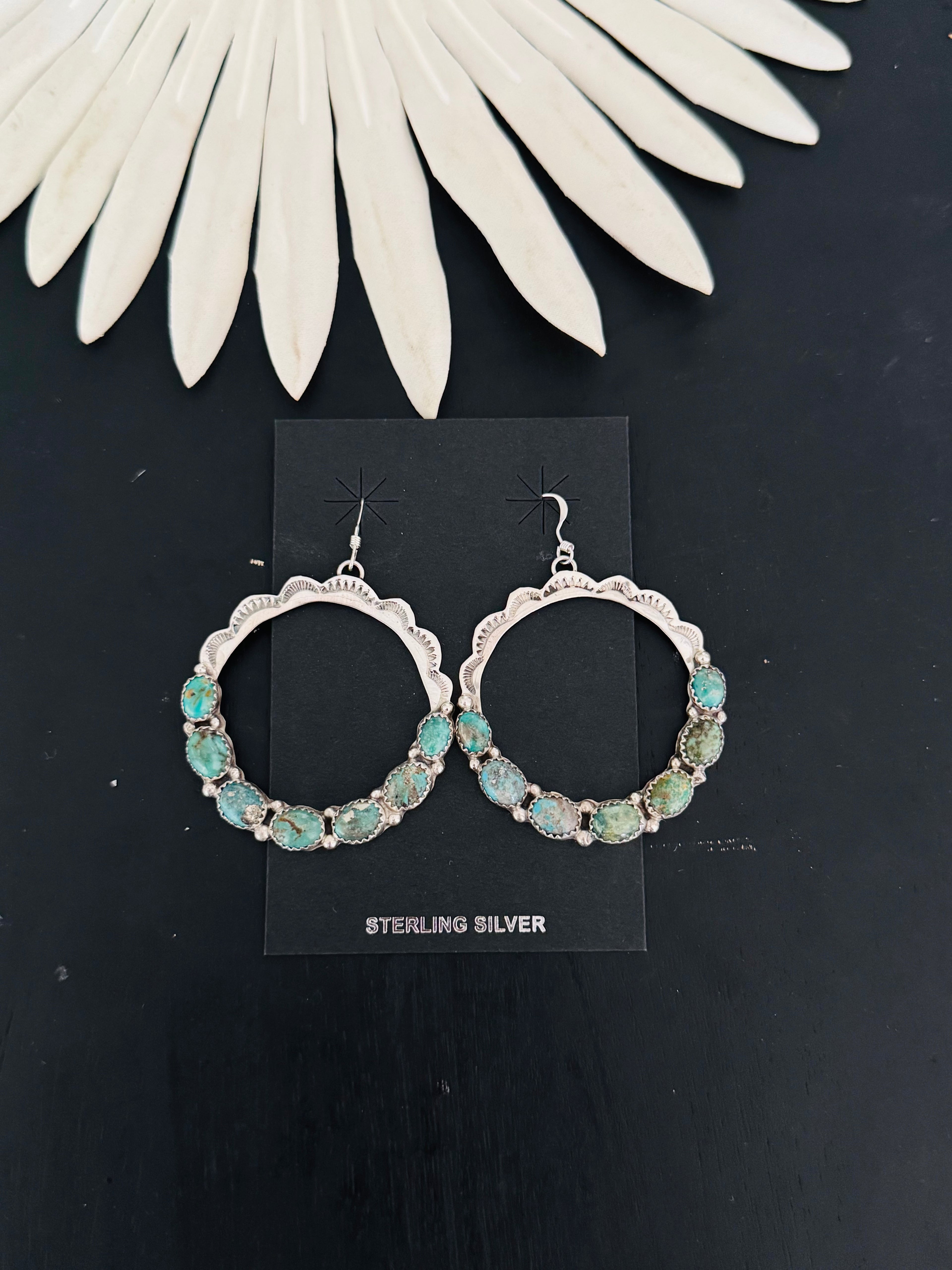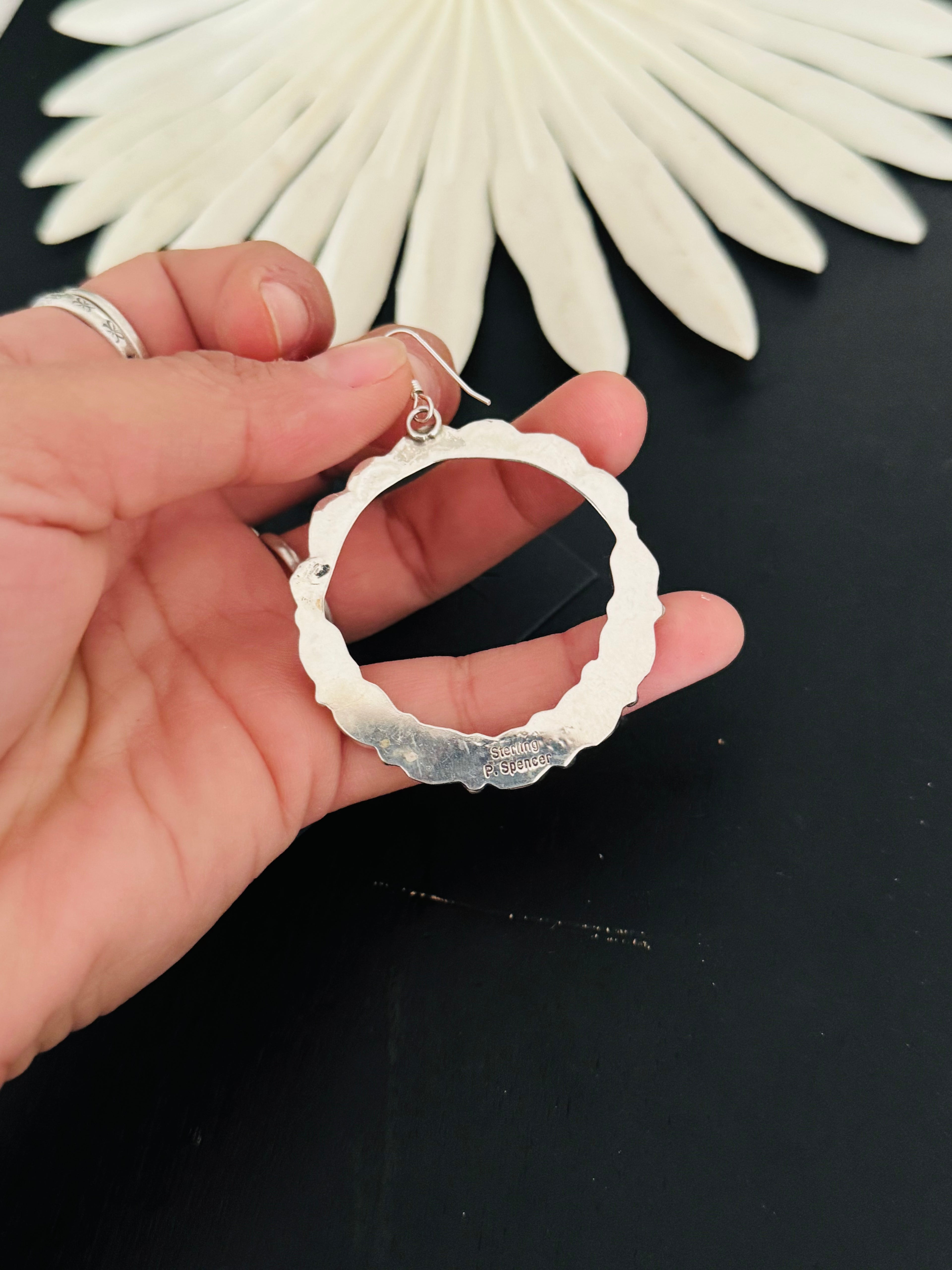 Pearline Spencer Kingman Turquoise & Sterling Silver Dangle Hoop Earrings. They measure 2 3/8 inches long and just under 1 1/4 inches wide. Signed and stamped.