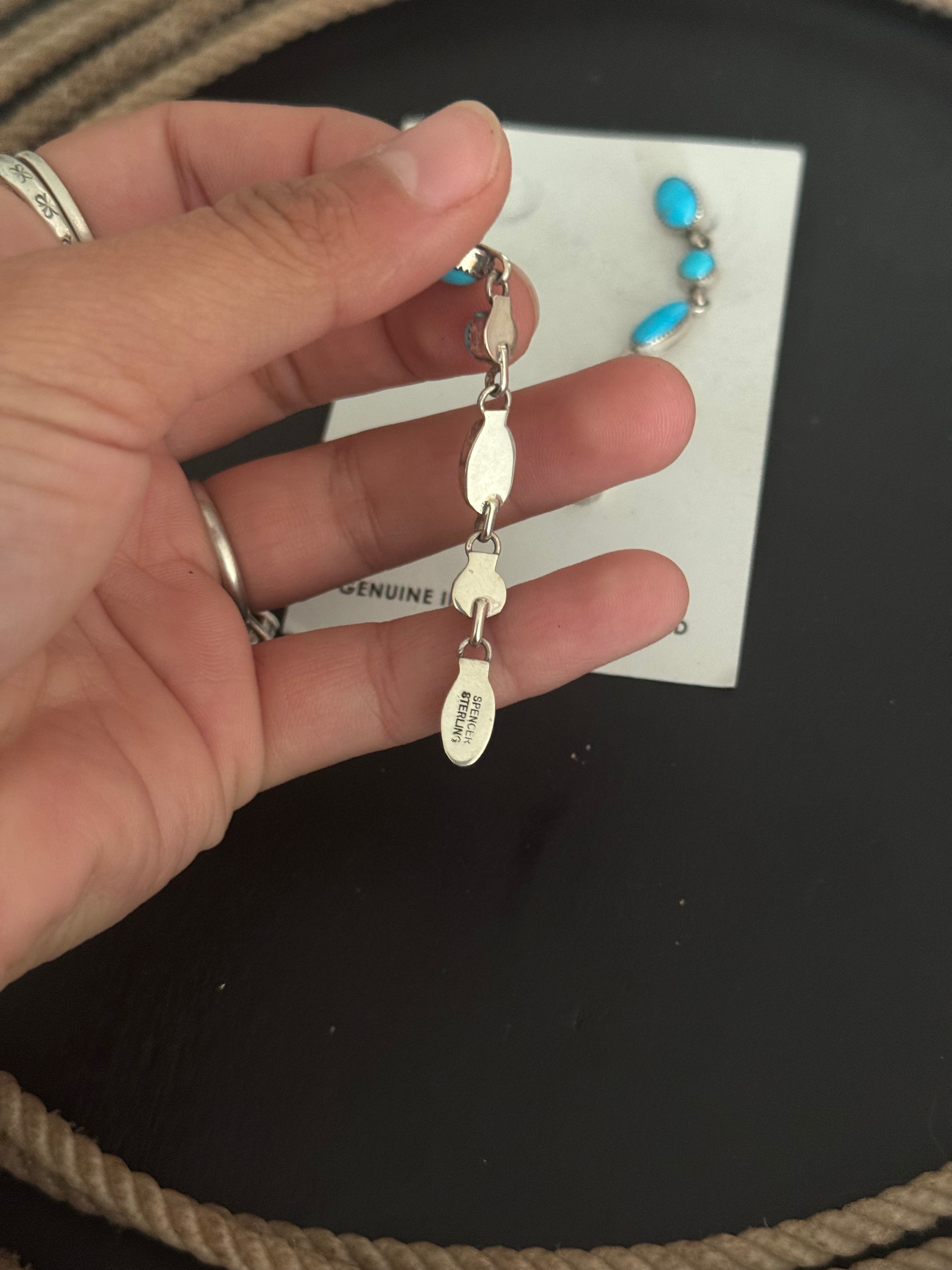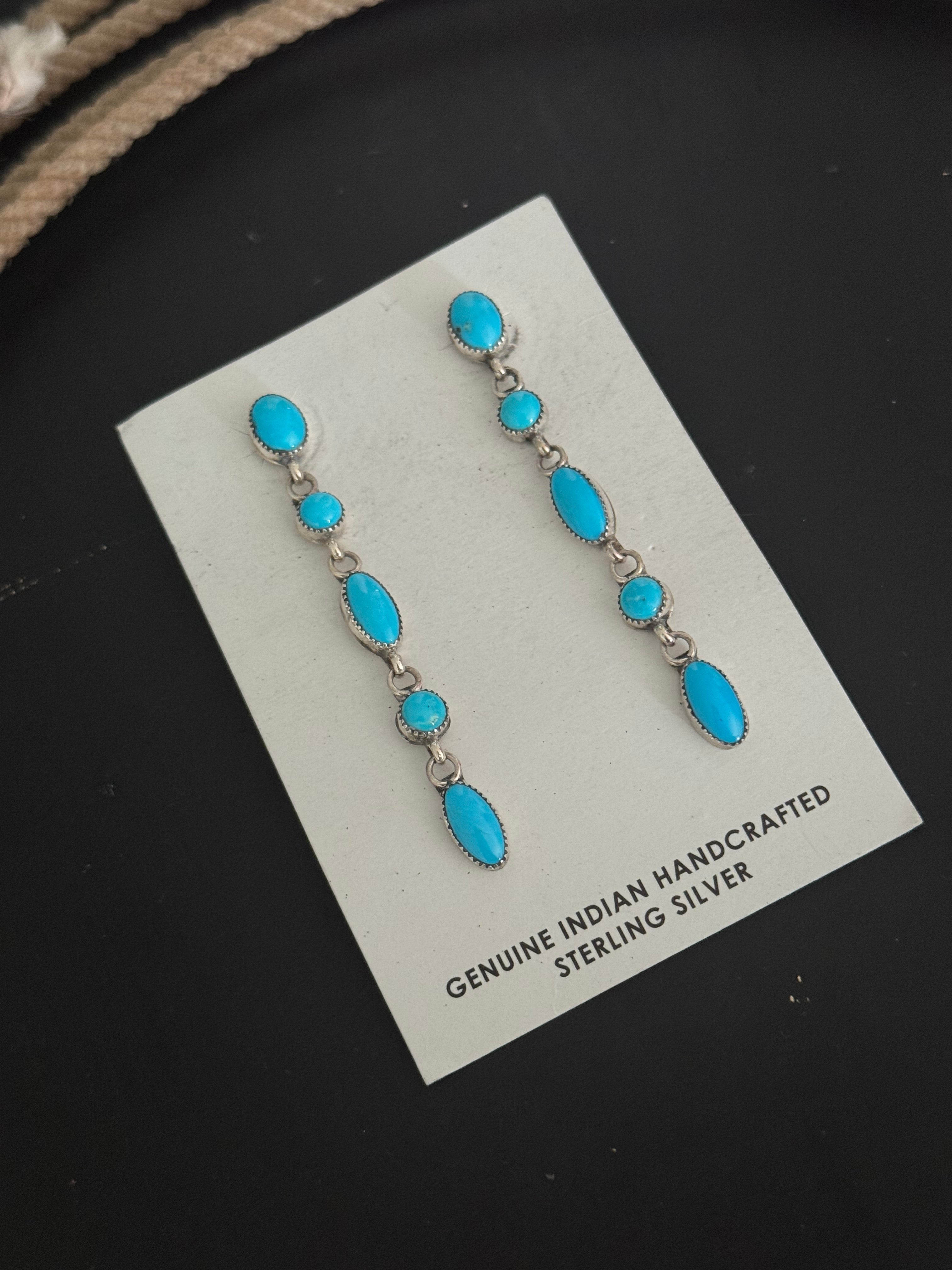 Pearline Spencer Sleeping Beauty Turquoise & Sterling Silver Post Dangle Earrings. They measure 2 5/8 inches long and 1/4 of an inch wide. Signed and stamped.