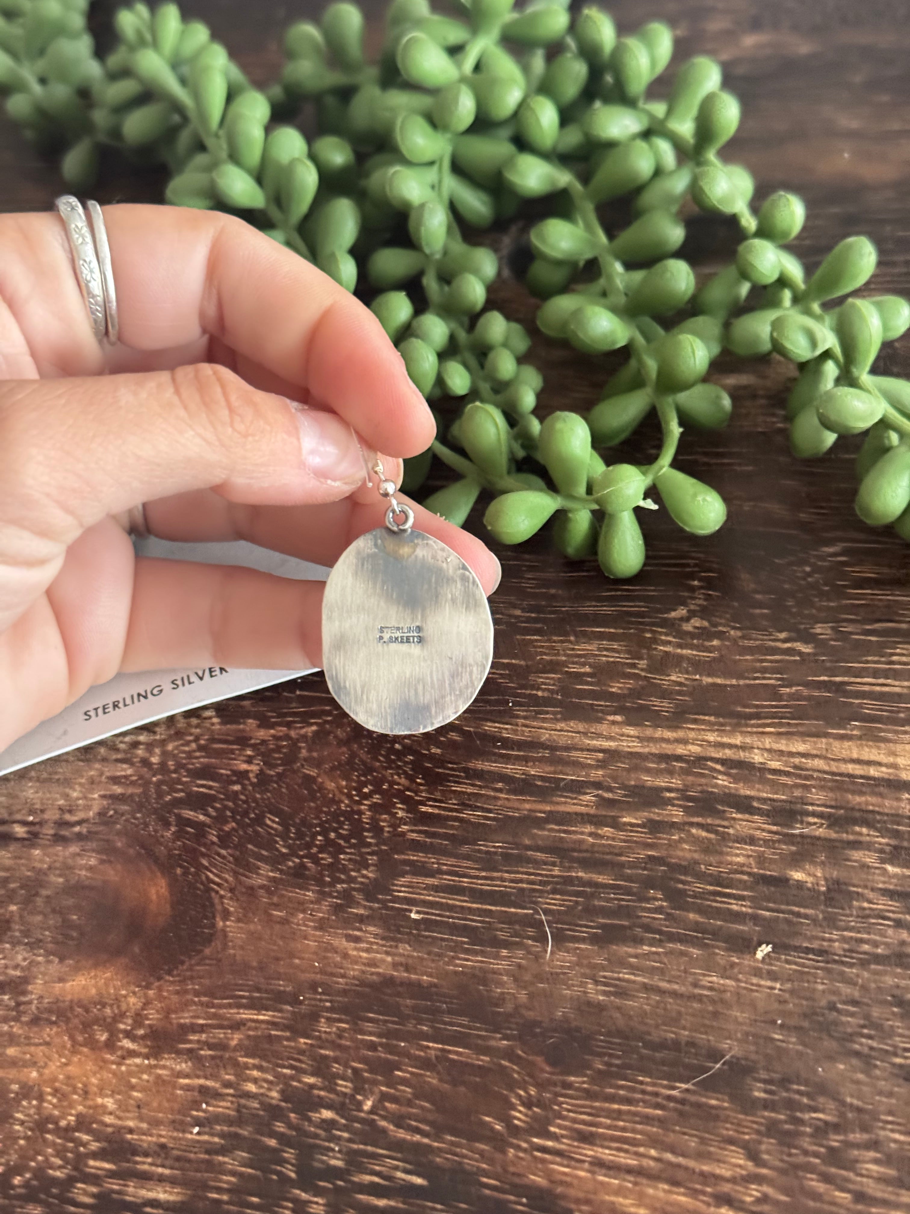 Peggy Skeets Kingman Turquoise & Sterling Silver Dangle Earrings. It measures 1 7/8 inches long and 1 inch wide. Signed and stamped.