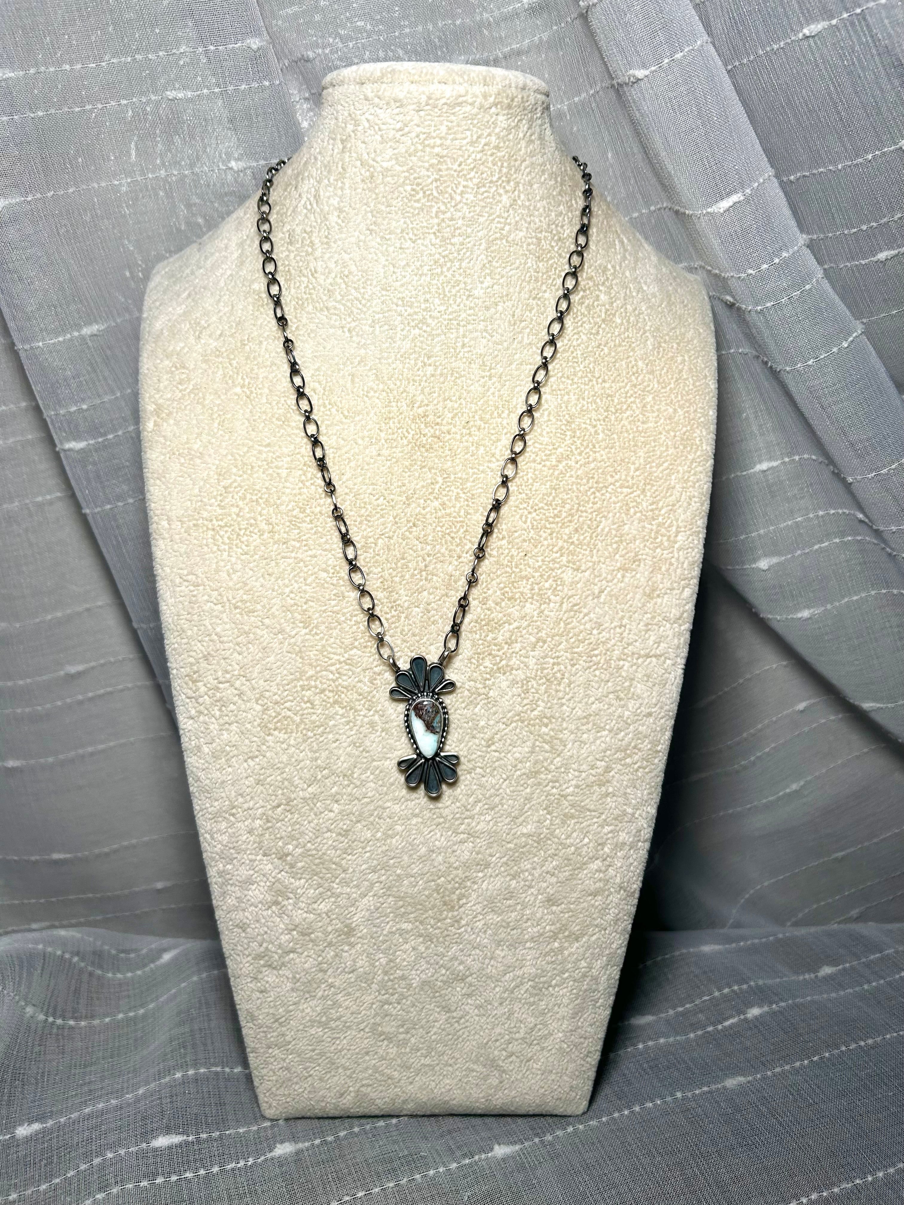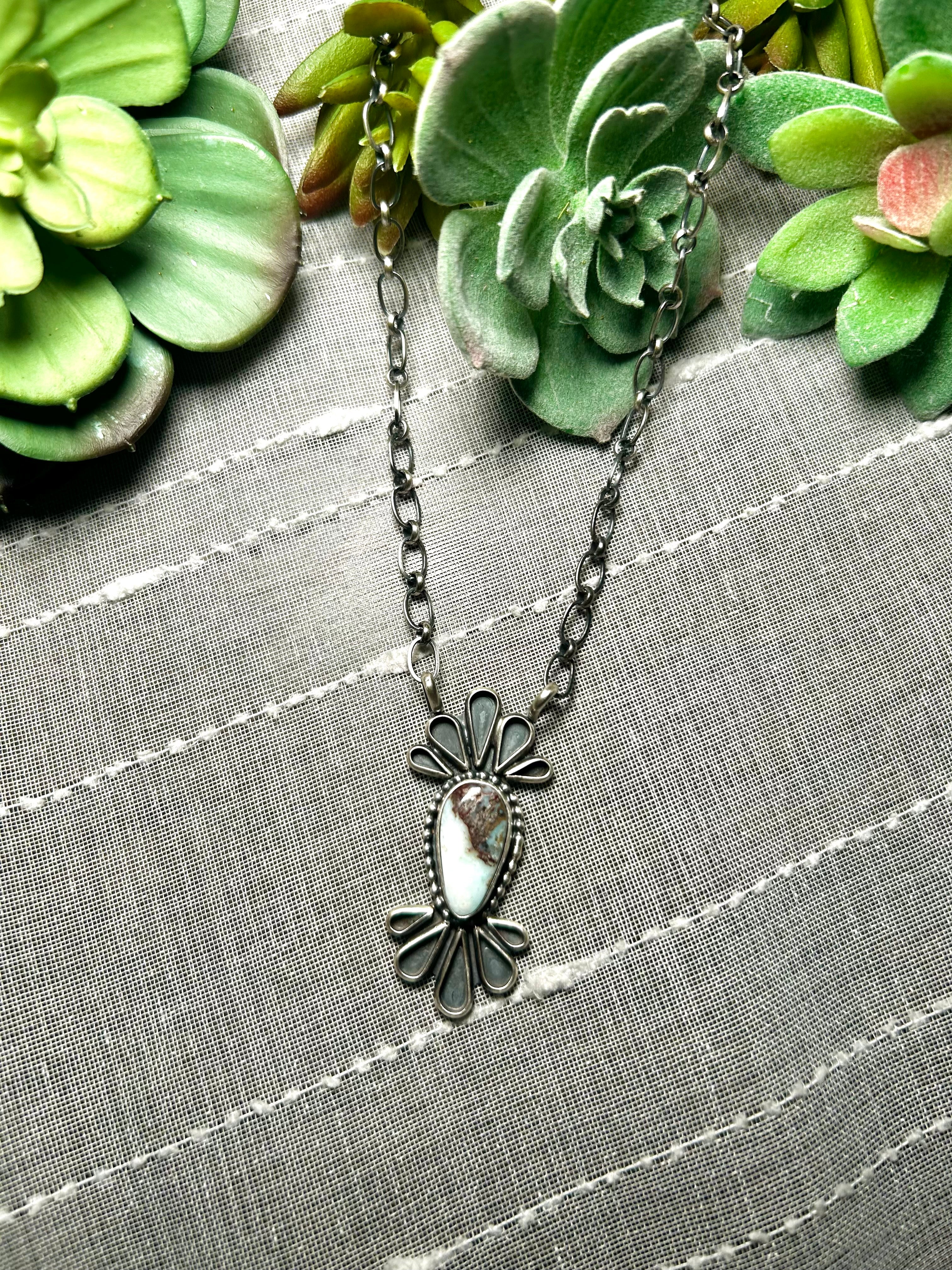 Randy Billy Dry Creek Turquoise & Sterling Silver Necklace. It measures 22 1/2 inches long with hang while the chain measures 18 1/2 inches long. Signed by the artist and stamped sterling silver.