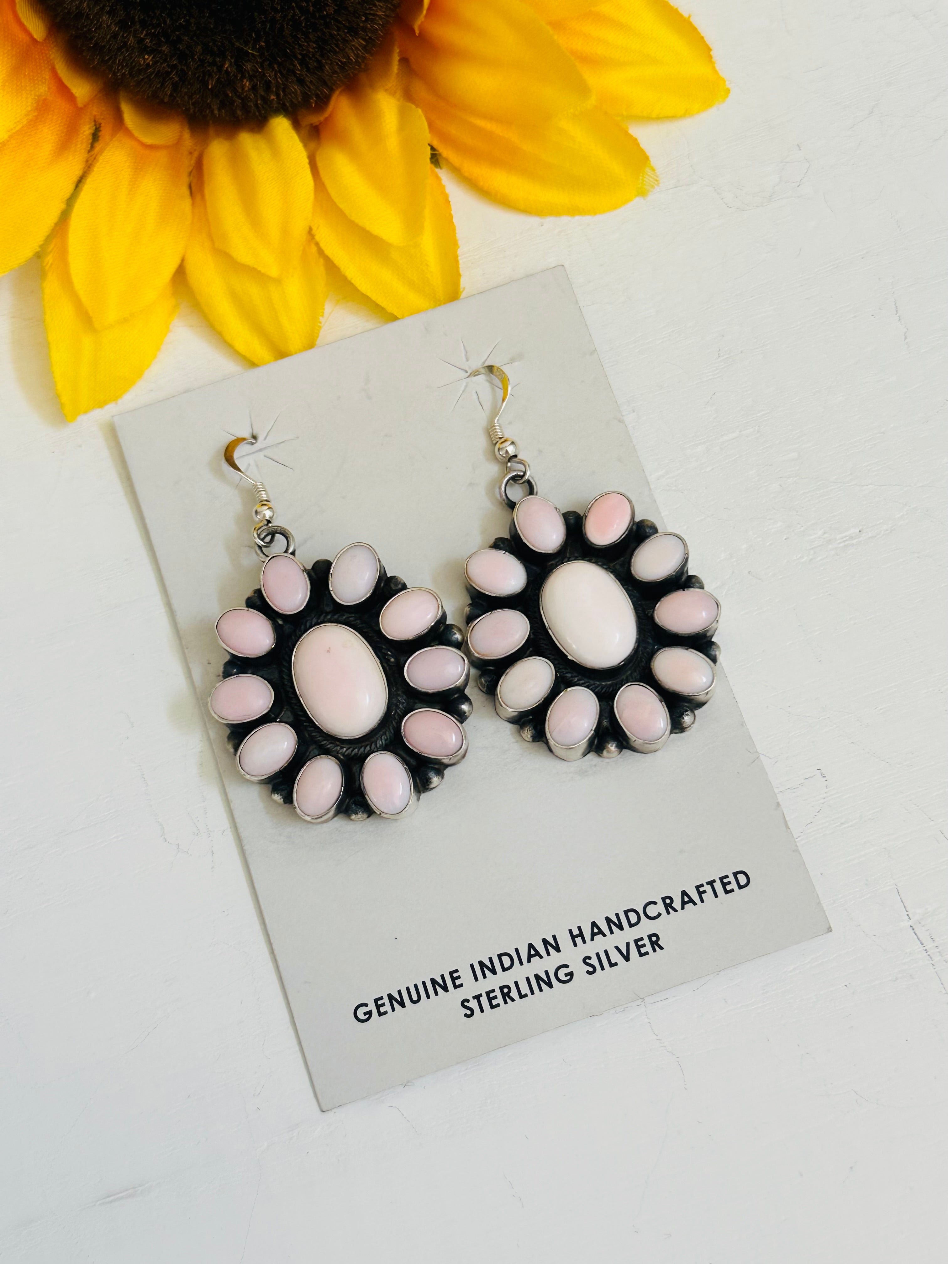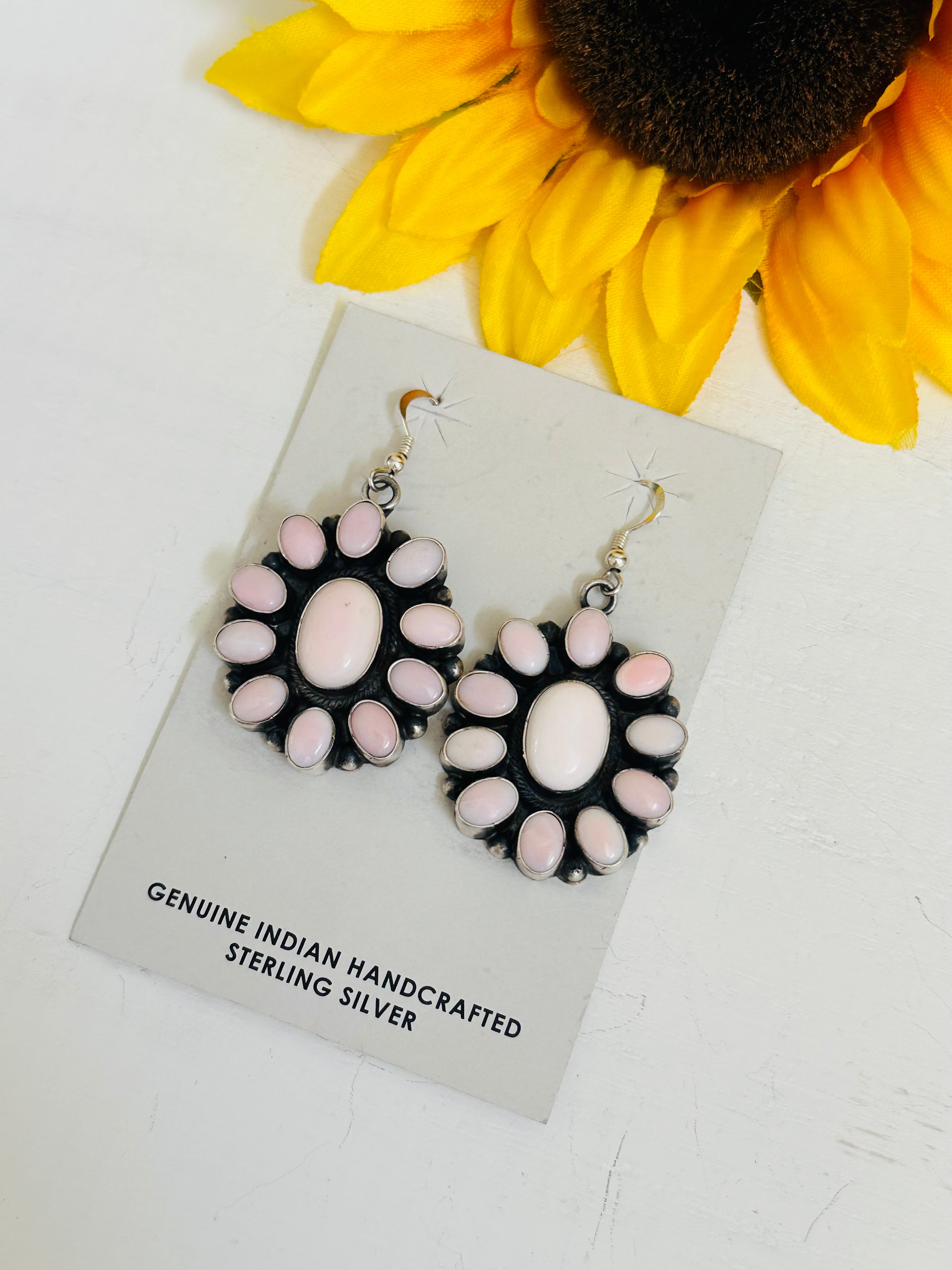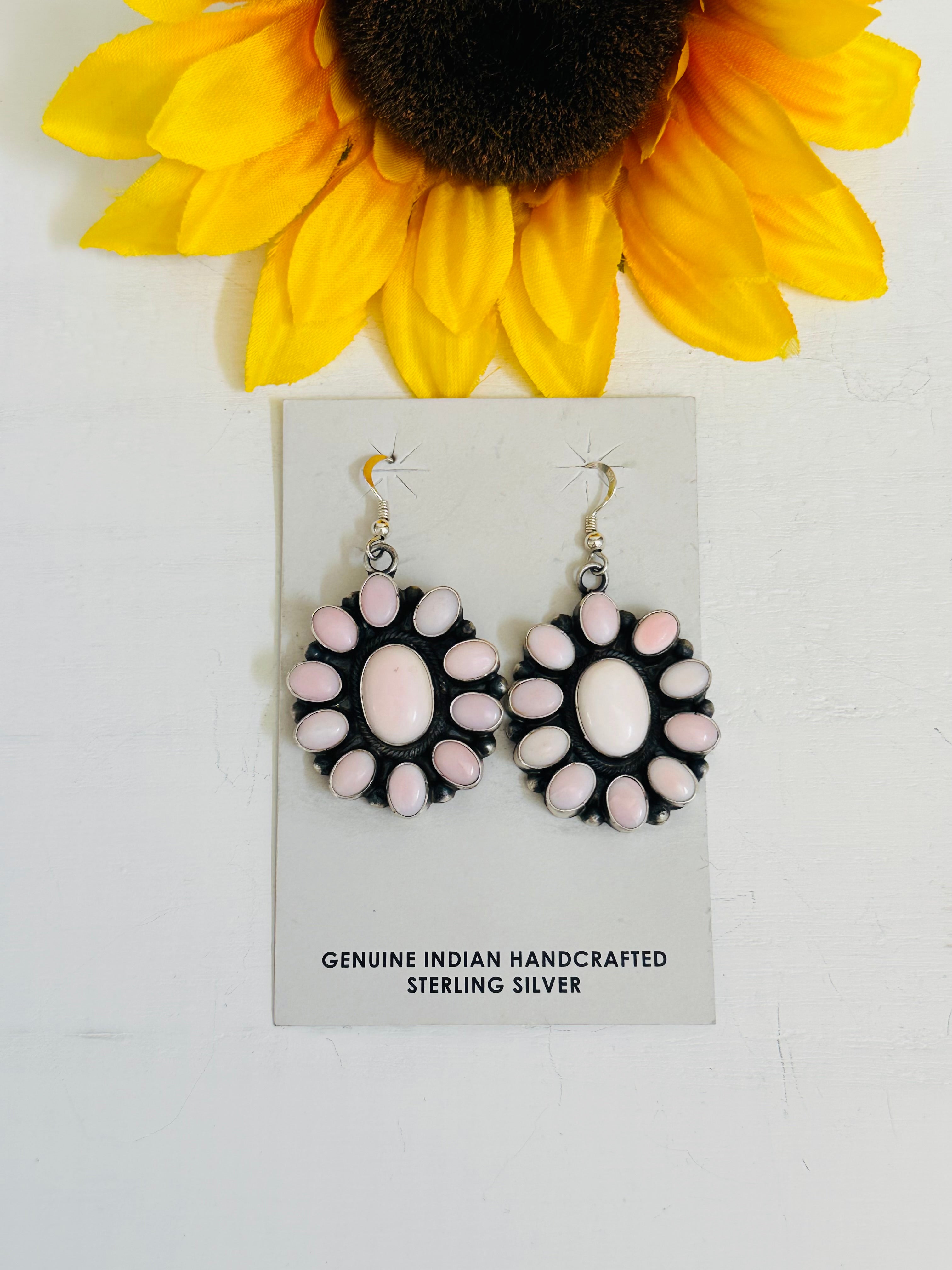 Randy Boyd Pink Conch & Sterling Silver Cluster Dangle Earrings. They measures 2 1/4 inches long and 1 1/8 inches wide. Signed by the artist and stamped sterling silver. Stones differ due to natural stones.