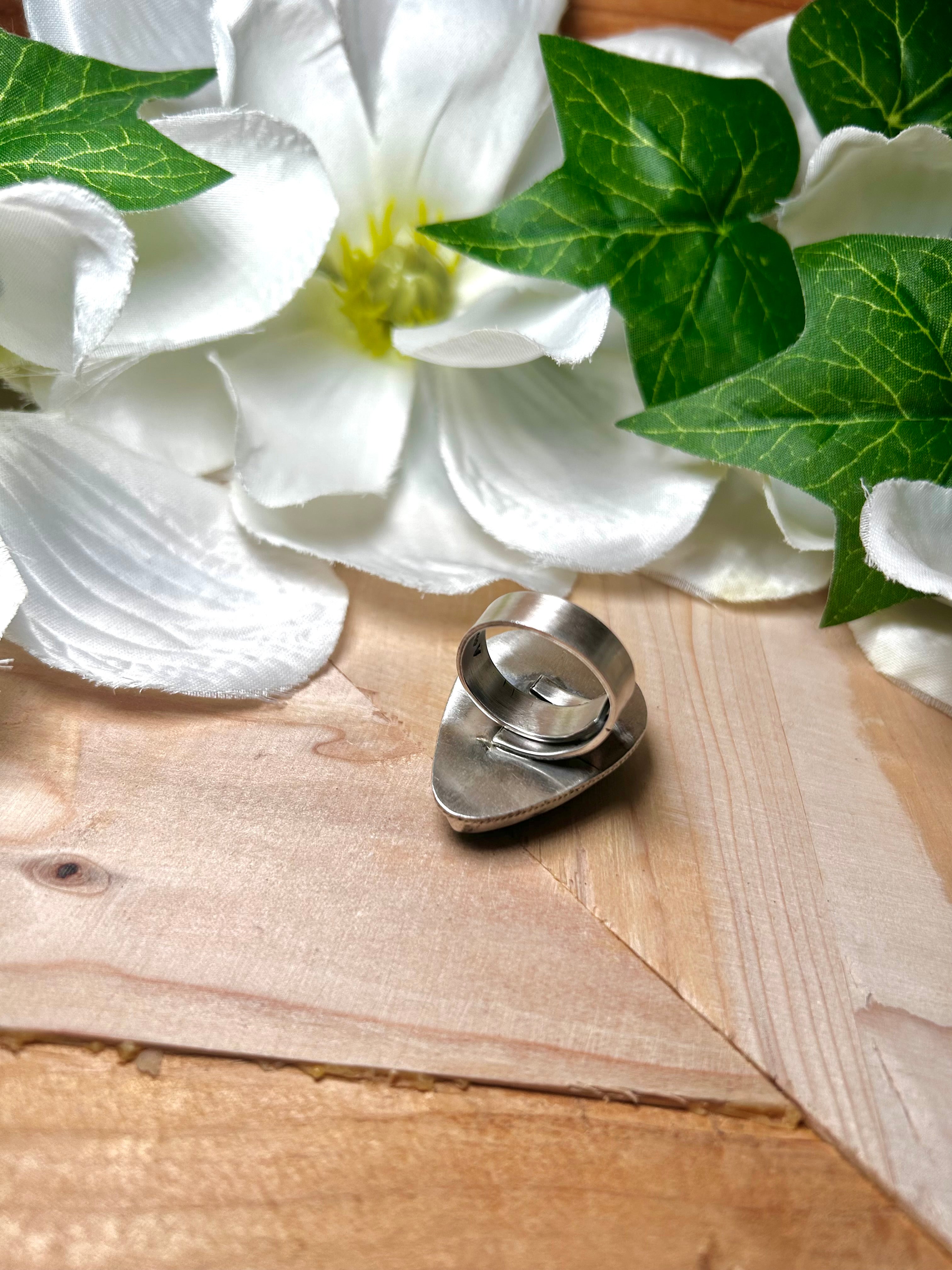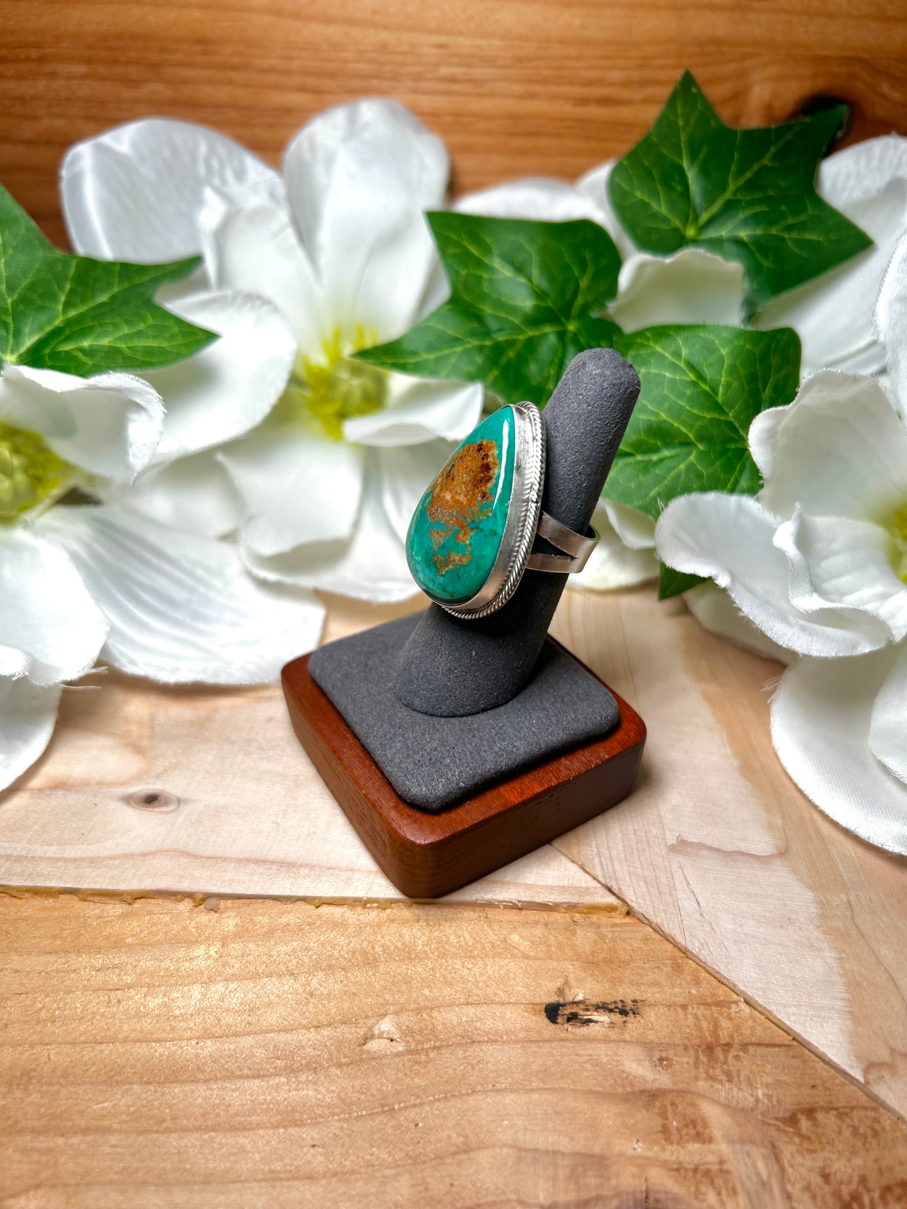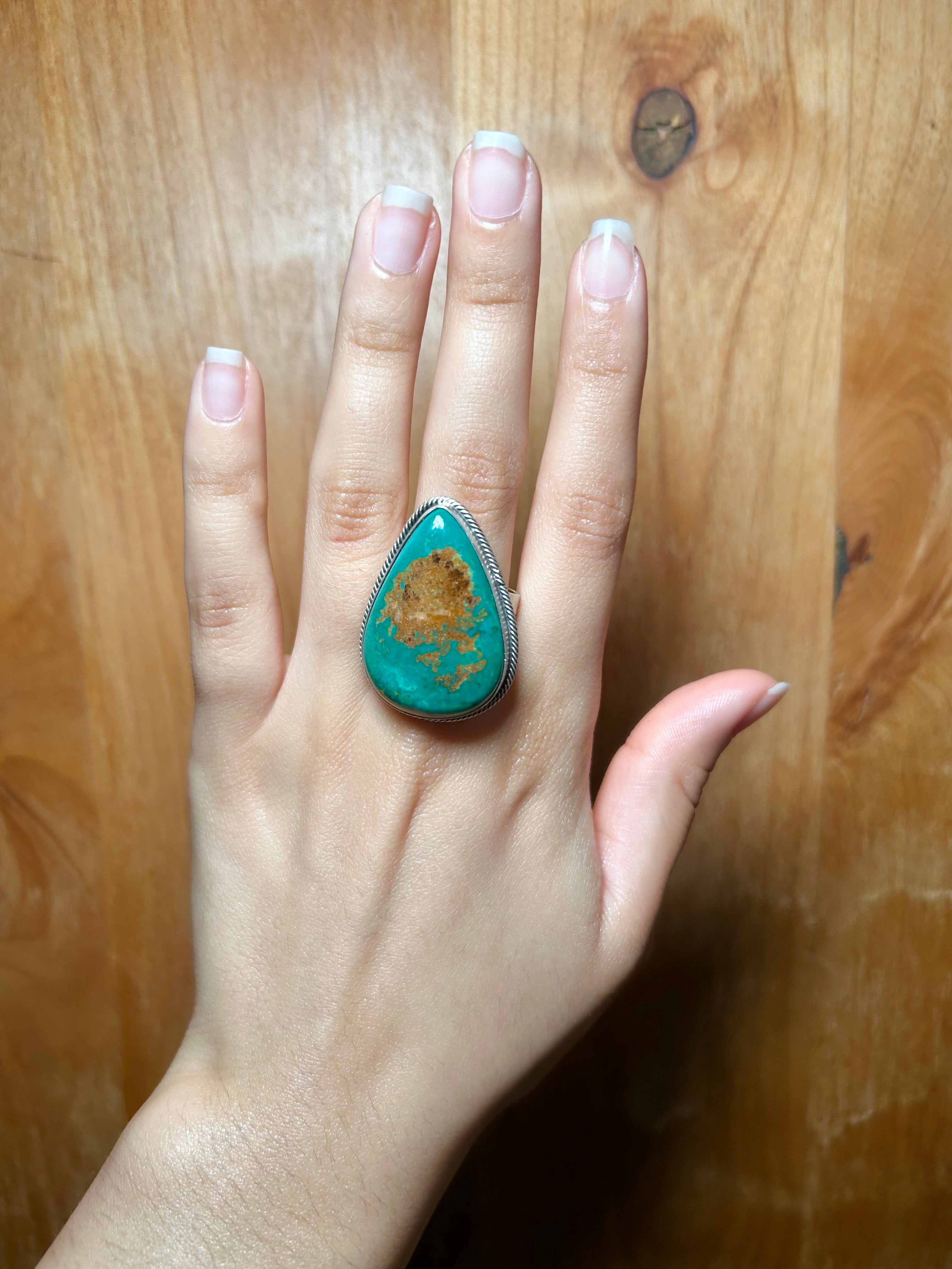 Antionette Martinez Royston Turquoise & Sterling Silver Adjustable Ring. It measures 1 3/8 inches long and 1 inch wide. Signed by the artist and stamped sterling silver.