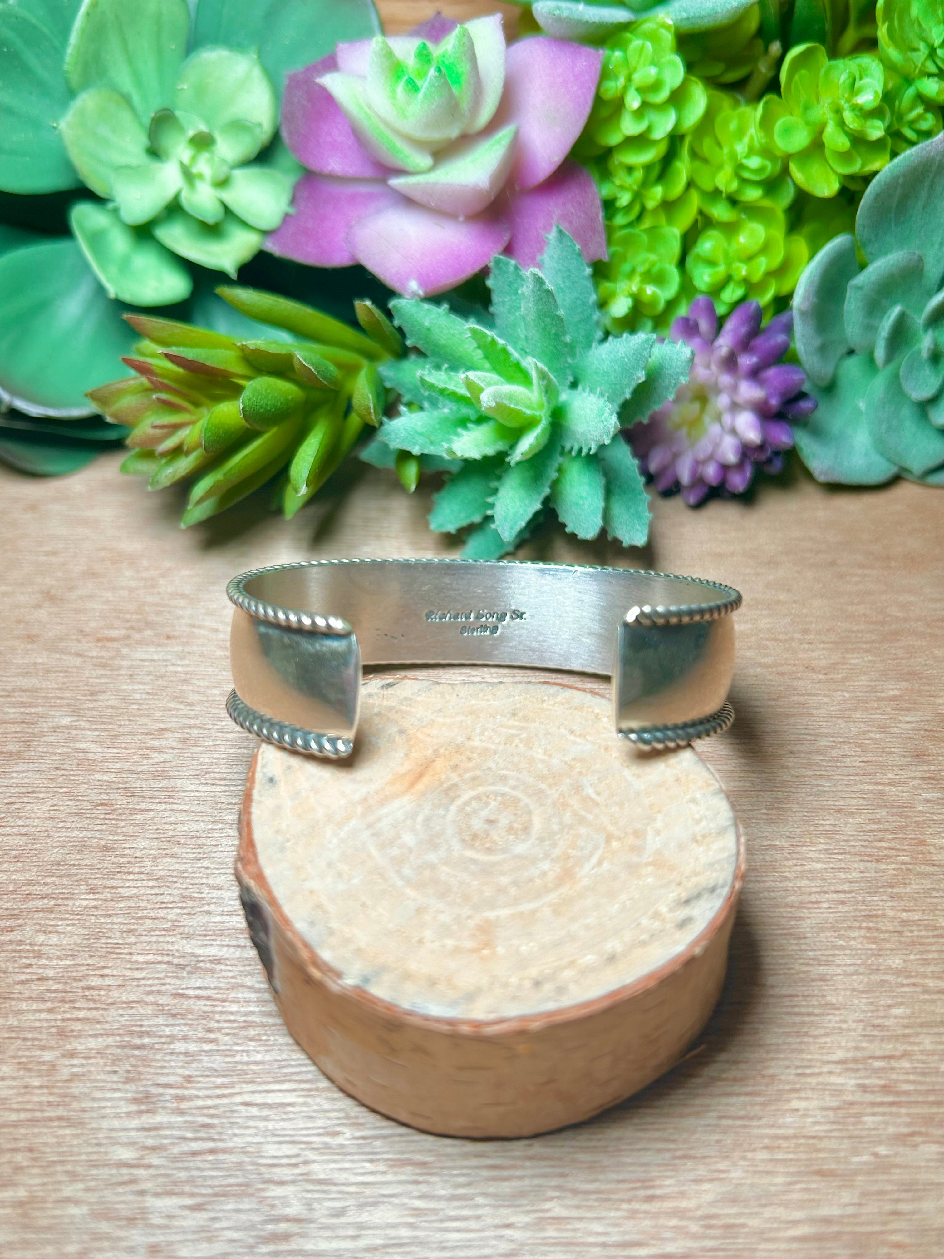Richard Long Multi Stone & Sterling Silver Cuff Bracelet. It measures 3/4 of an inch wide with an inside circumference of 5 1/4 inches and a gap of 1 1/8 inches. Signed by the artist and stamped sterling silver.