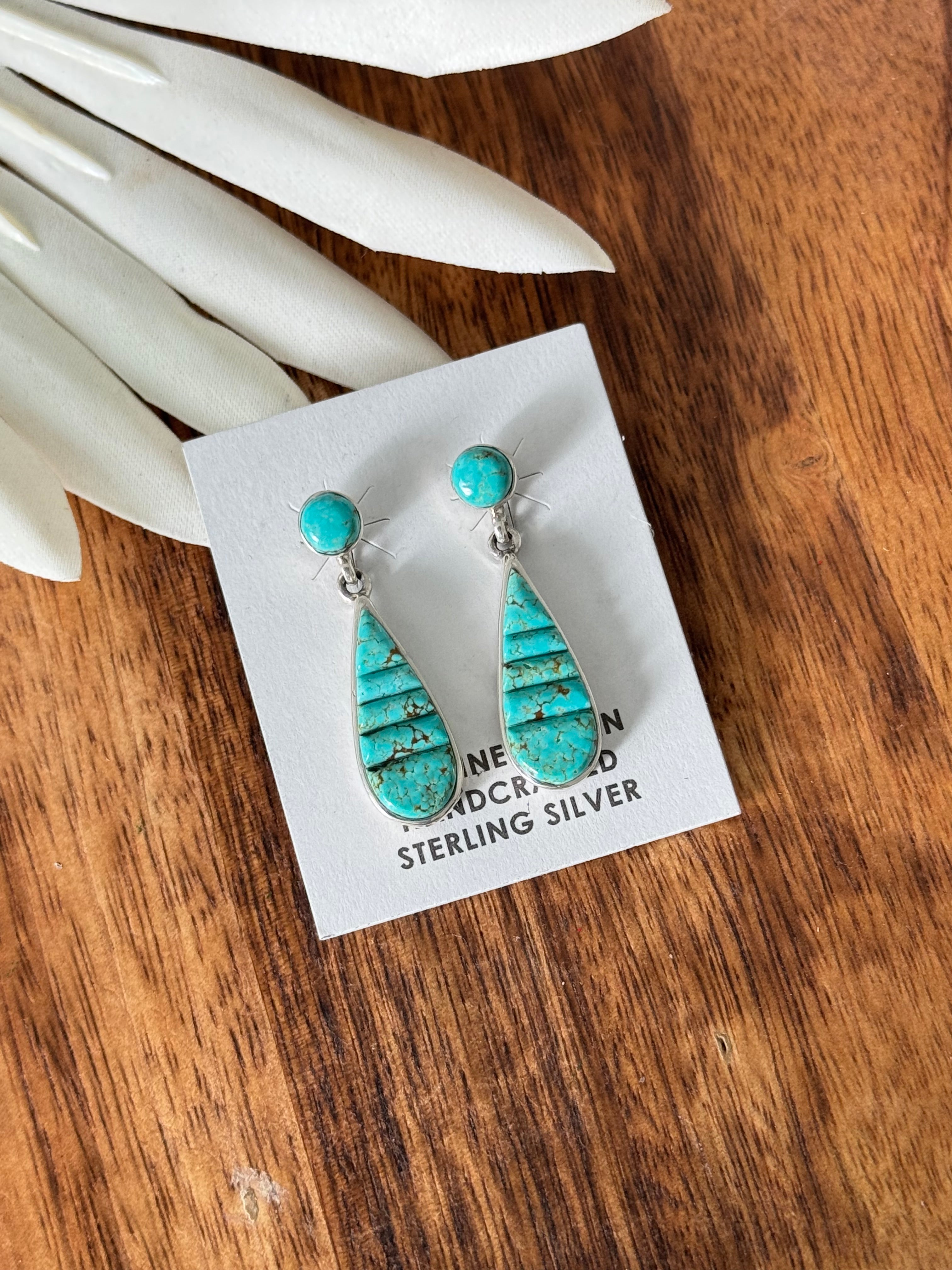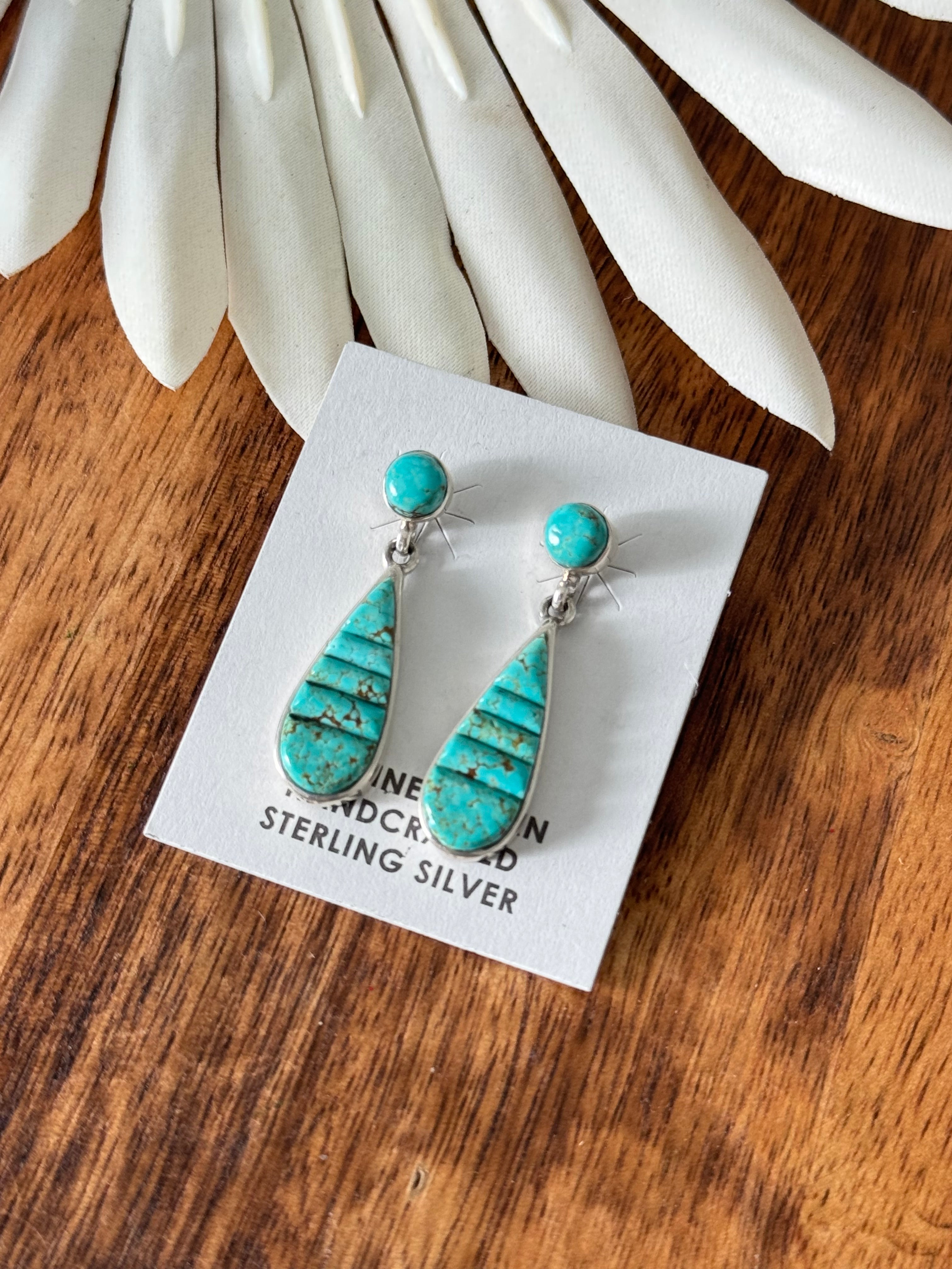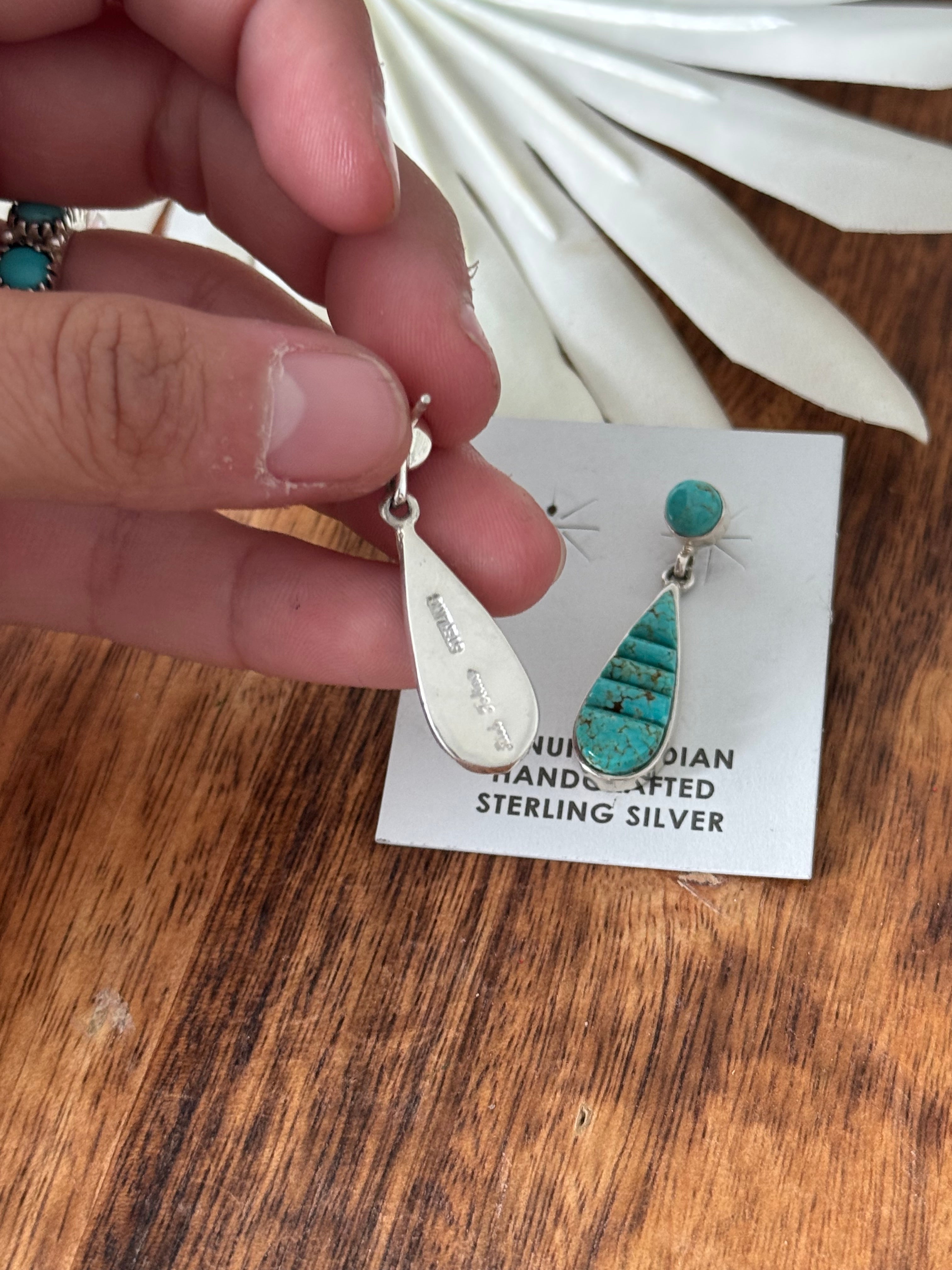 Rick Tolino #8 Turquoise & Sterling Silver Cobblestone Dangle Earrings. They measure 1 3/8 inches long and 3/8 of an inch wide. Signed by the artist and stamped sterling silver.