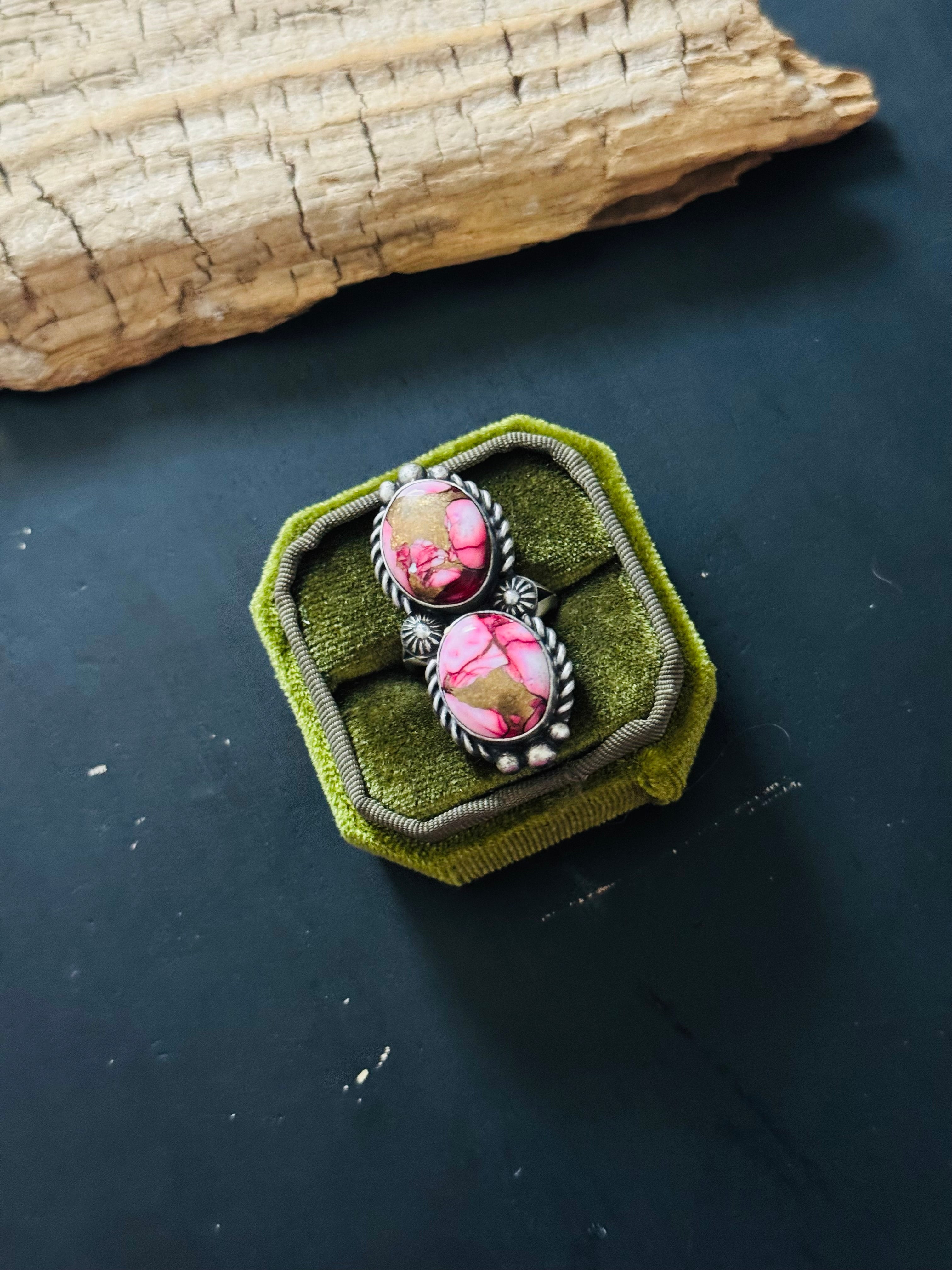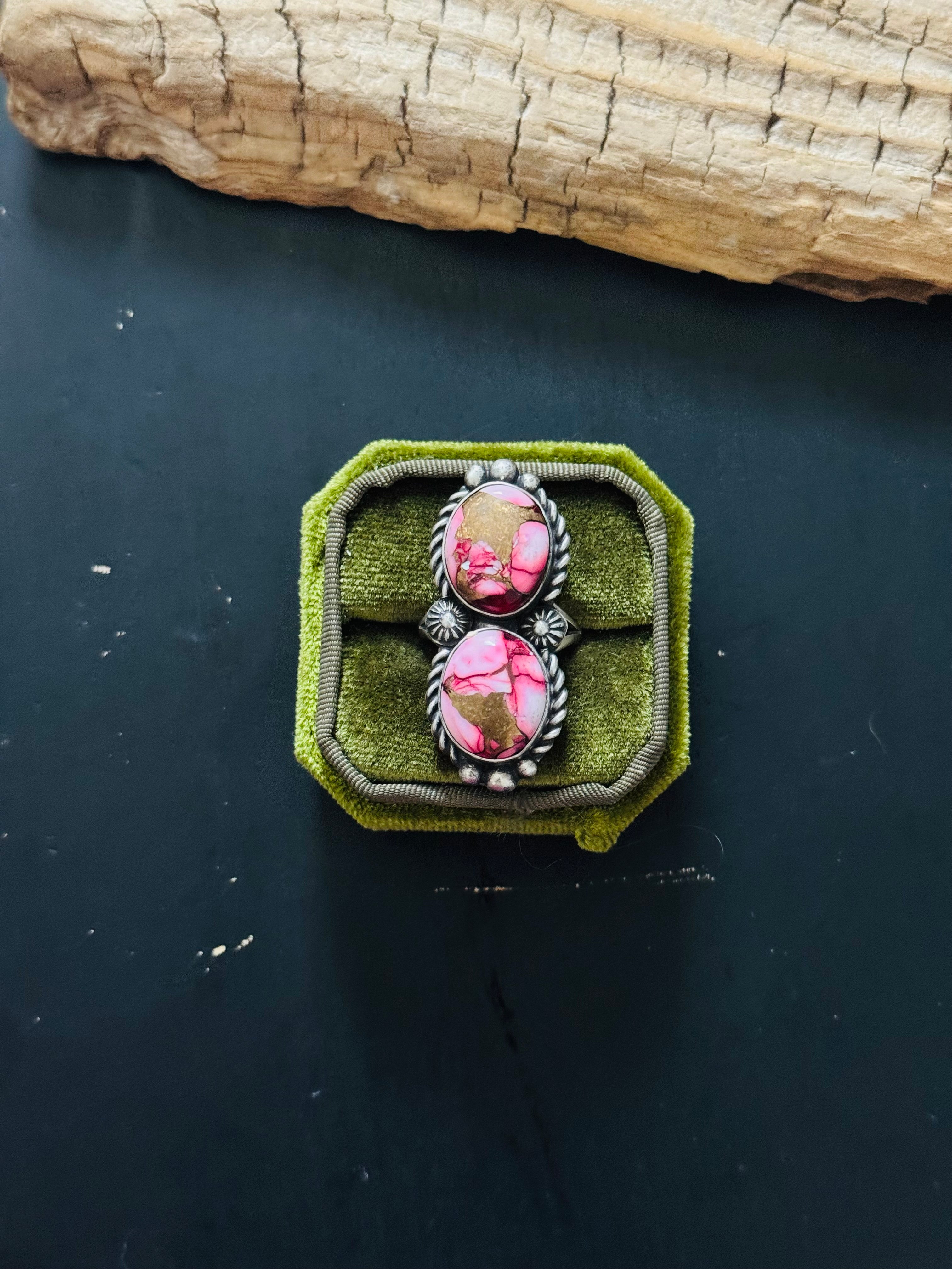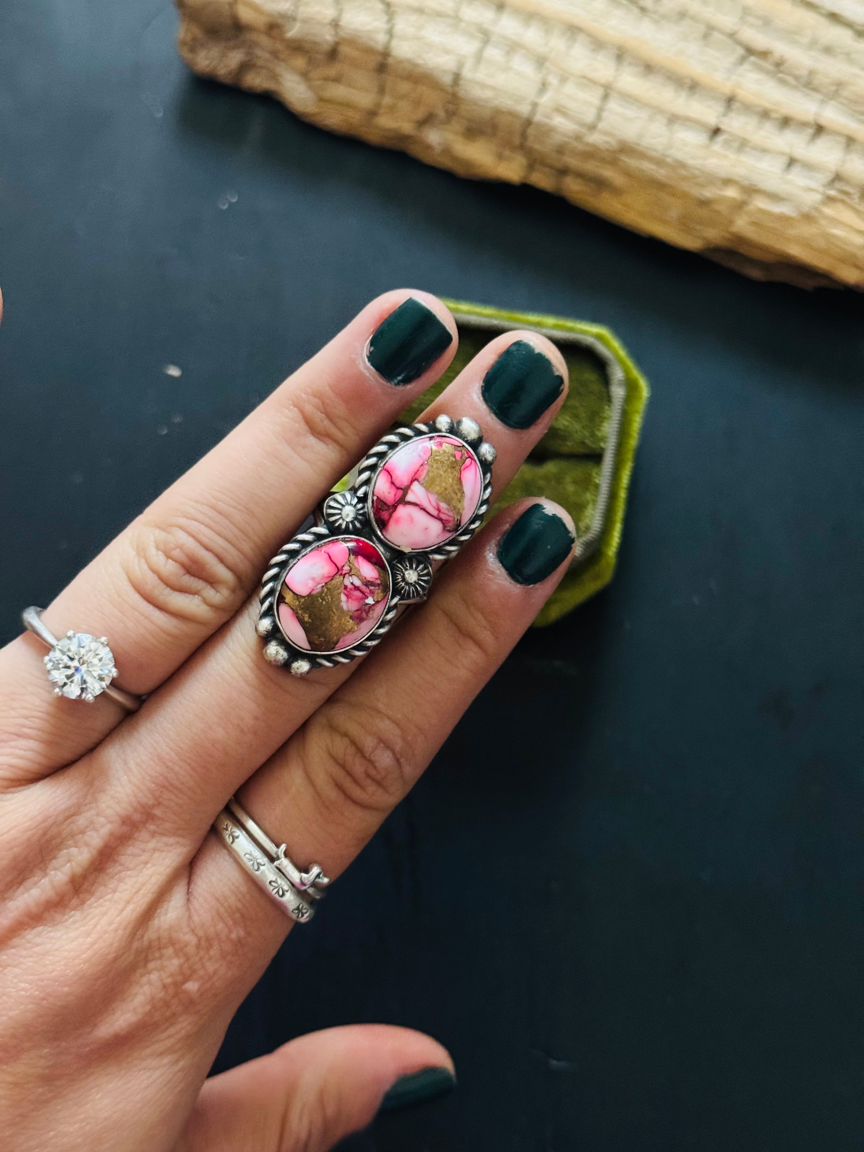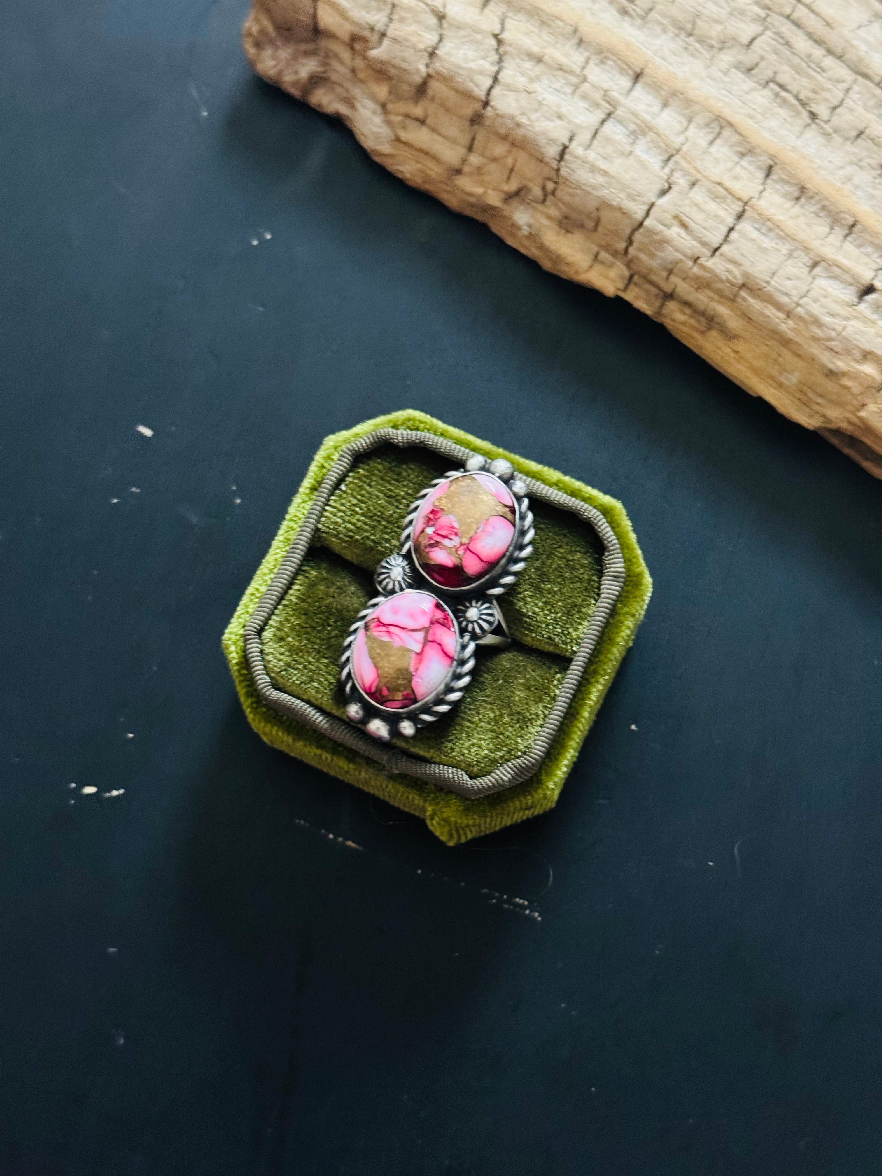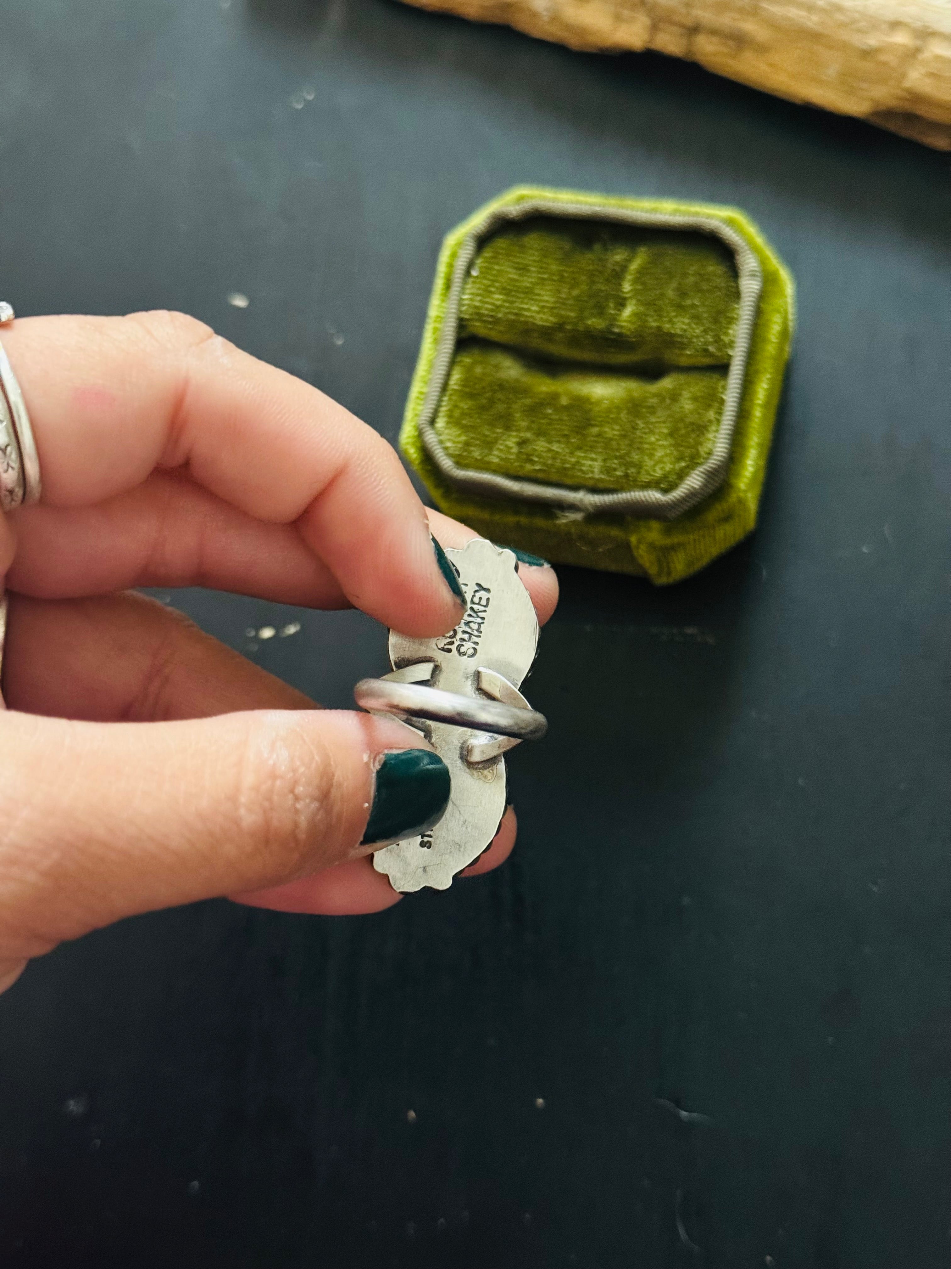 Robert Shakey Rose Dahlia Composite & Sterling Silver Ring Size 6.75. It measures 1 1/2 inches long and just over 5/8 of an inch wide. Signed by artist and stamped sterling silver.