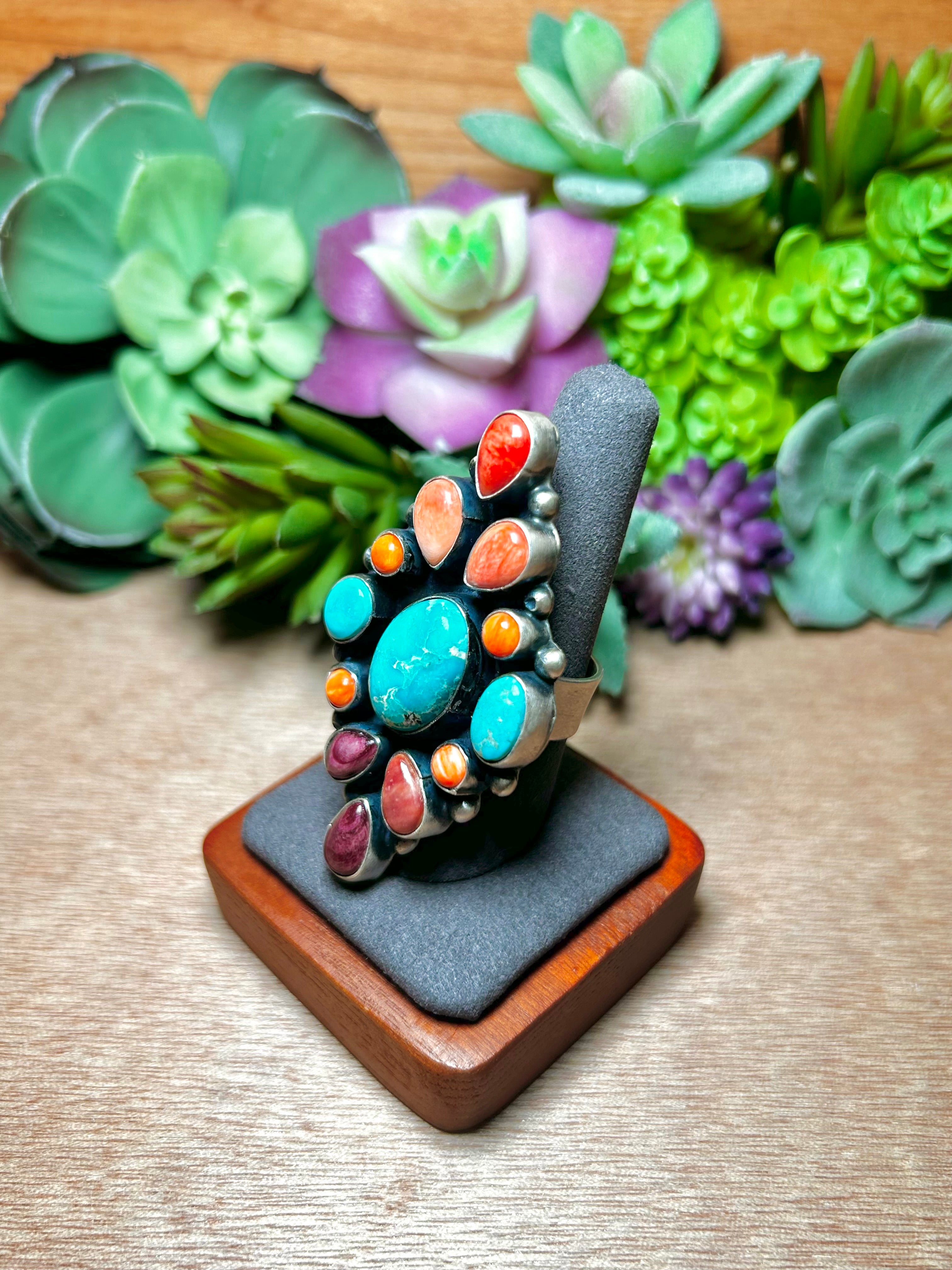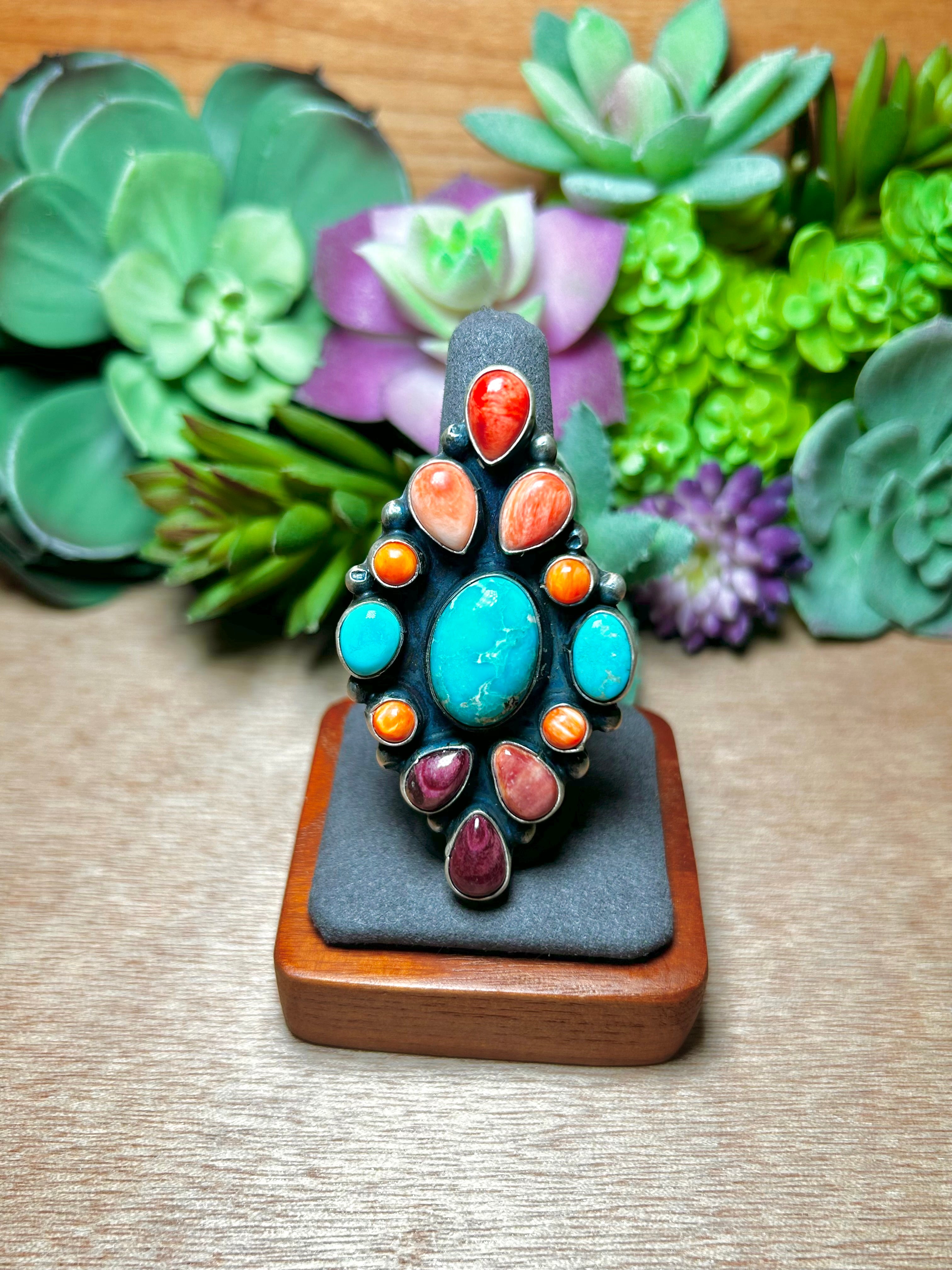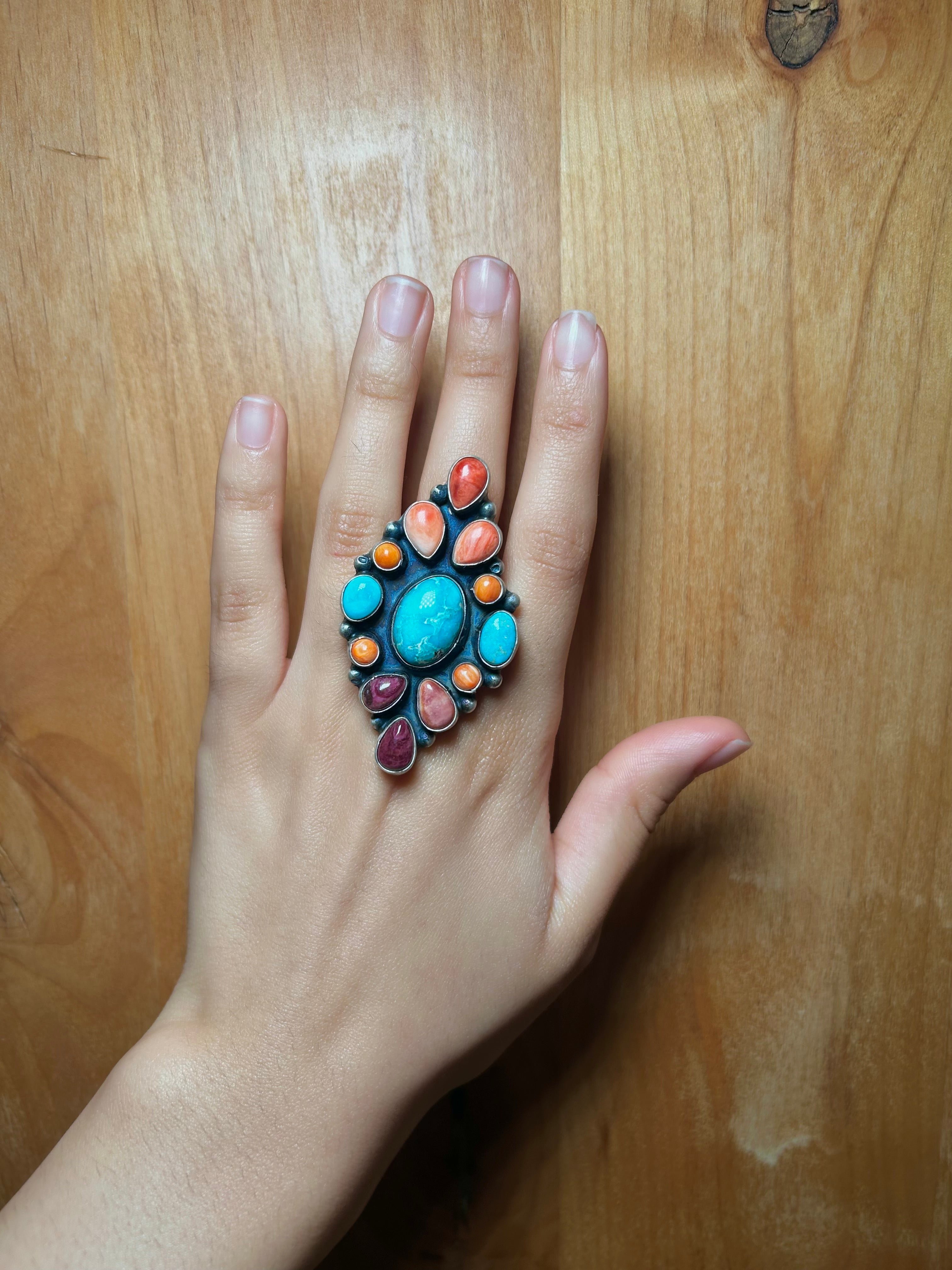 Navajo Made Multi Stone & Sterling Silver Adjustable Ring. It measures 2 3/8 inches long and 1 1/4 inches wide. Signed by the artist and stamped sterling silver.