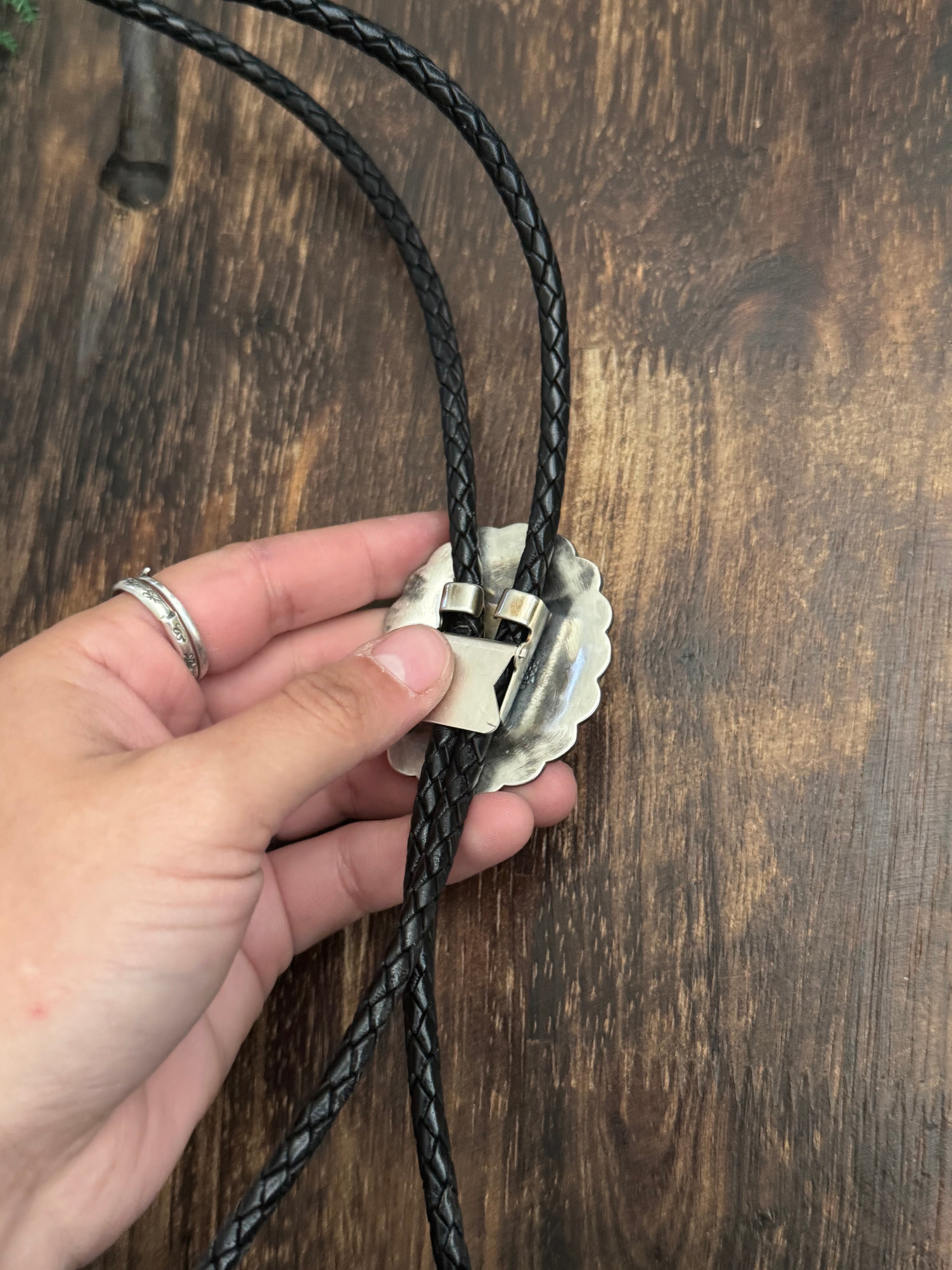 Sharon Francisco Palomino Variscite & Sterling Silver Bolo Tie. It measures 48 inches long while the setting measures 2 1/8 inches long and 1 7/8 inches wide. Stamped sterling silver.