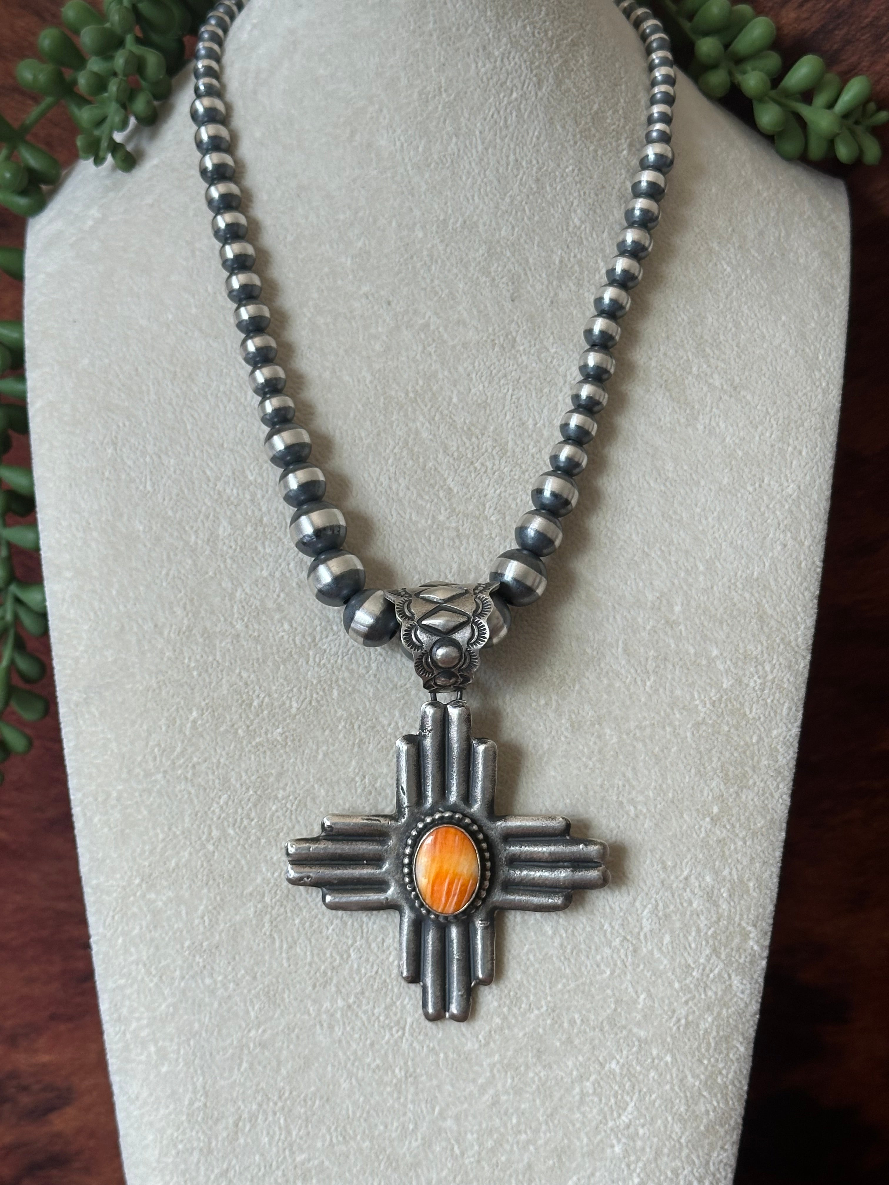Shawn Cayatineto Spiny Oyster & Sterling Silver Zia Pendant. It measures 3 5/8 inches long and 2 5/8 inches wide. Pendant Only!! Signed by the artist and stamped sterling silver.