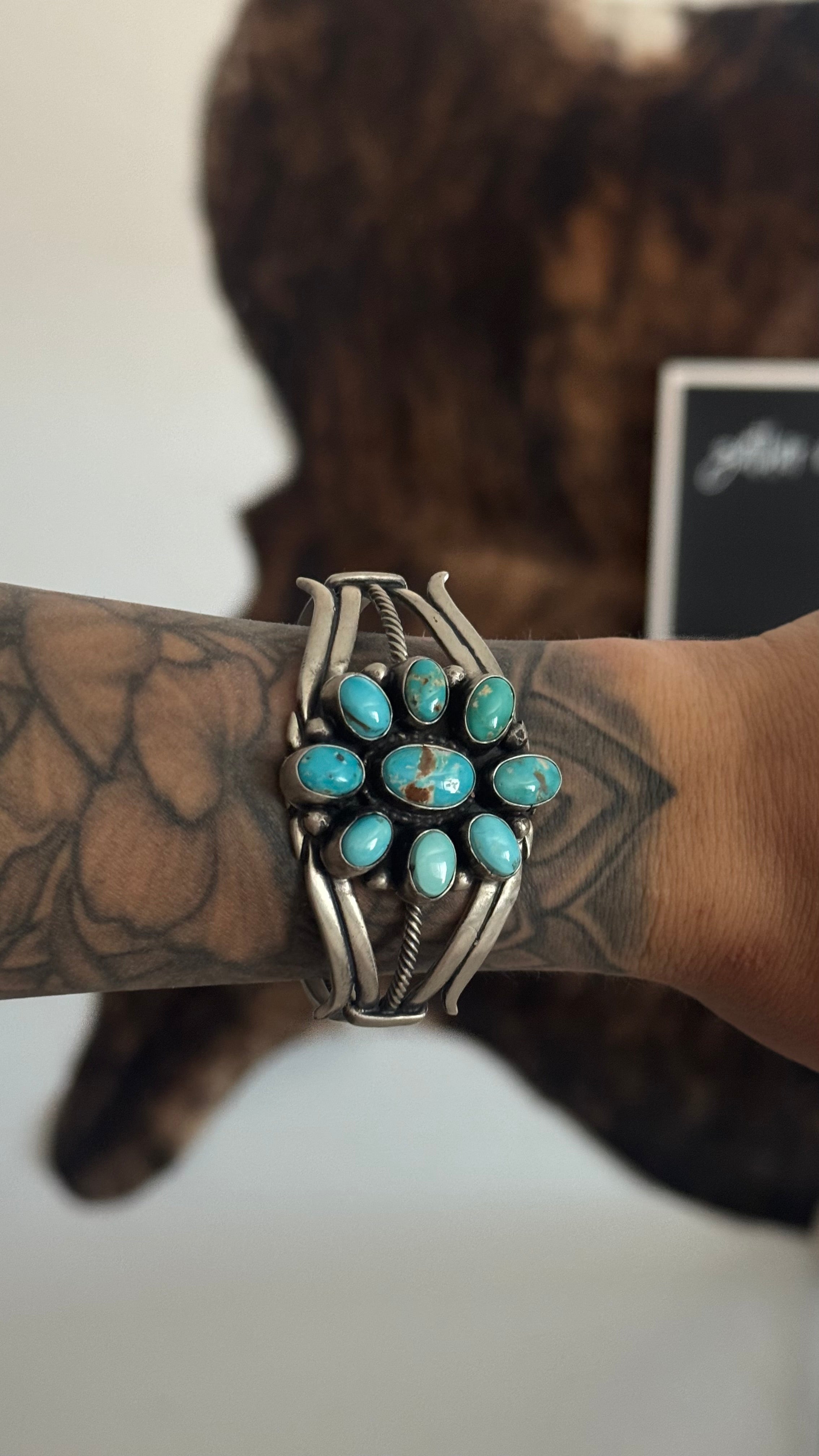 Sheila Becenti Royston Turquoise & Sterling Silver Cluster Cuff Bracelet. It measures 1 1/2 inches wide with an inside circumference of 5 3/8 inches and a gap of 1 inch. Signed by the artist and stamped sterling silver.