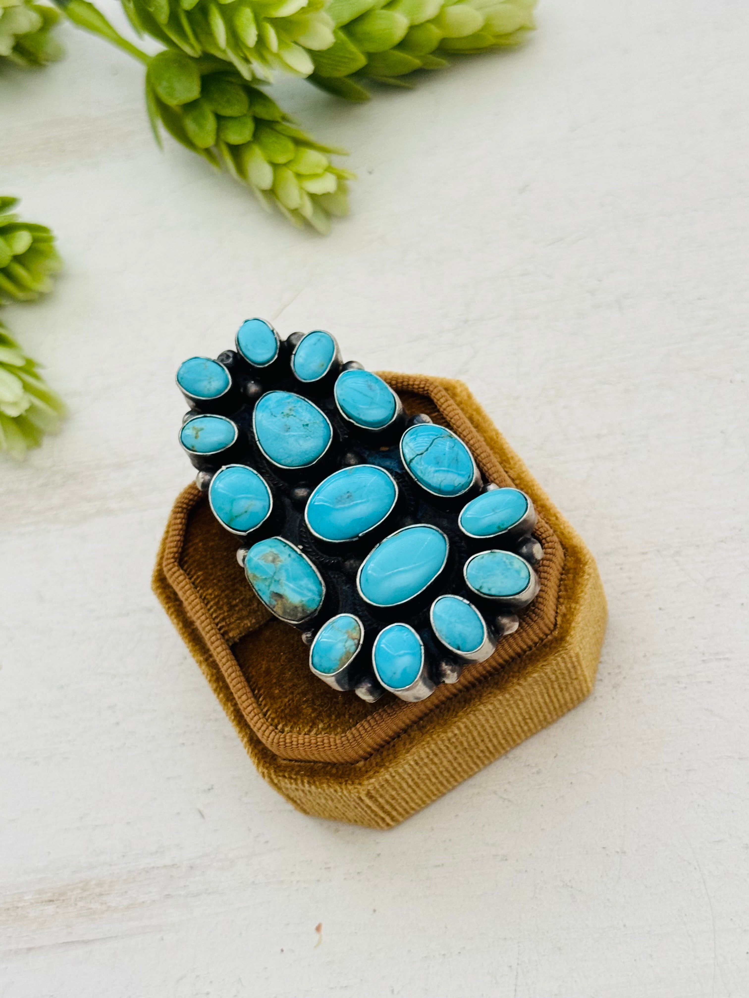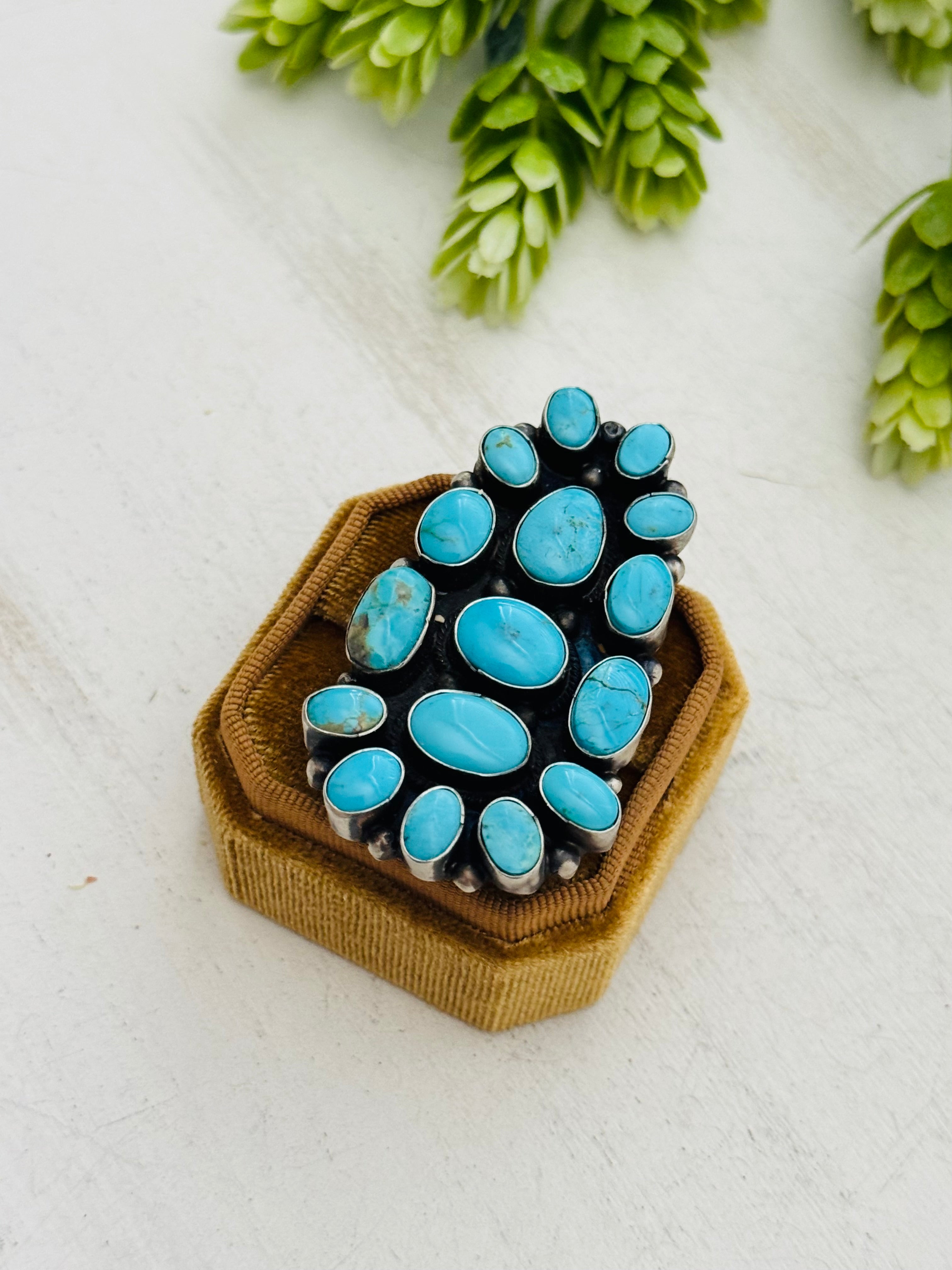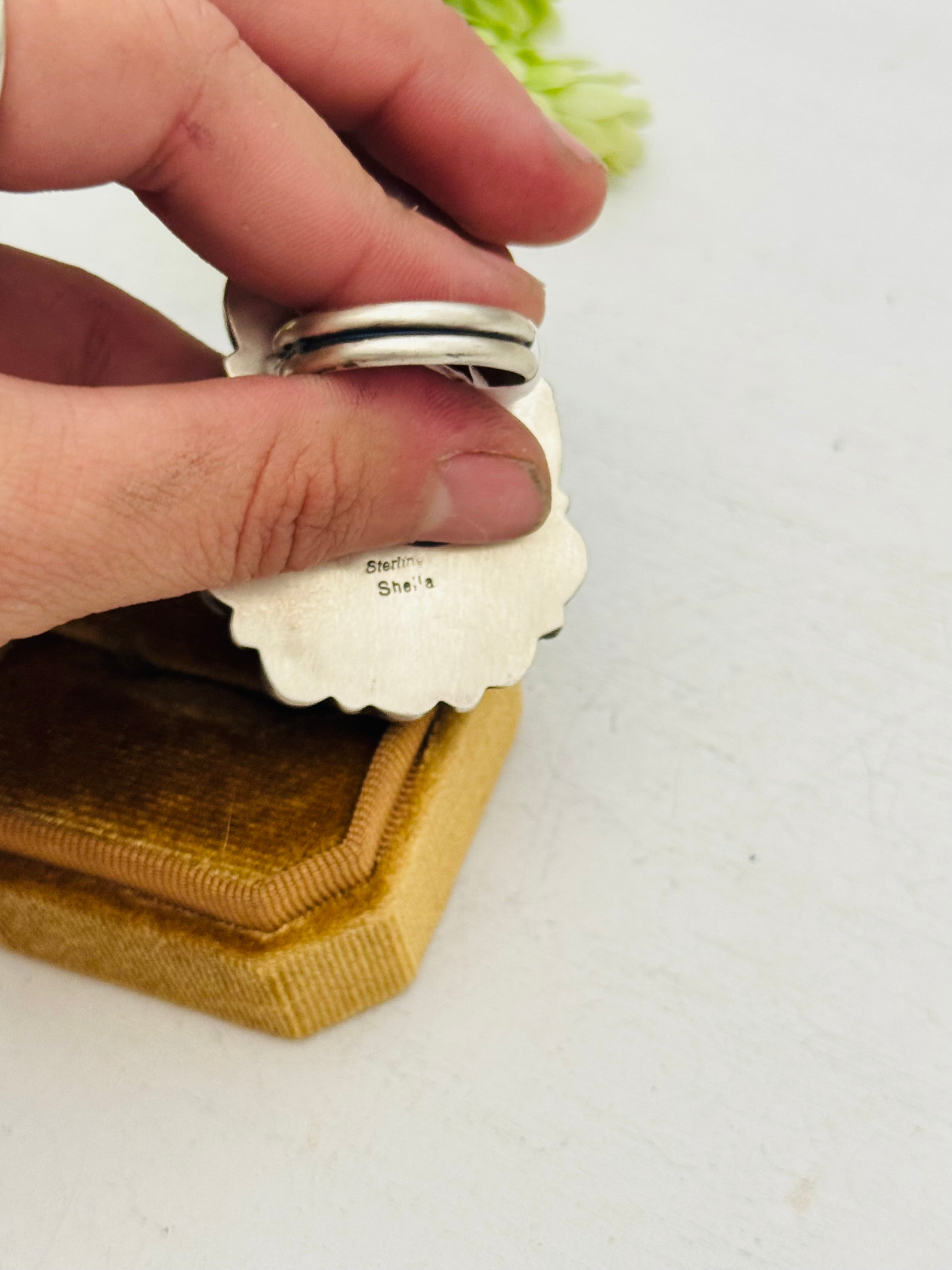 Sheila Becenti Kingman Turquoise Sterling Silver Adjustable Ring. It measures 2 1/4 inches long and 1 1/4 inches wide. Signed by the artist and stamped sterling silver.