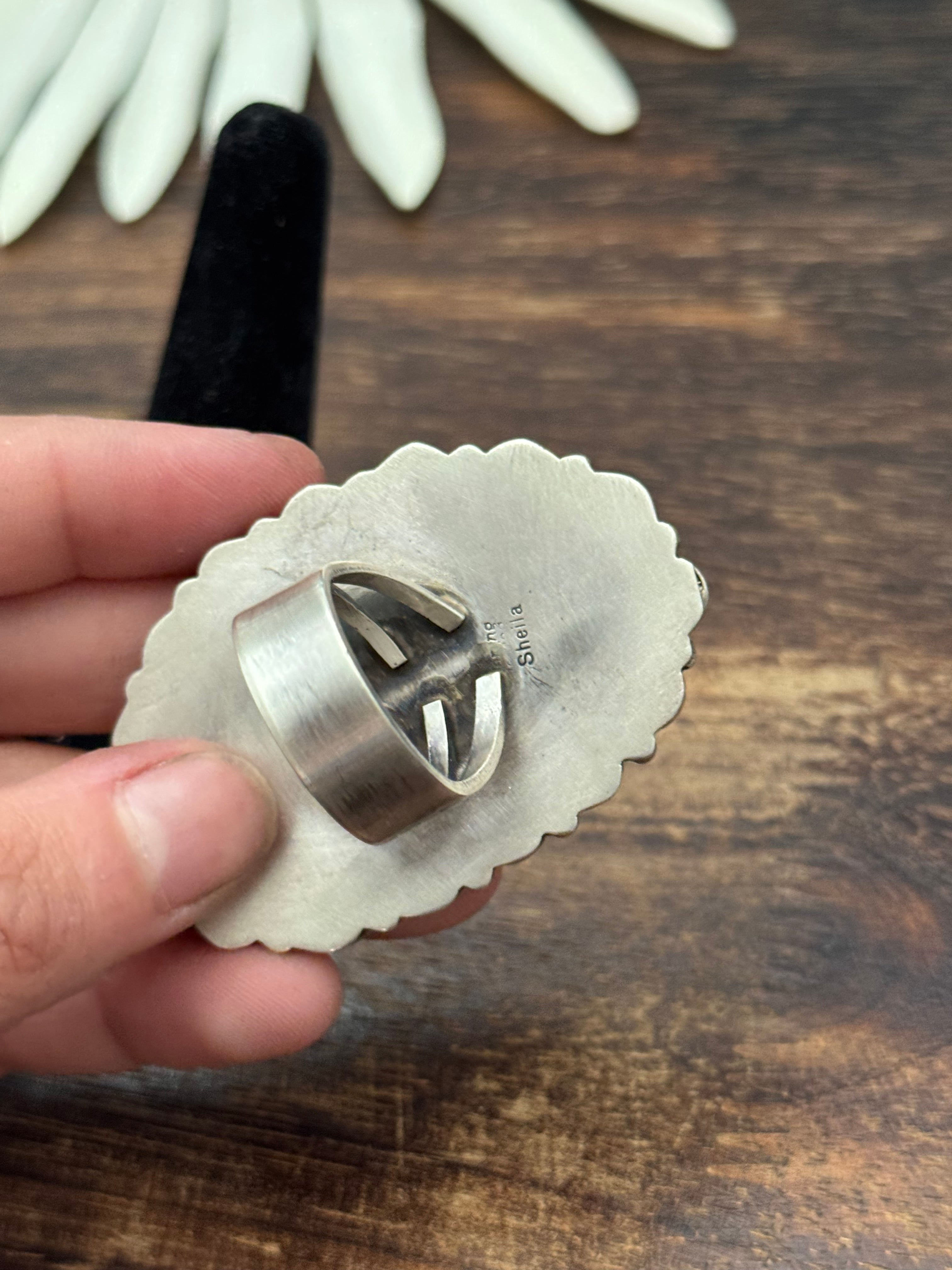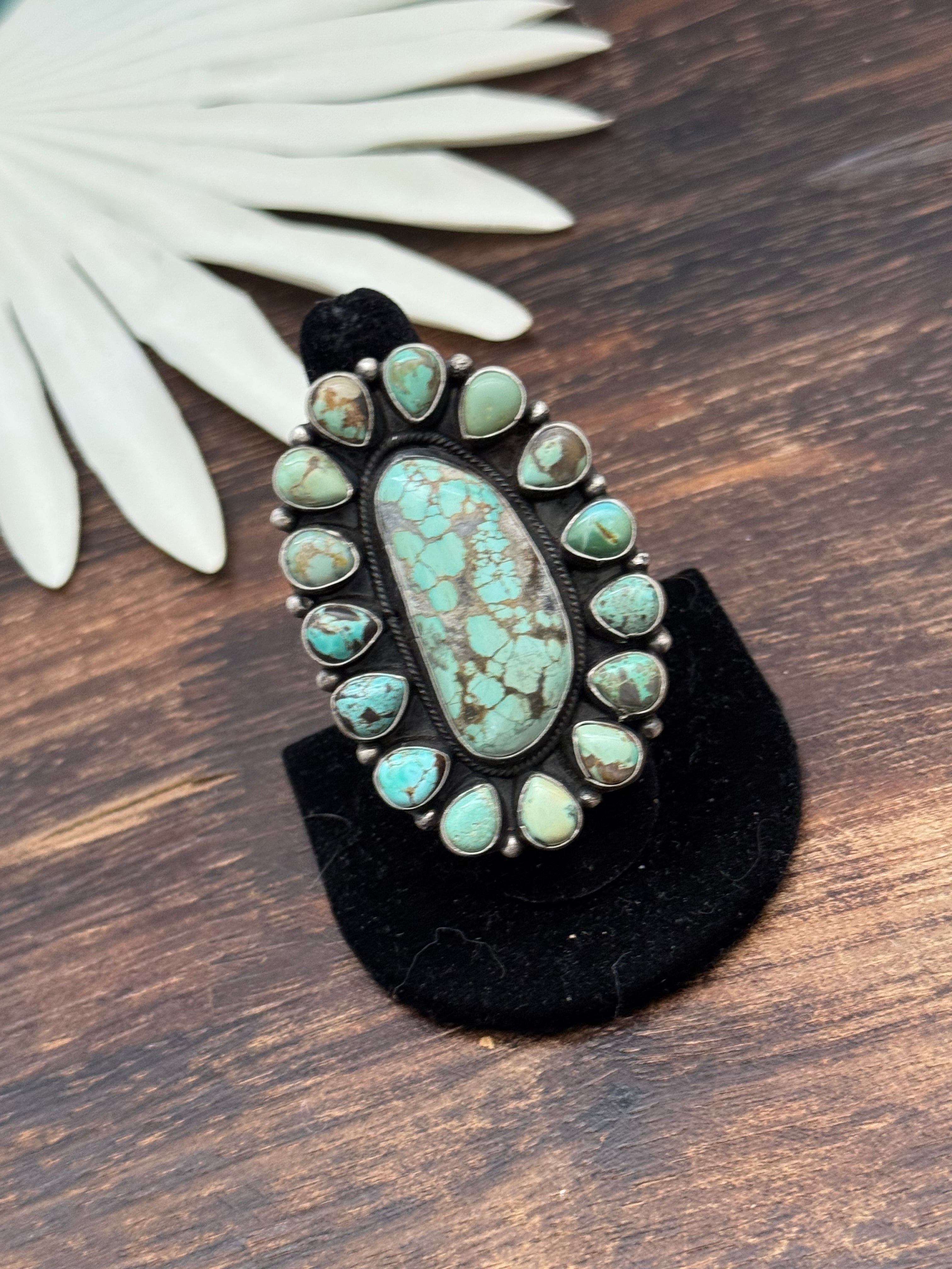 Sheila Becenti Multi Stone & Sterling Sliver Cluster Ring Size 8.75. It measures 2 1/8 inches long and 1 1/2 inches wide. Signed by the artist and stamped sterling silver.
