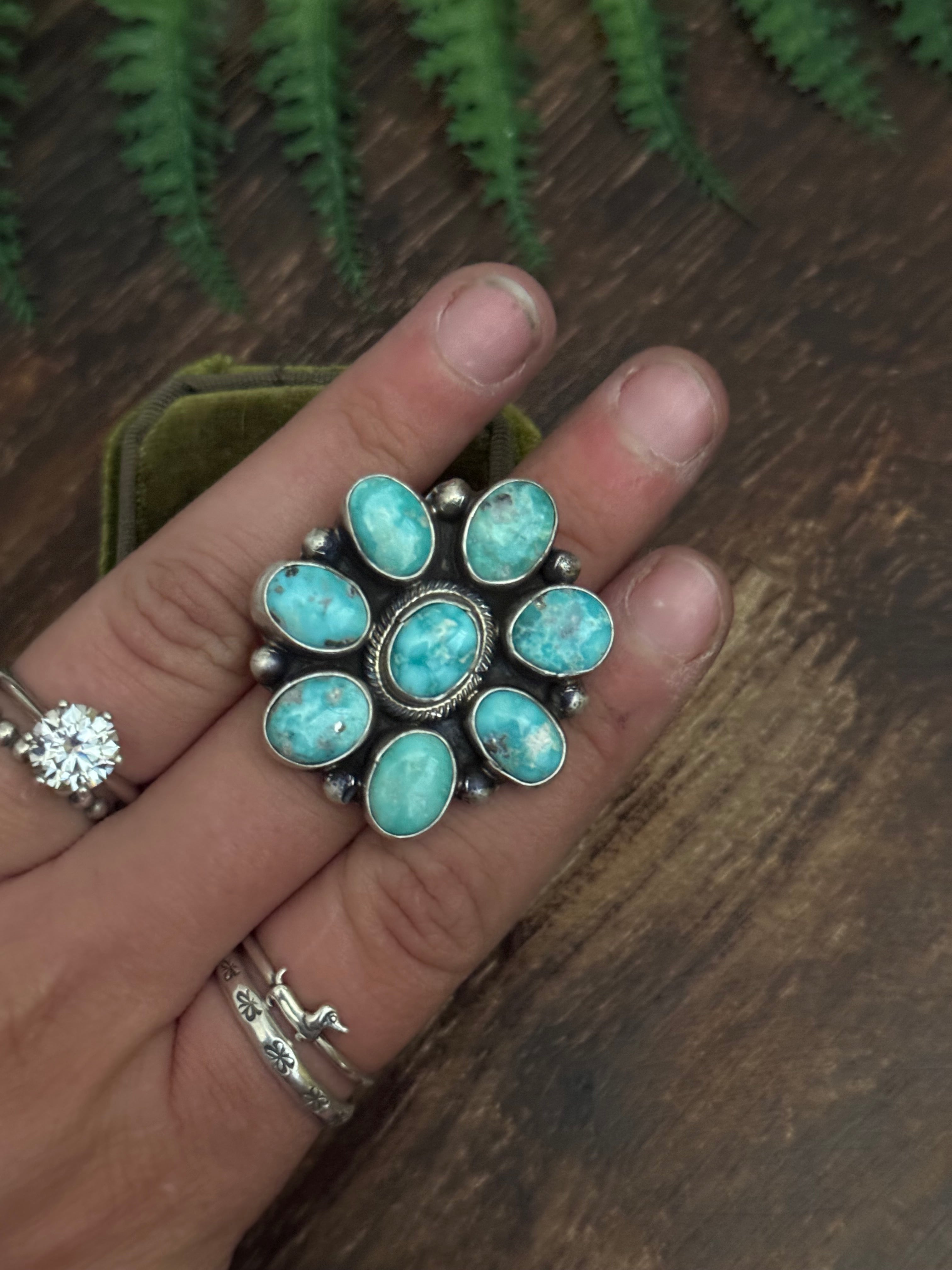Ella Peters Made White Water Turquoise & Sterling Sliver Cluster Ring Size 8. It measures 1 3/8 inches long and 1 3/8 inches wide. Signed by the artist and stamped sterling silver.