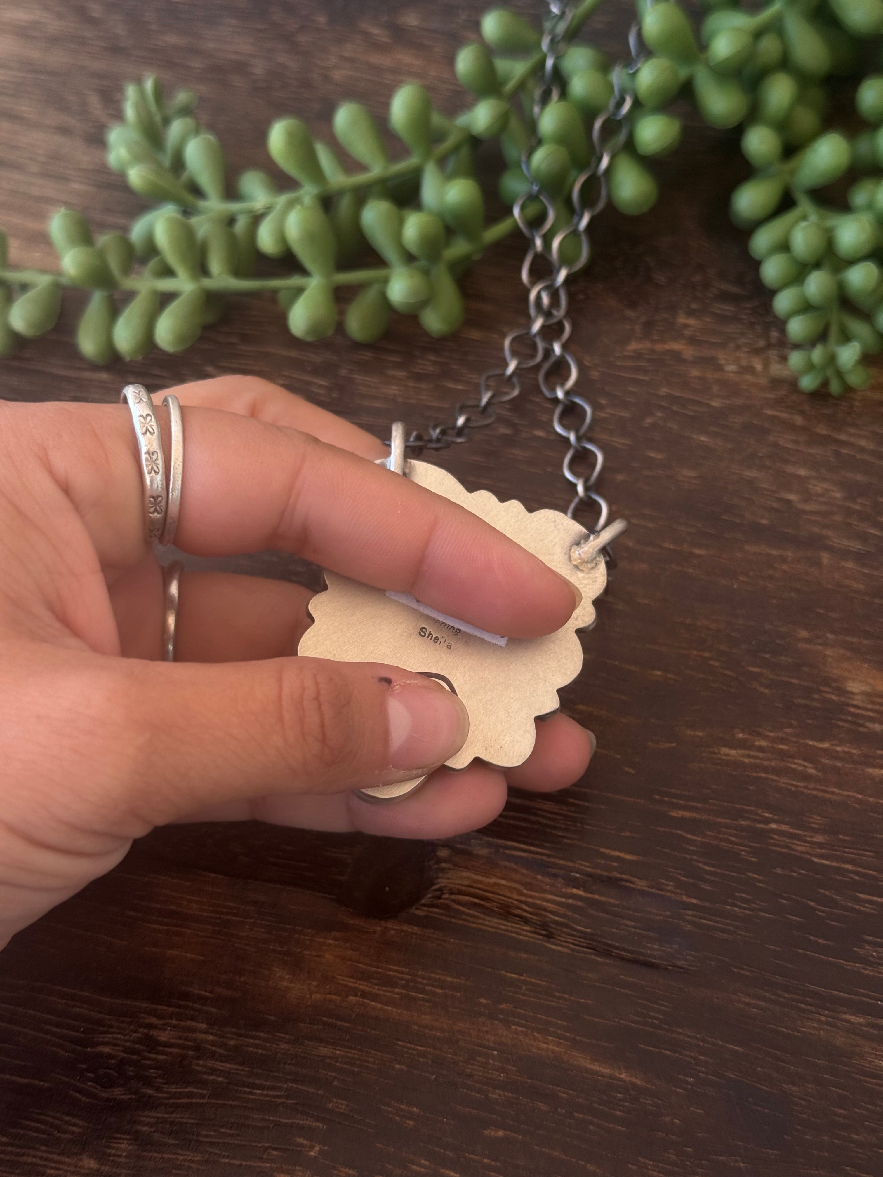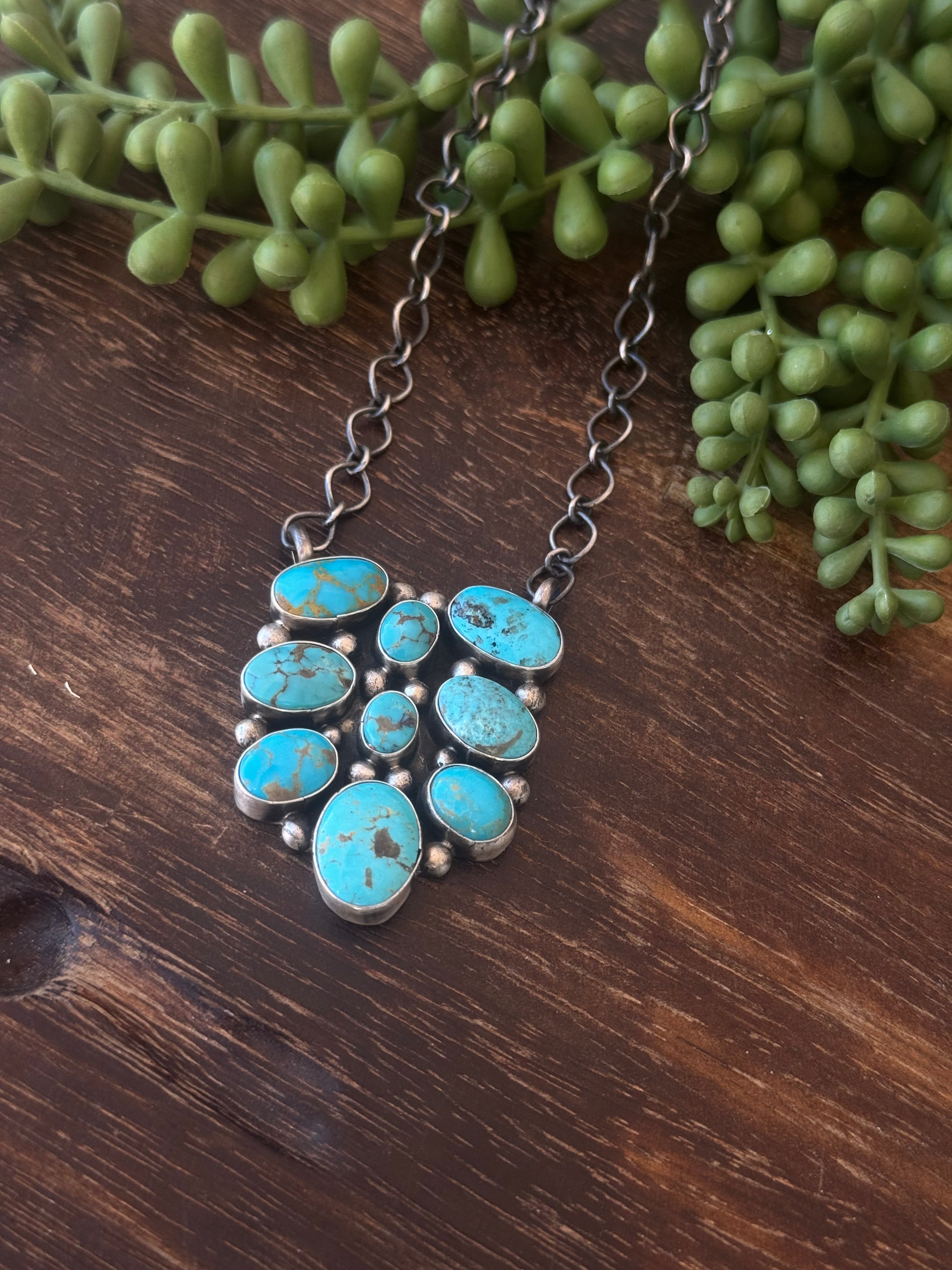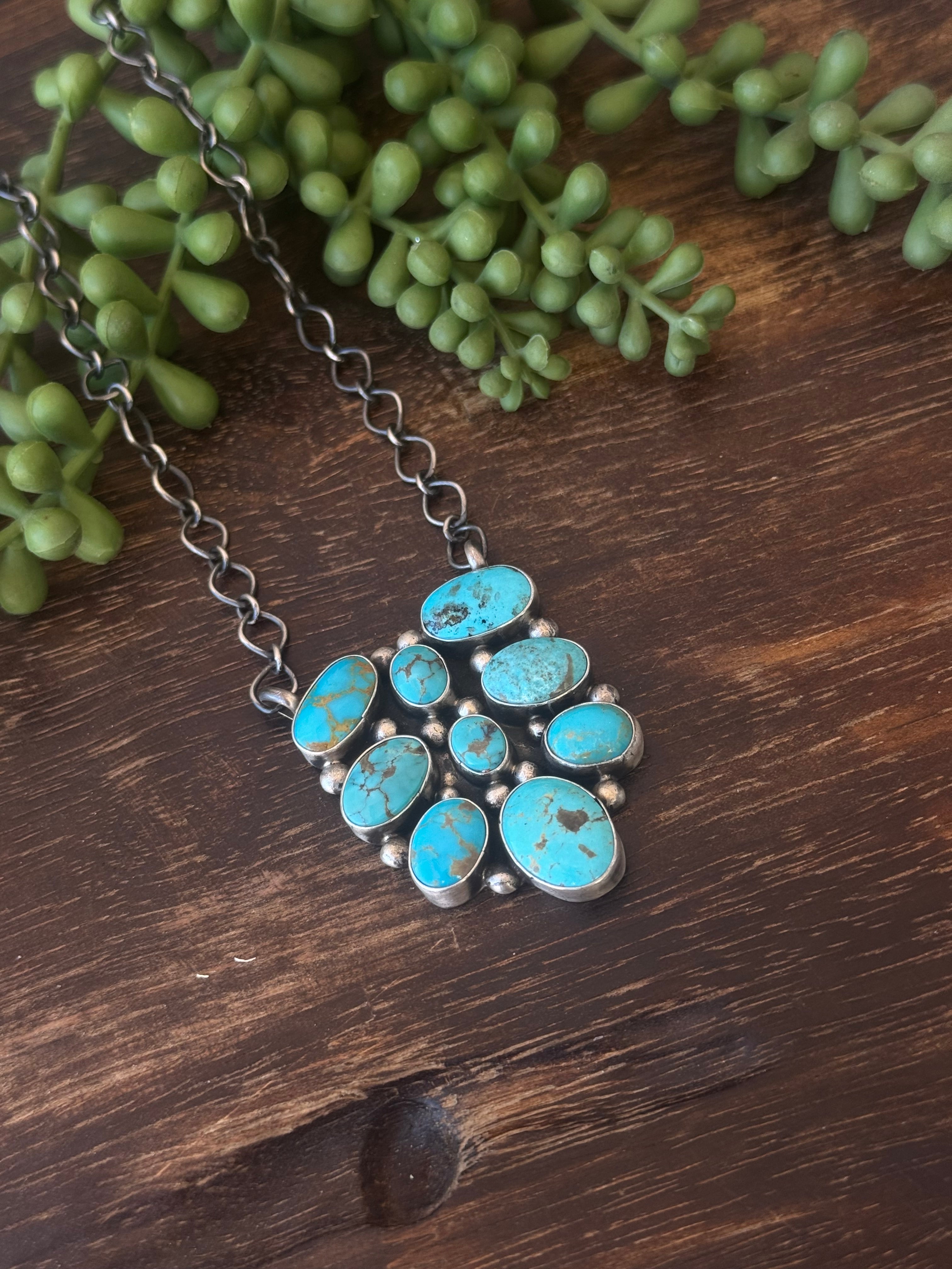 Sheila Becenti Mixed Turquoise & Sterling Sliver Cluster Necklace. It measures 24 inches long while the chain measure 20 inches. Signed by the artist and stamped sterling silver.