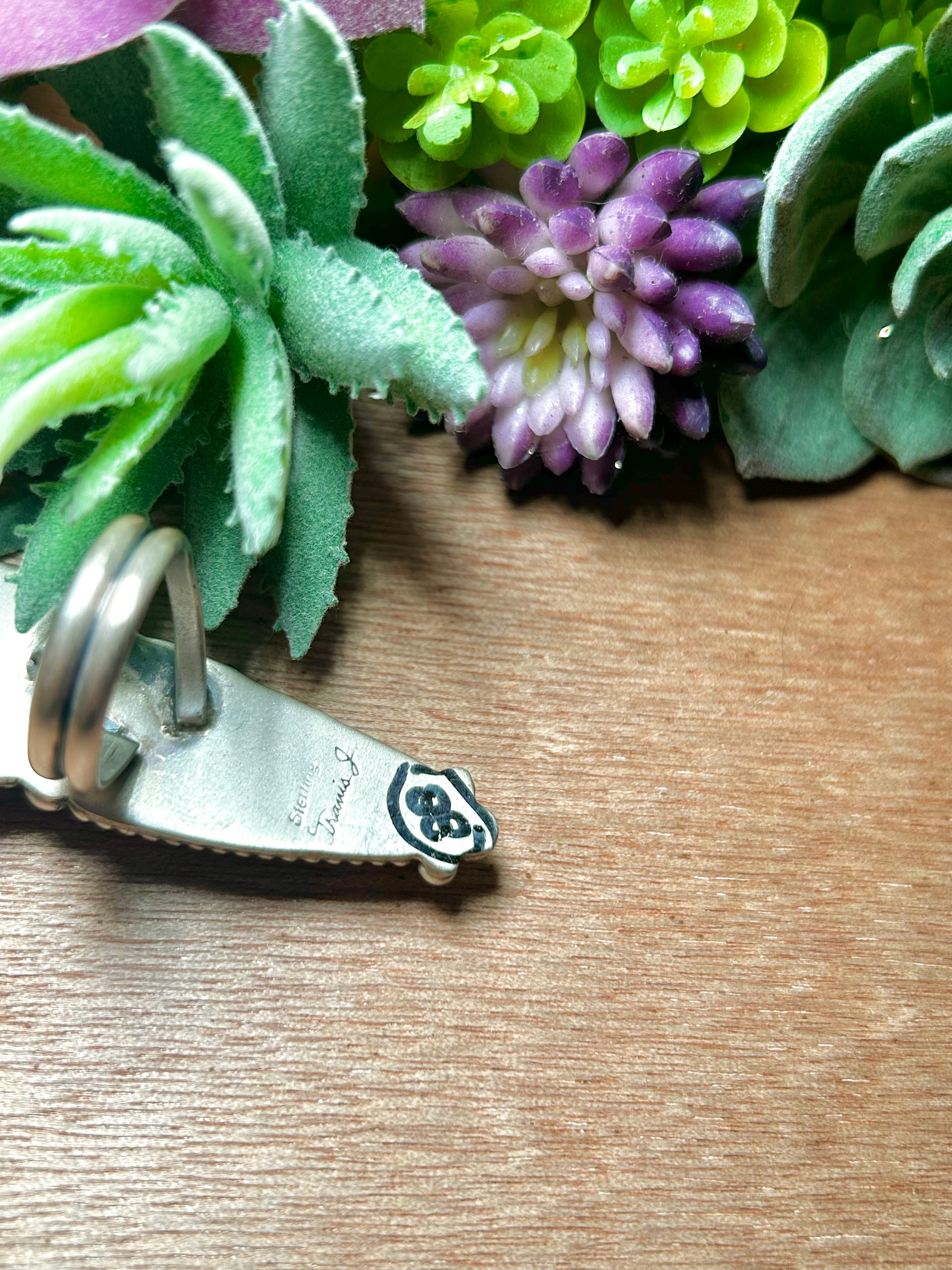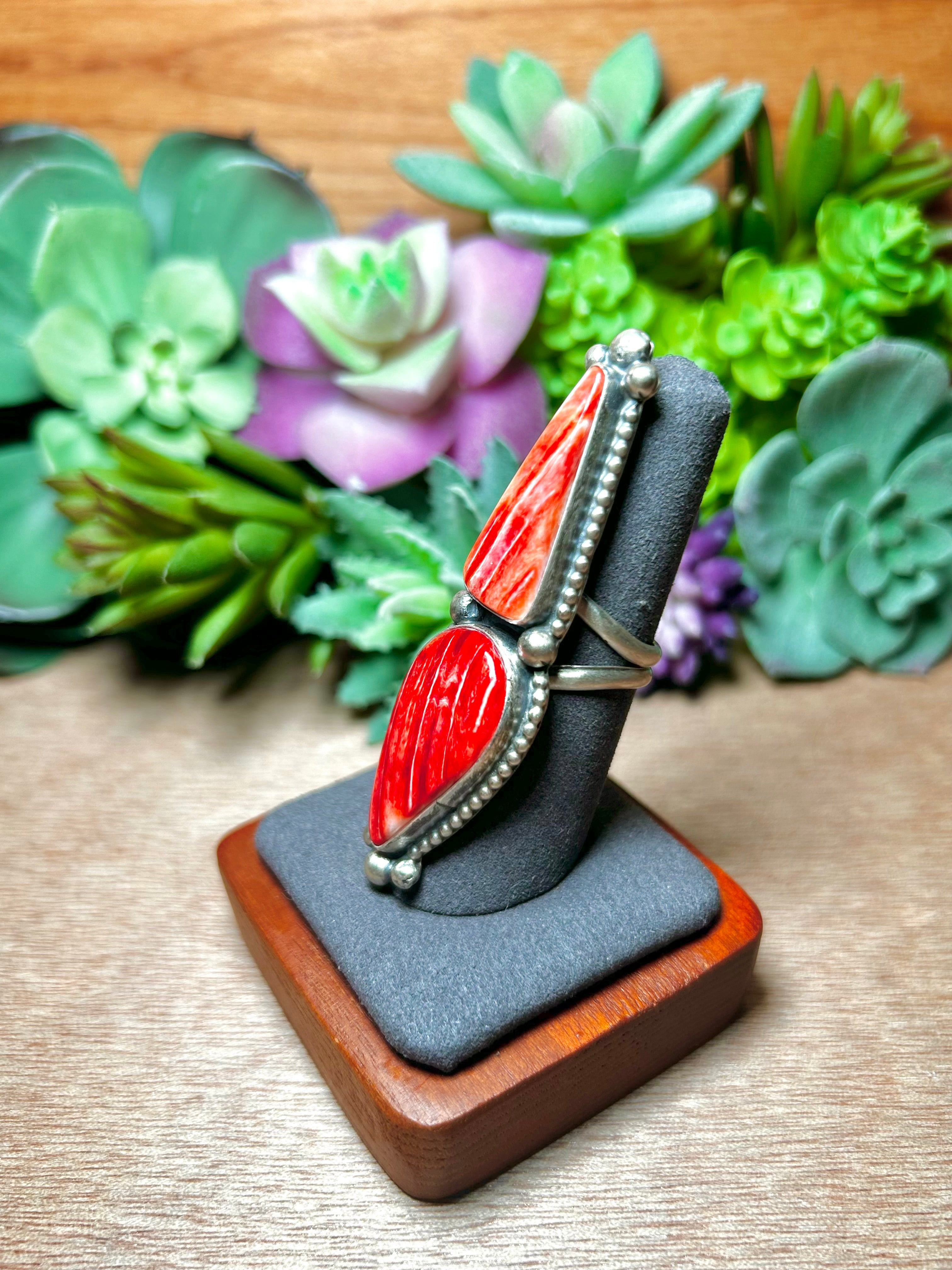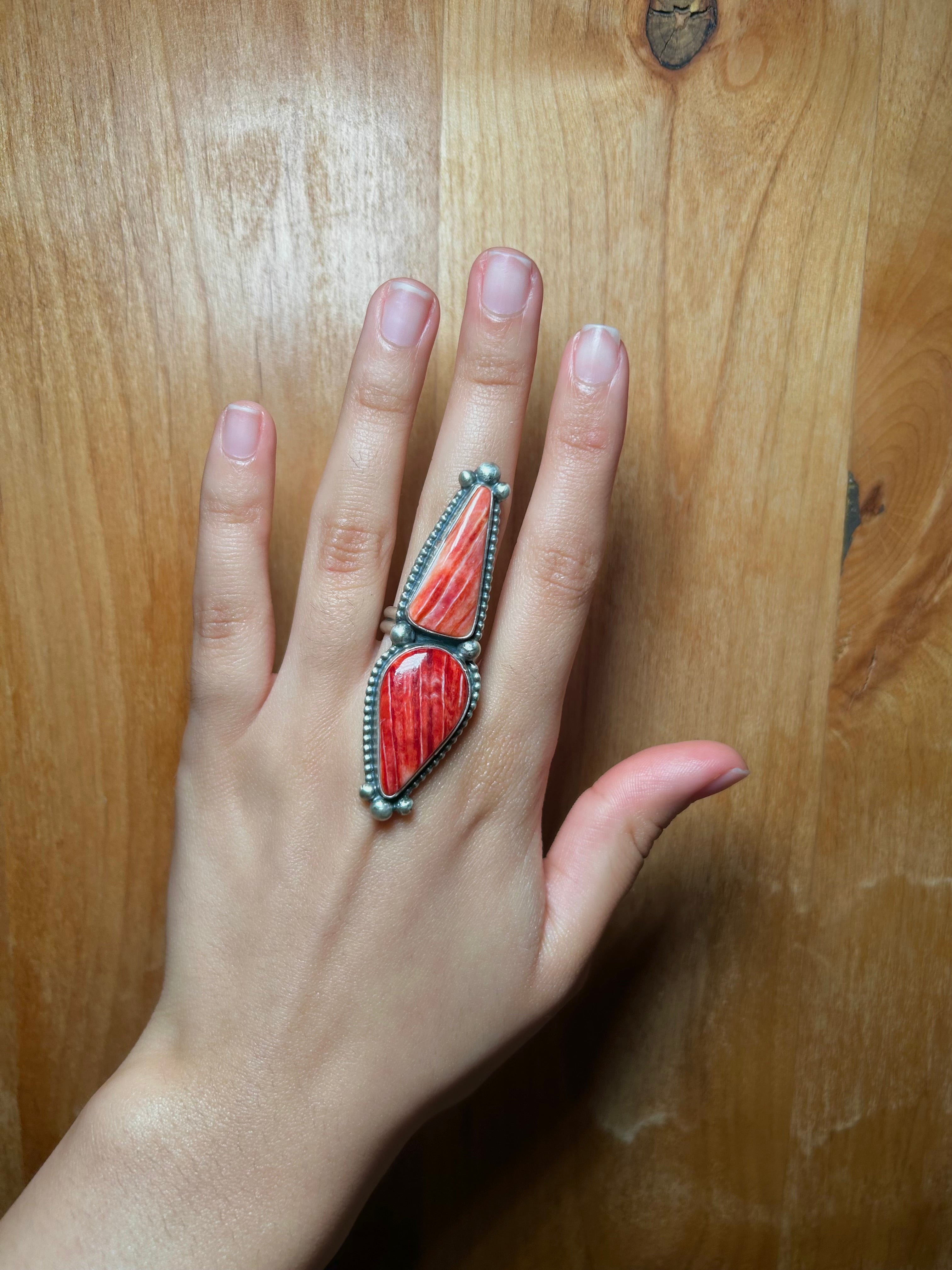 Travis Jim Spiny Oyster & Sterling Silver Adjustable Ring. It measures 2 5/8 inches long and 3/4 of an inch wide. Signed by the artist and stamped sterling silver.