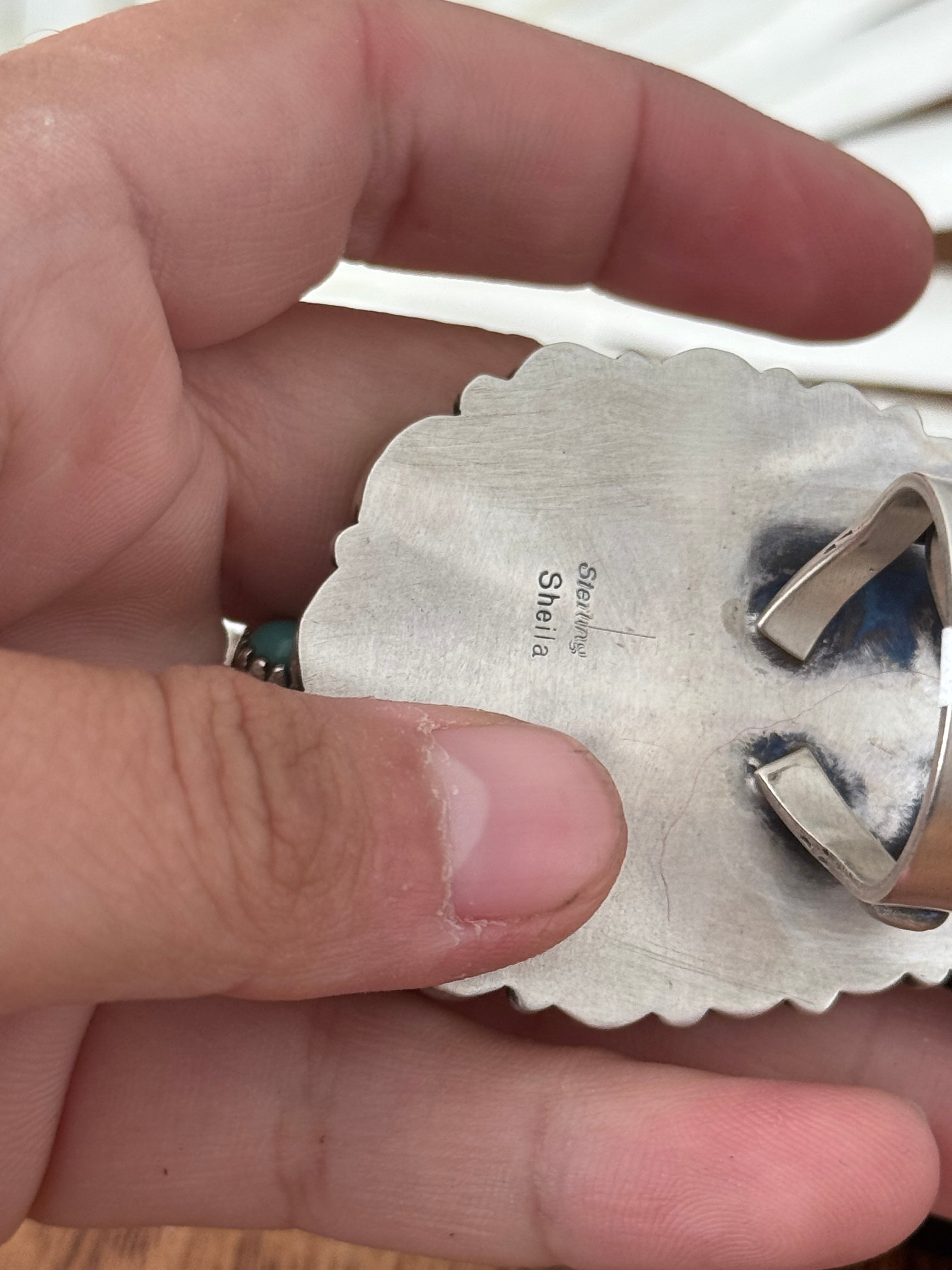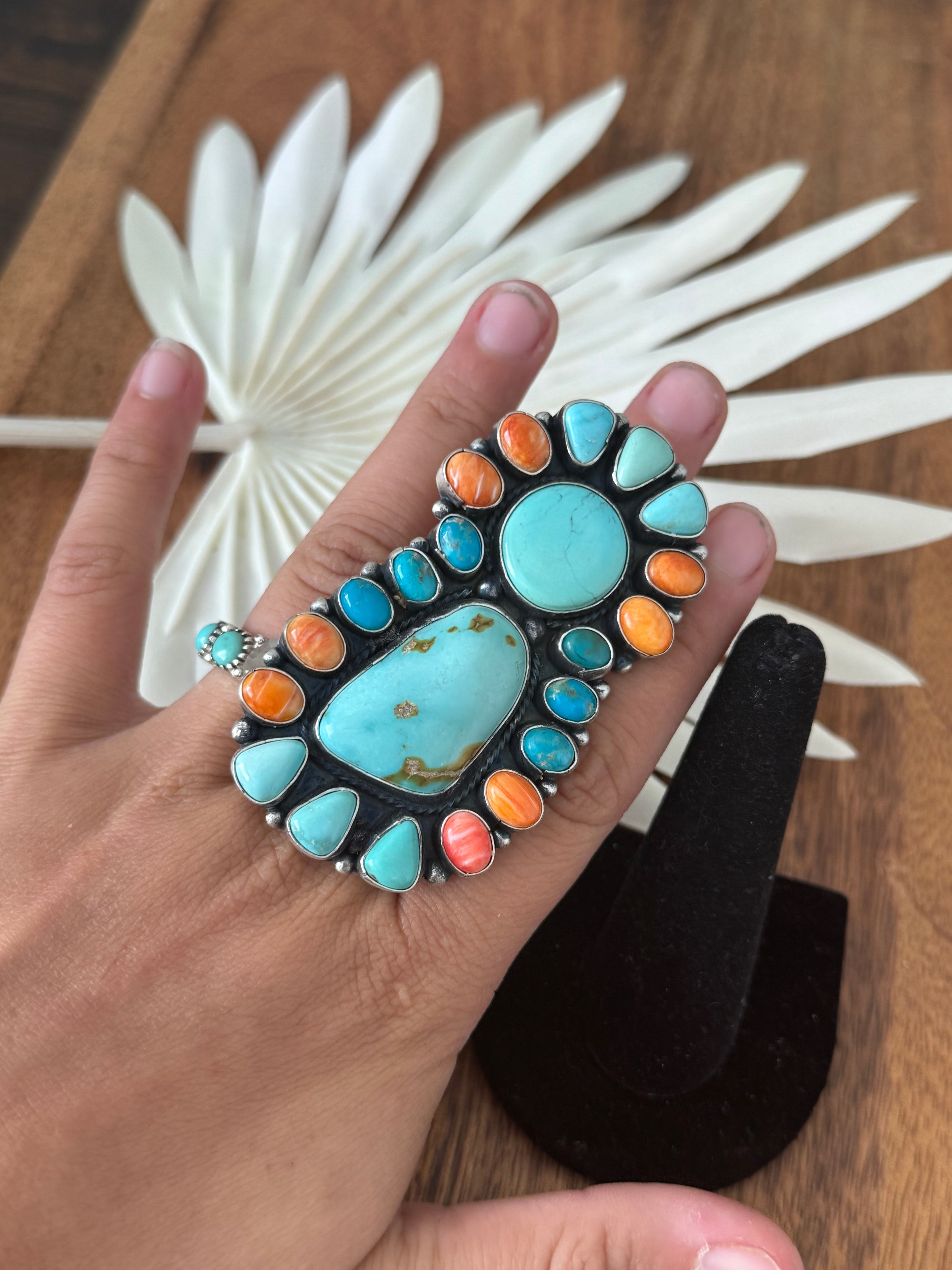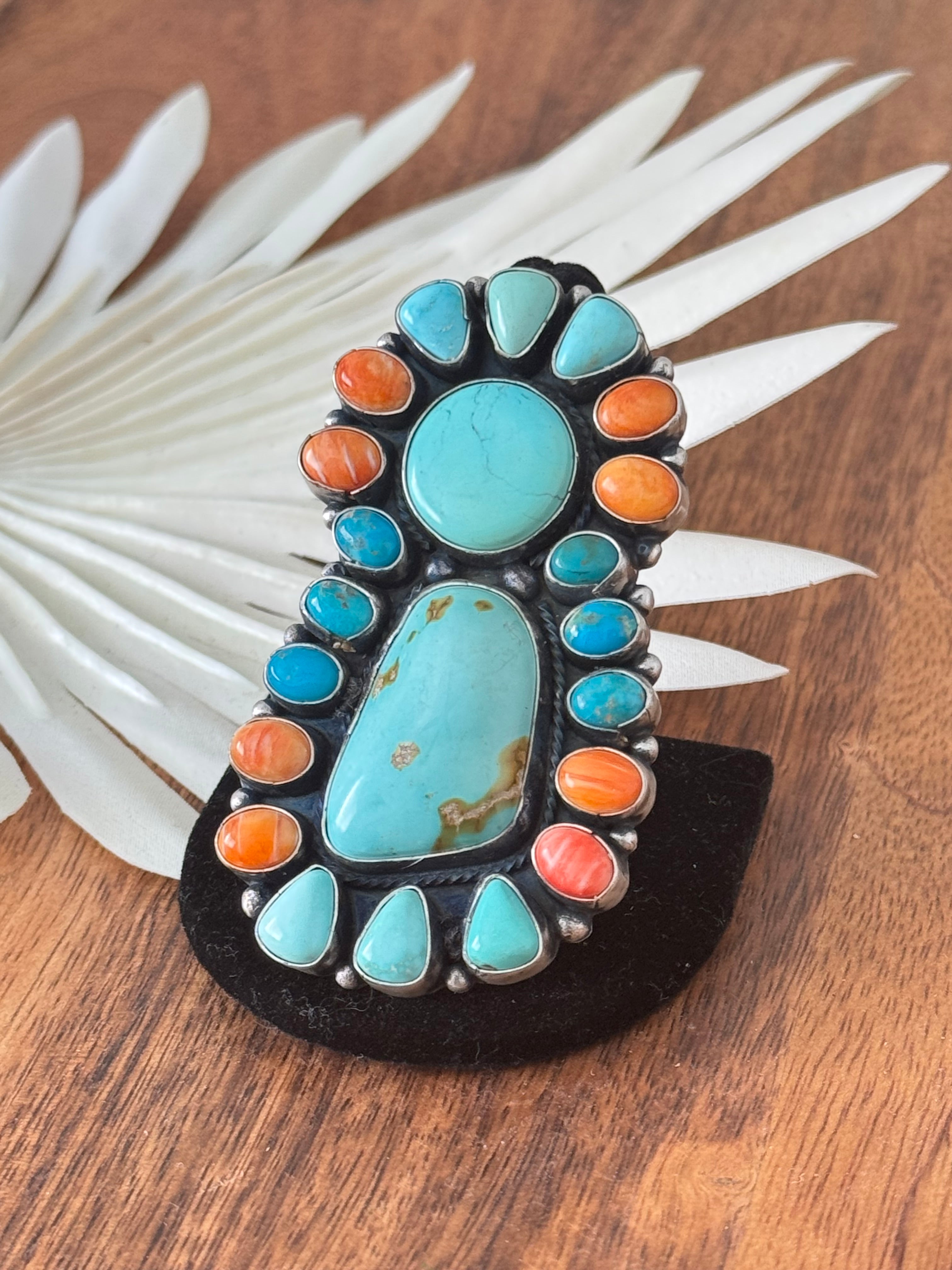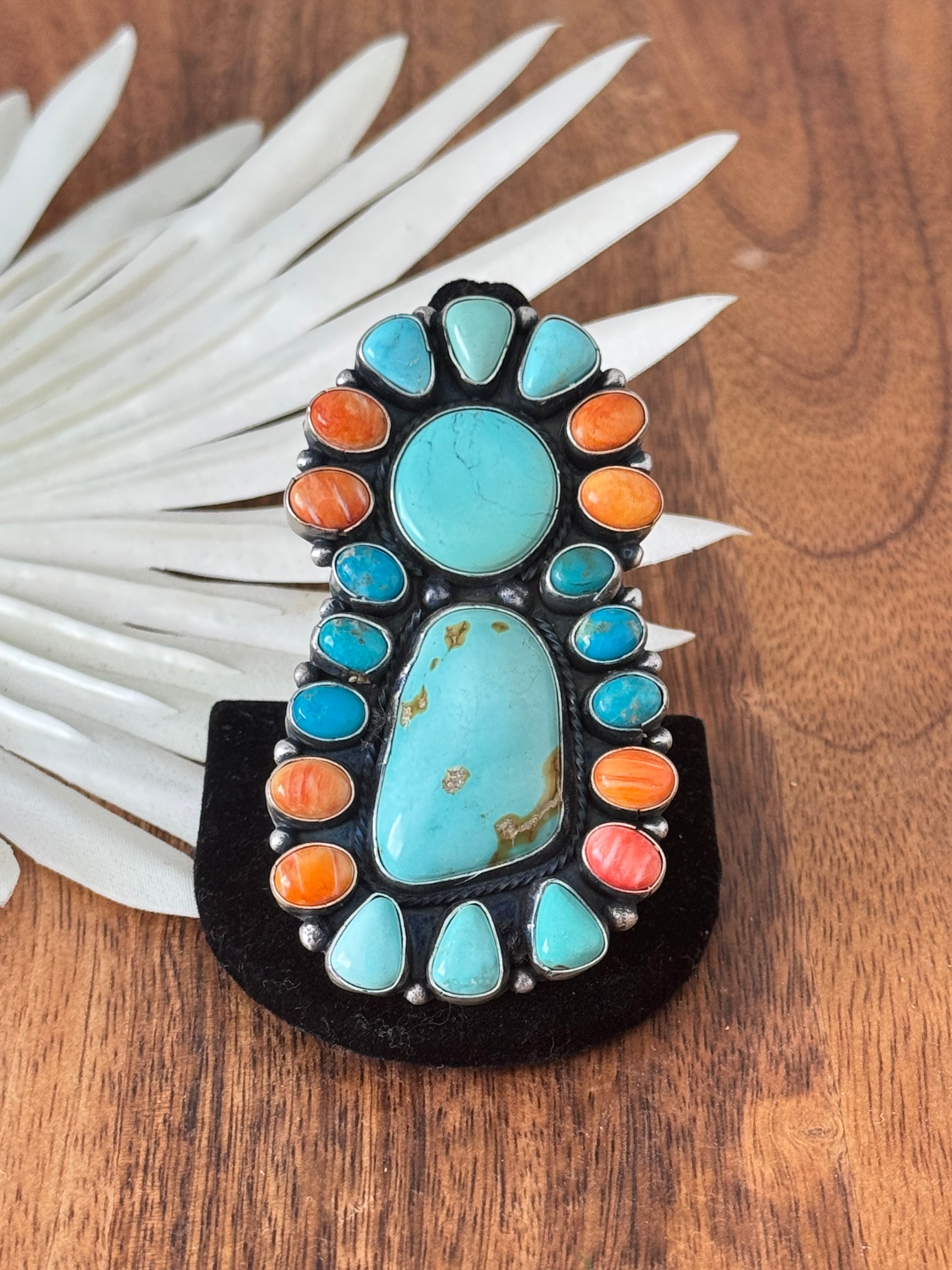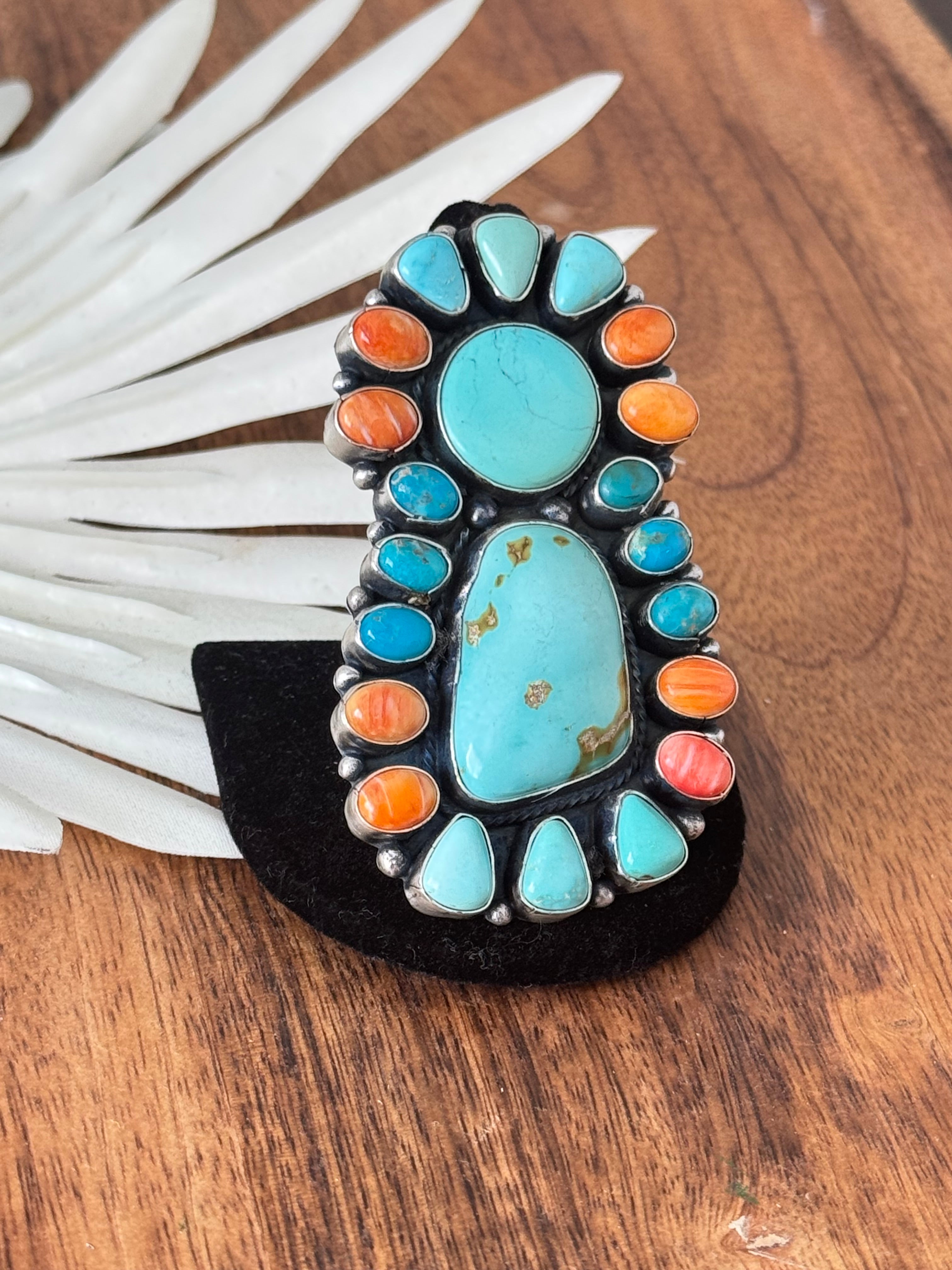 Sheila Becenti Multi Stone & Sterling Silver Cluster Ring Size 10.5. It measures 2 3/4 inches long and 1 1/2 inches wide. Signed by the artist and stamped sterling silver.