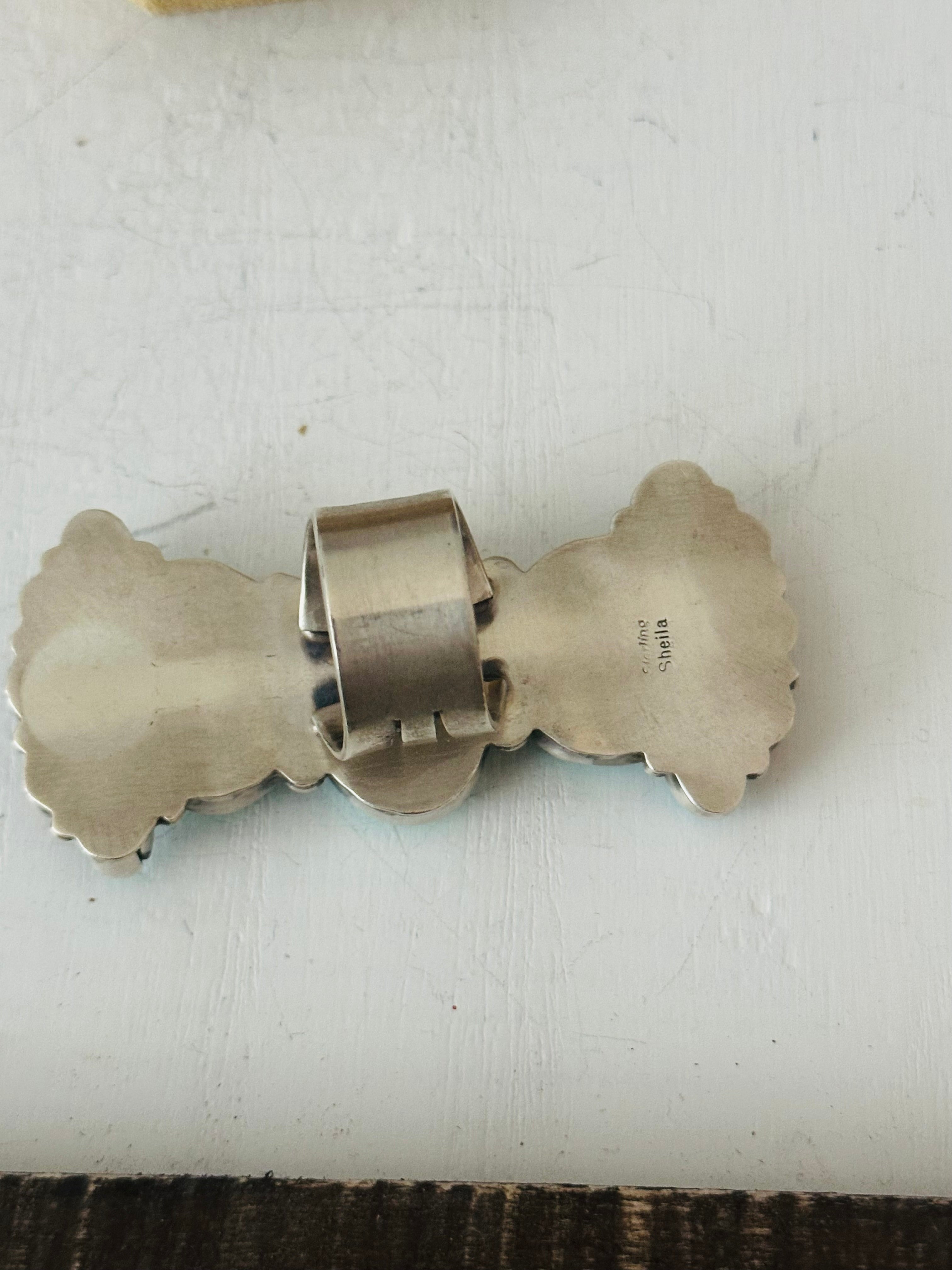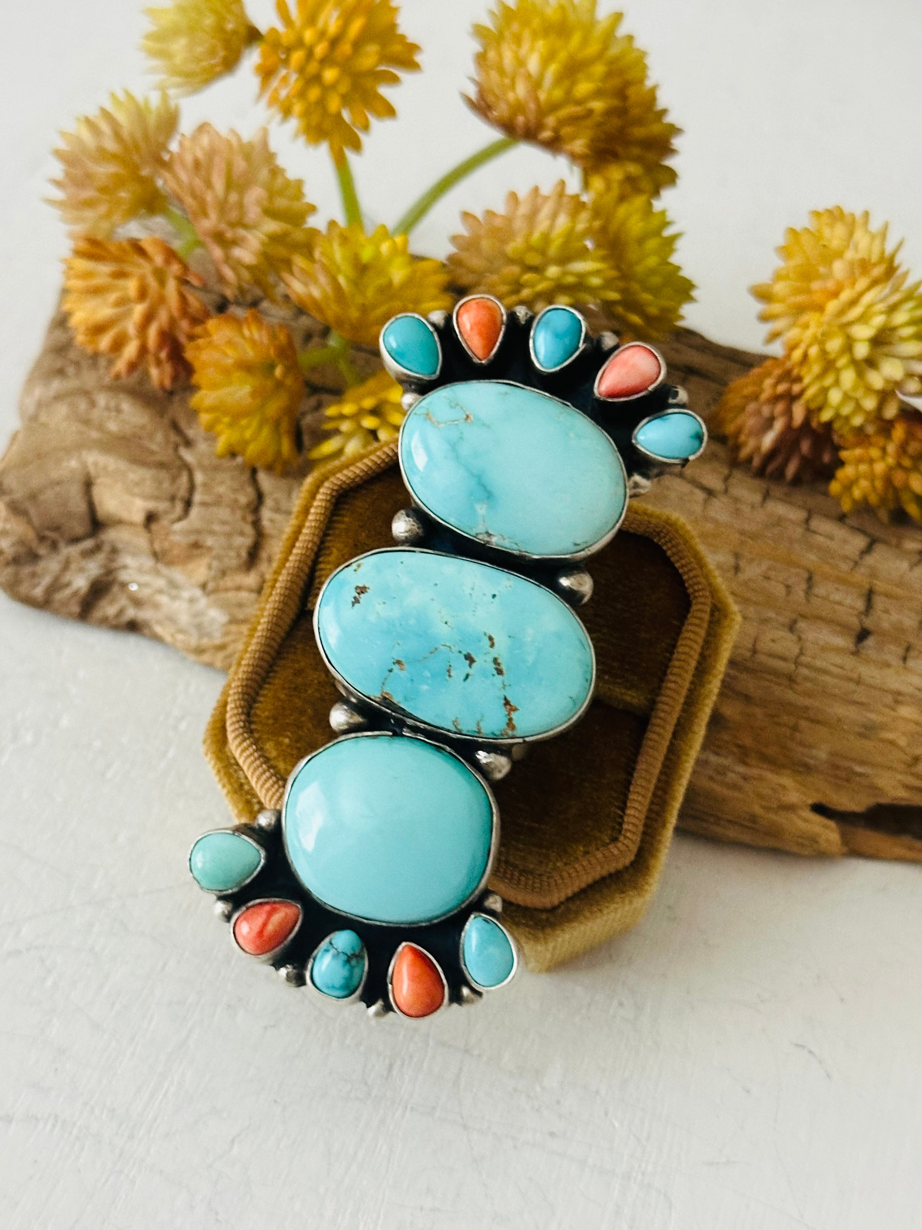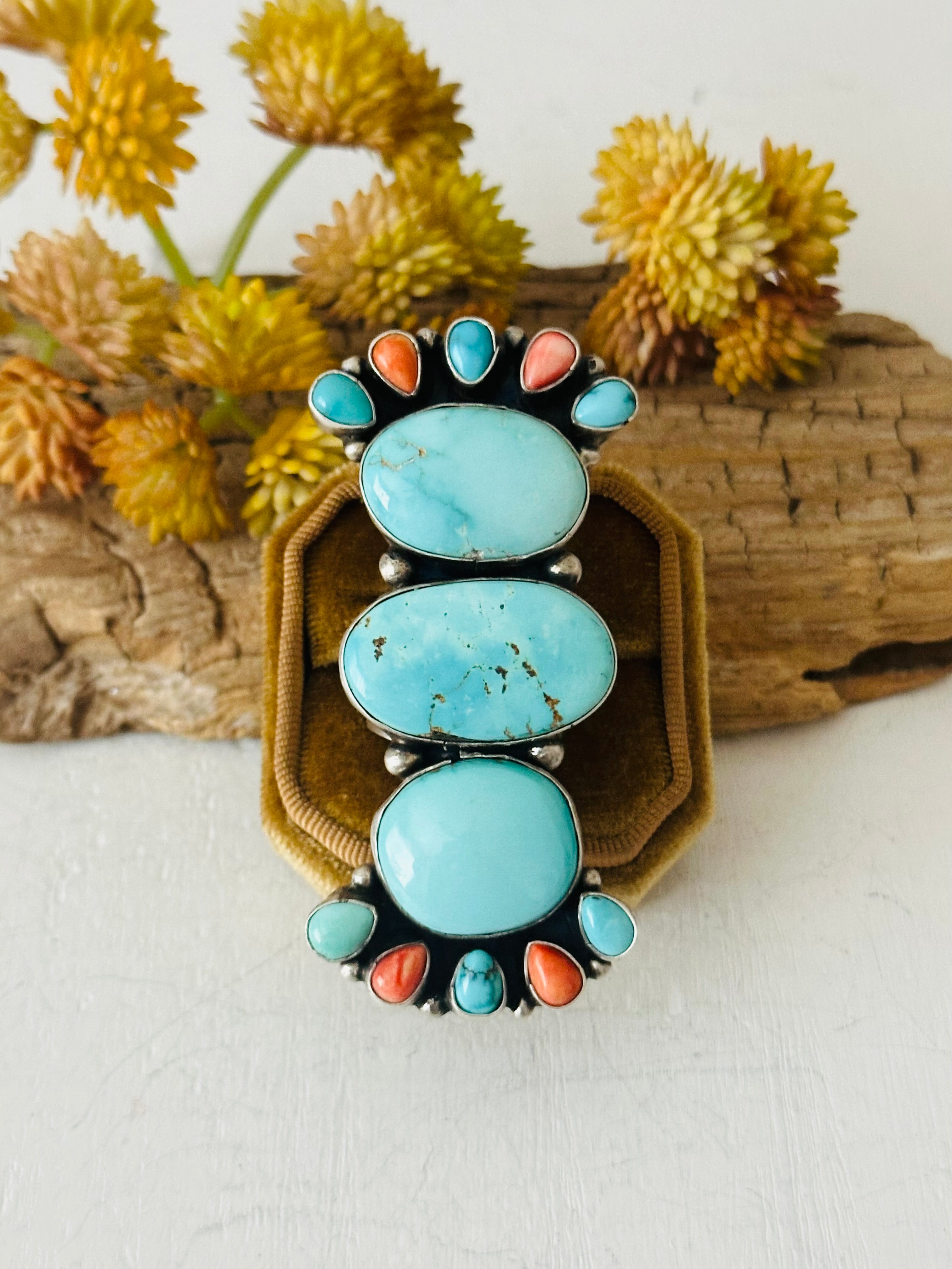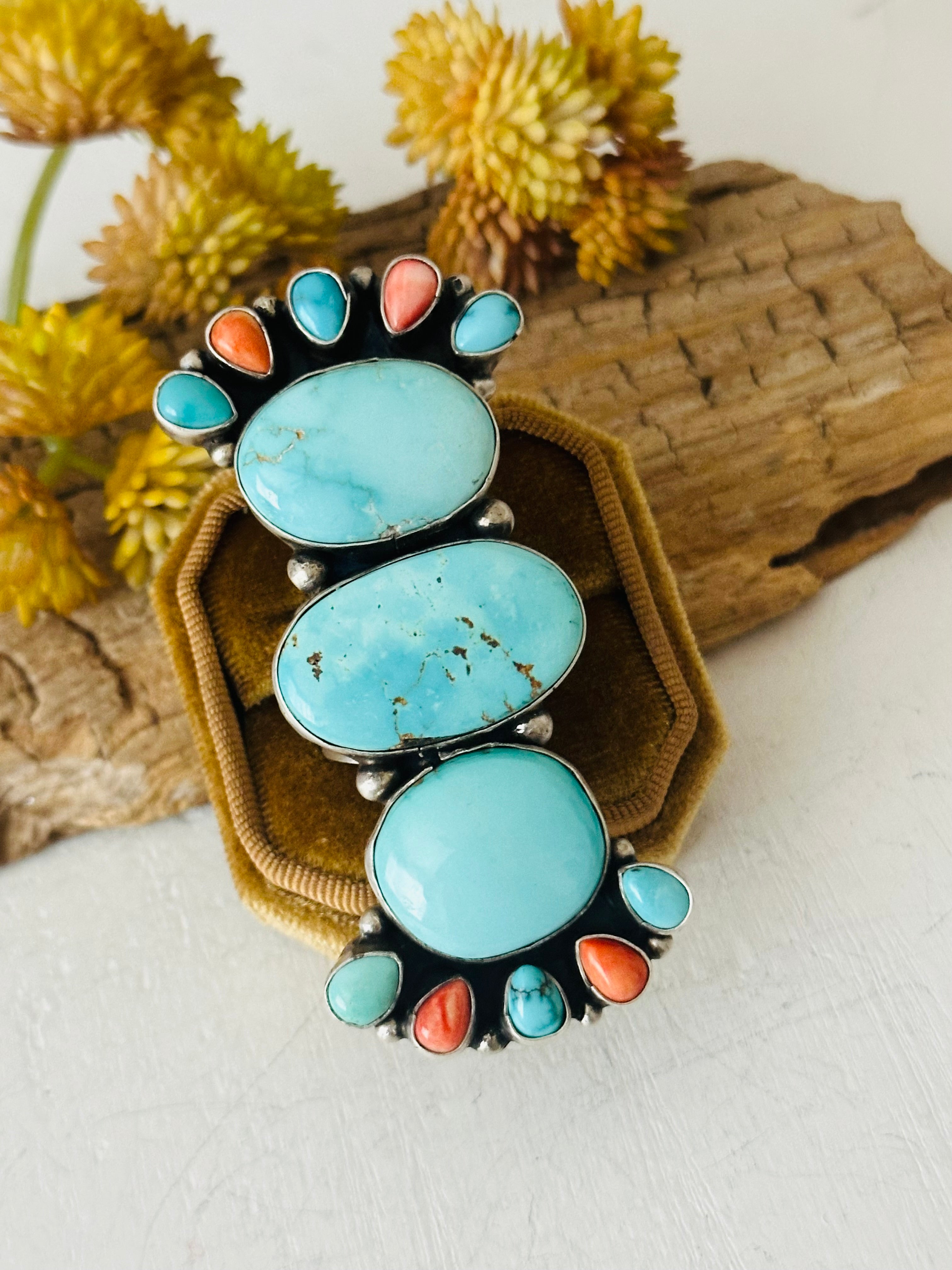 Sheila Becenti Multi Stone & Sterling Silver Cluster Ring Size 8.75. It measures 3 inches long and 1 3/8 inches wide. Signed by the artist and stamped sterling silver.