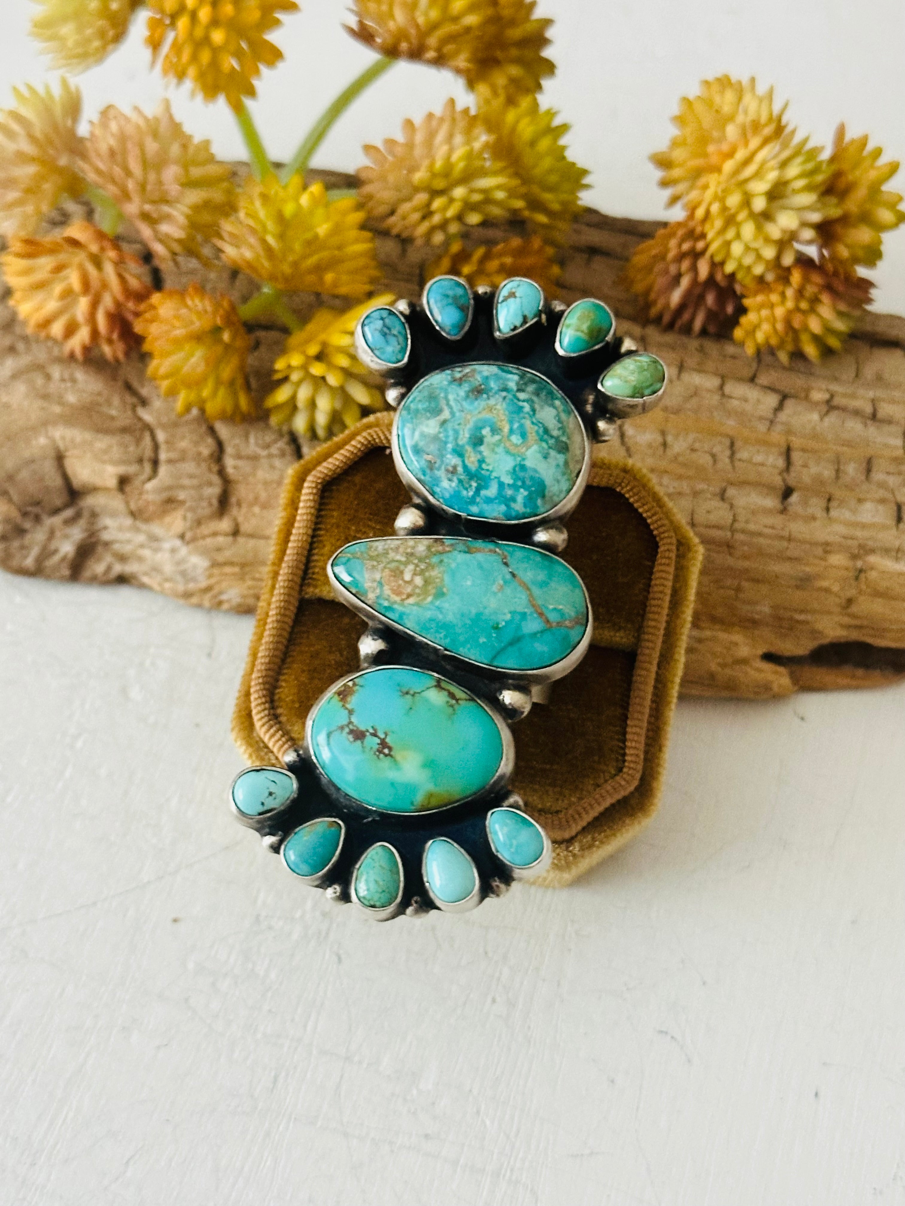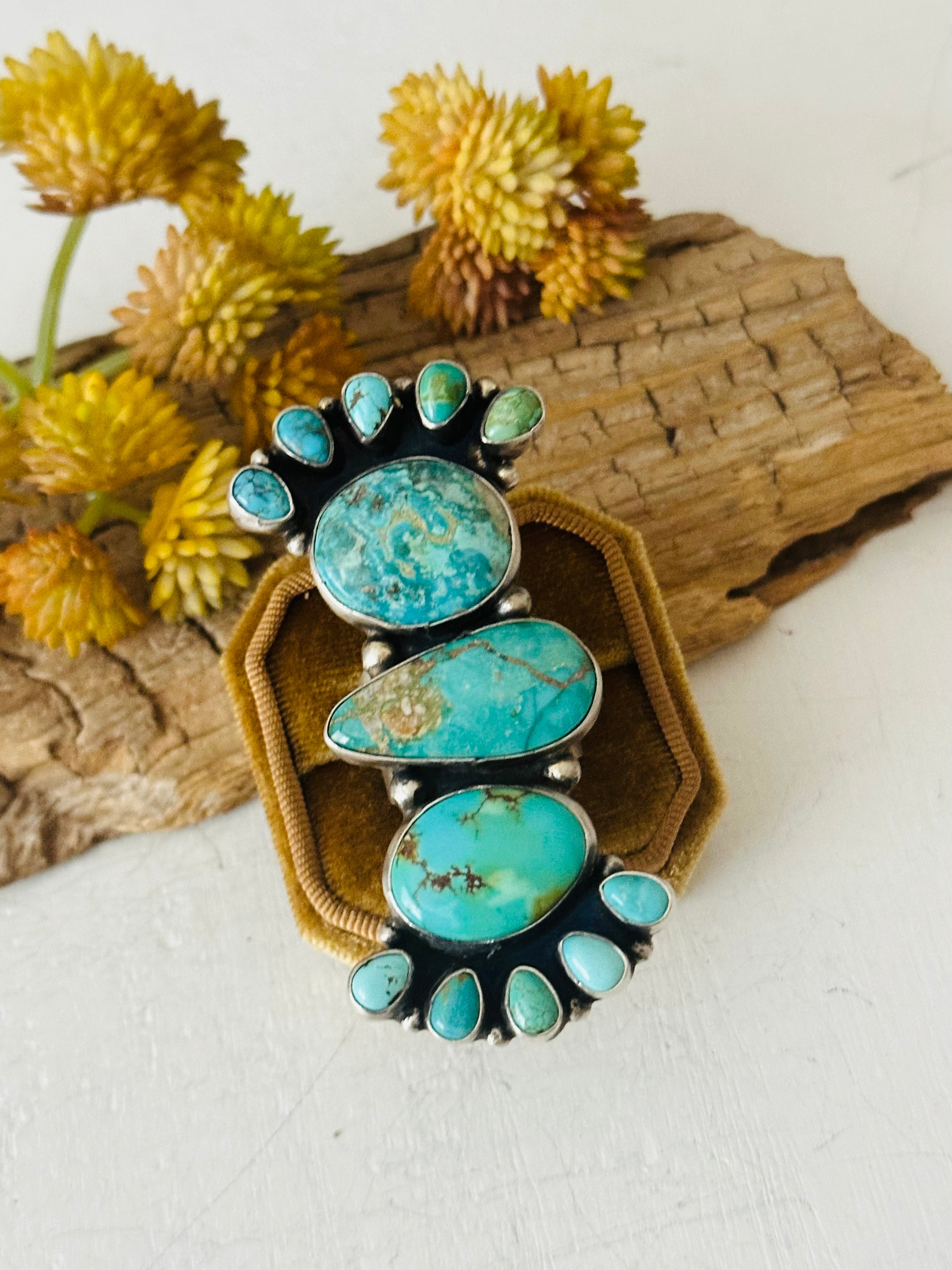 Sheila Becenti Royston Turquoise & Sterling Silver Cluster Ring Size 8.75. It measures 3 inches long and 1 3/8 inches wide. Signed by the artist and stamped sterling silver.