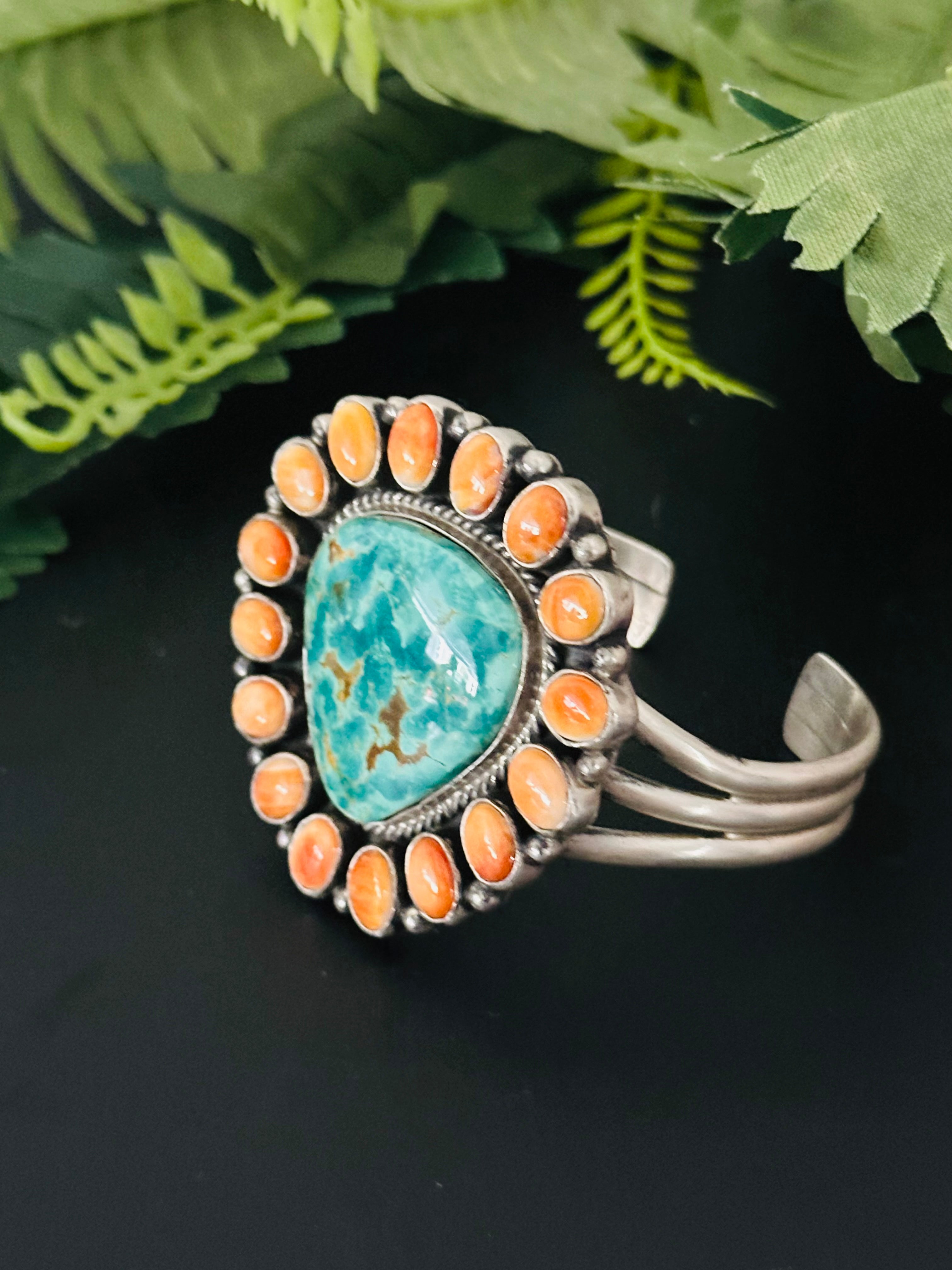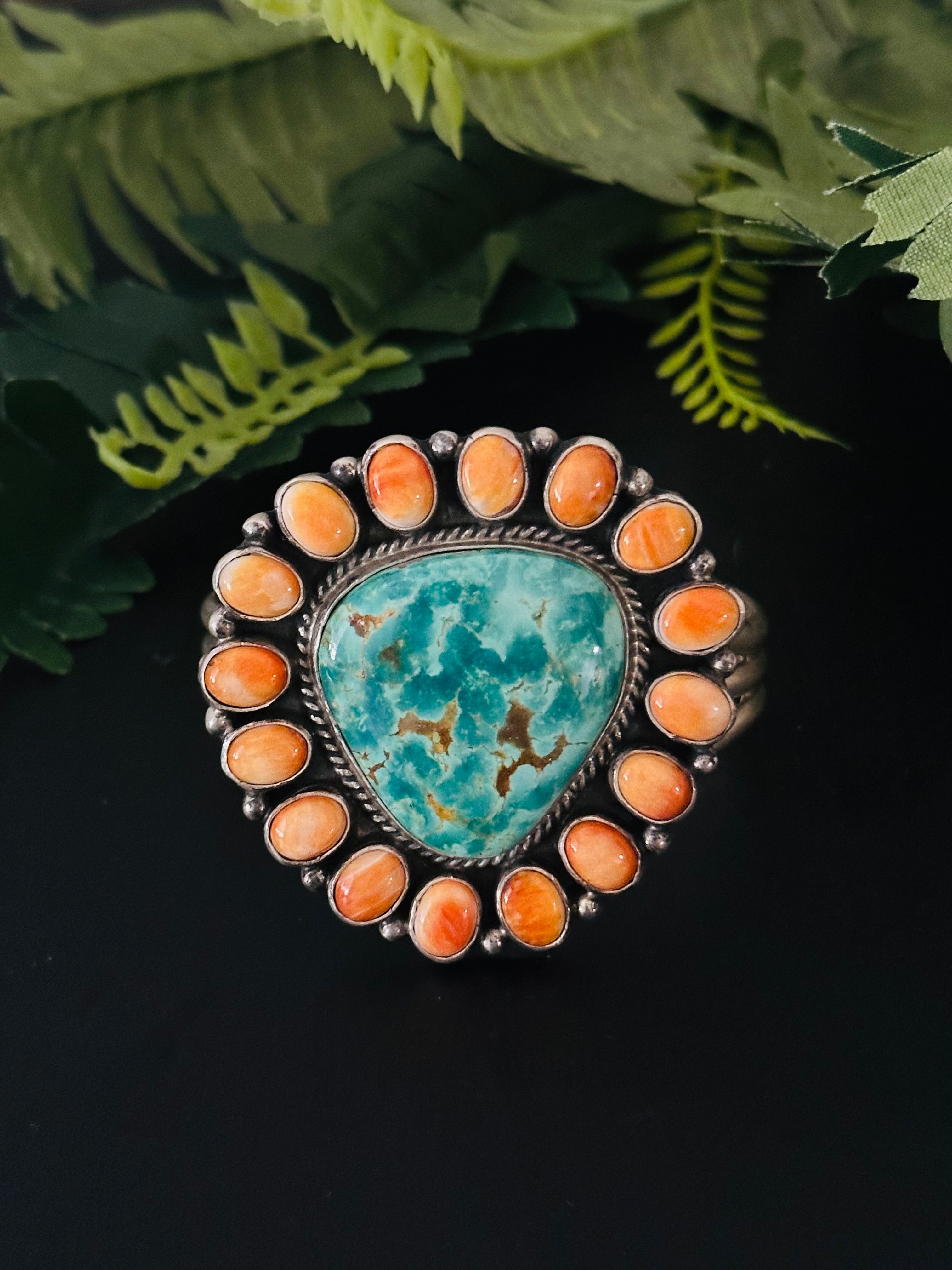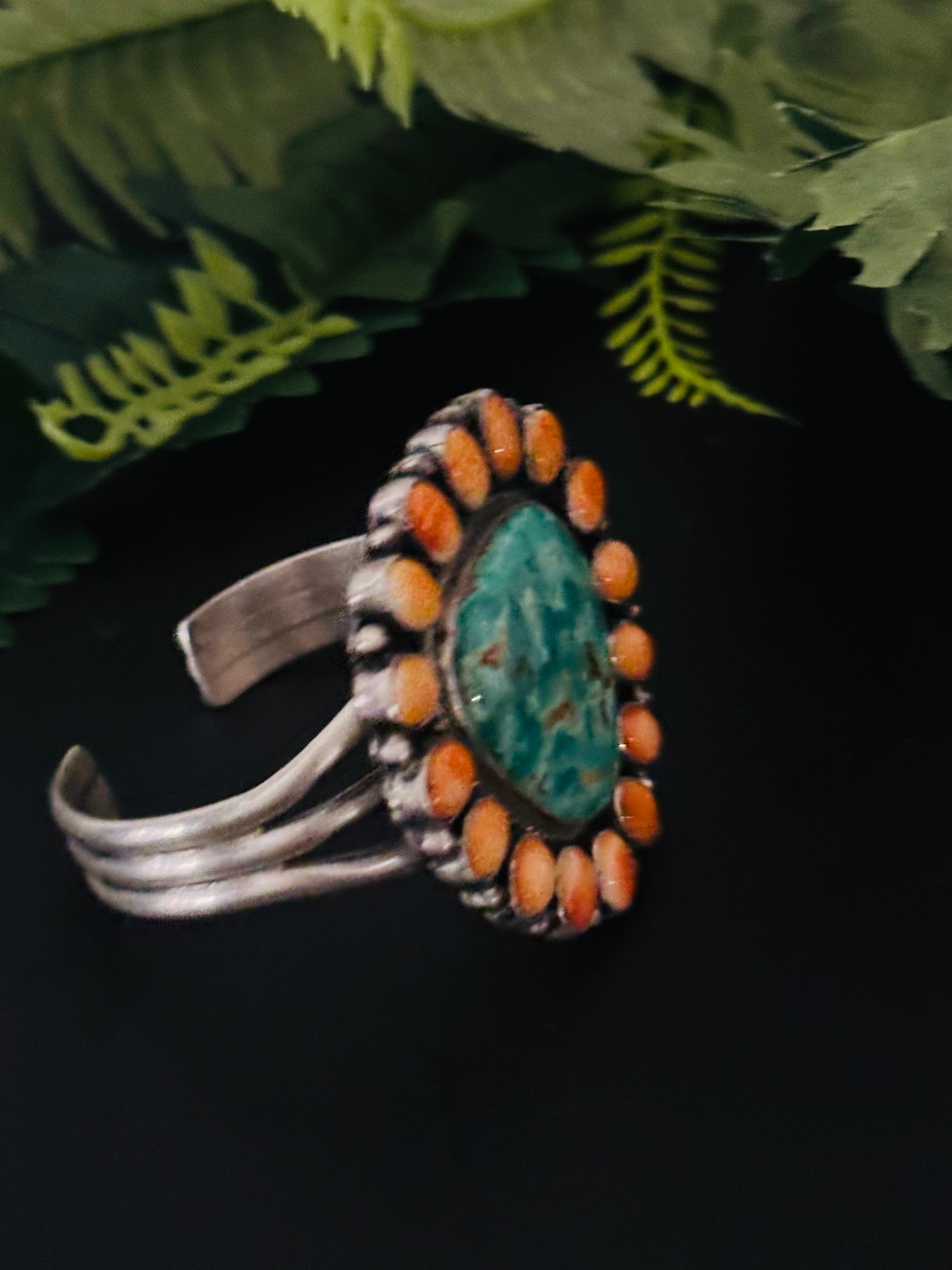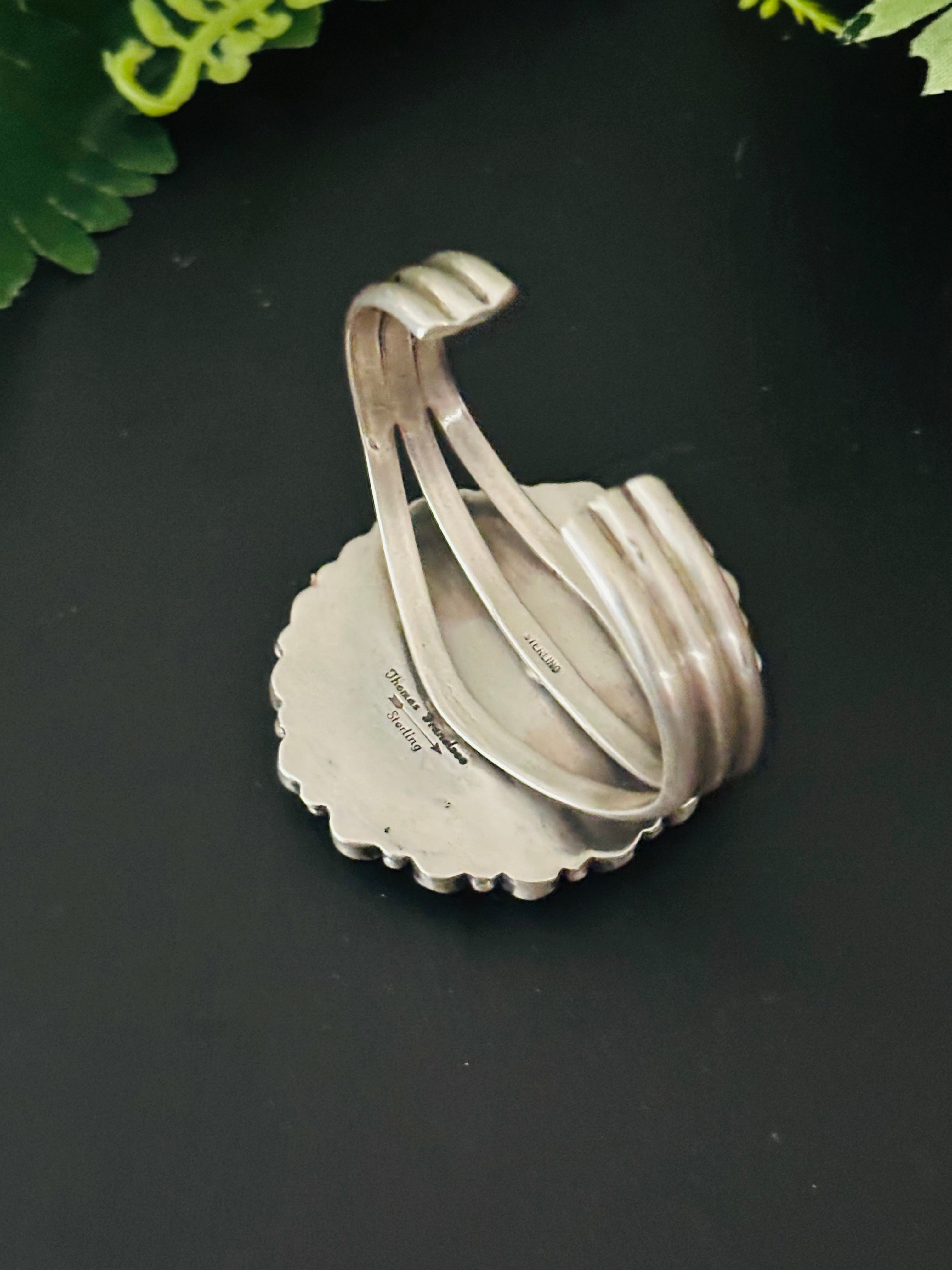 Thomas Francisco Multi Stone & Sterling Silver Cuff Bracelet. It measures 2 inches wide with an inside circumference of 5 3/8 inches and a gap of 1 inch. Signed by the artist and stamped sterling silver.
