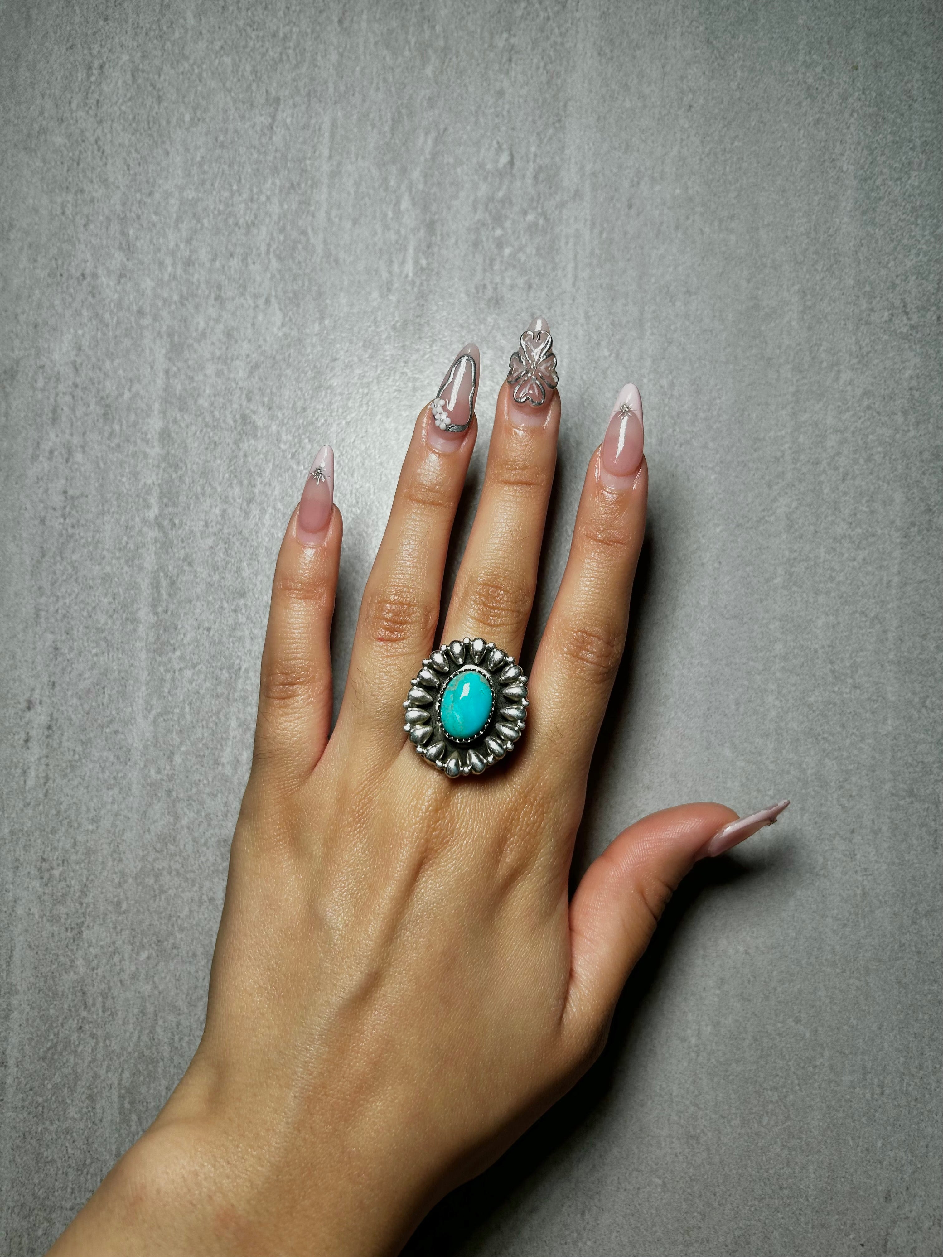 Navajo Made Kingman Turquoise & Sterling Silver Adjustable Ring. It measures 1 1/8 inches long and 1 inch wide. Stamped sterling silver and signed.