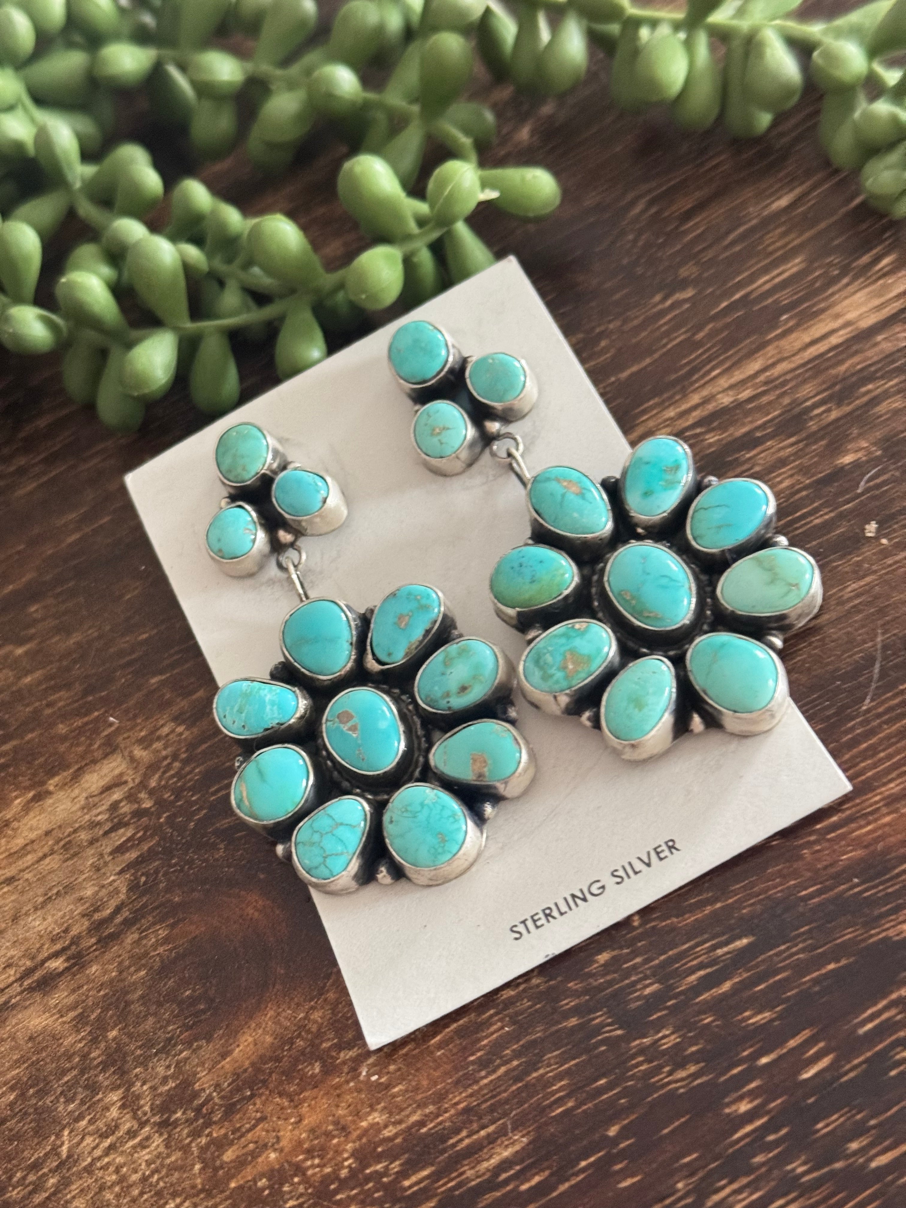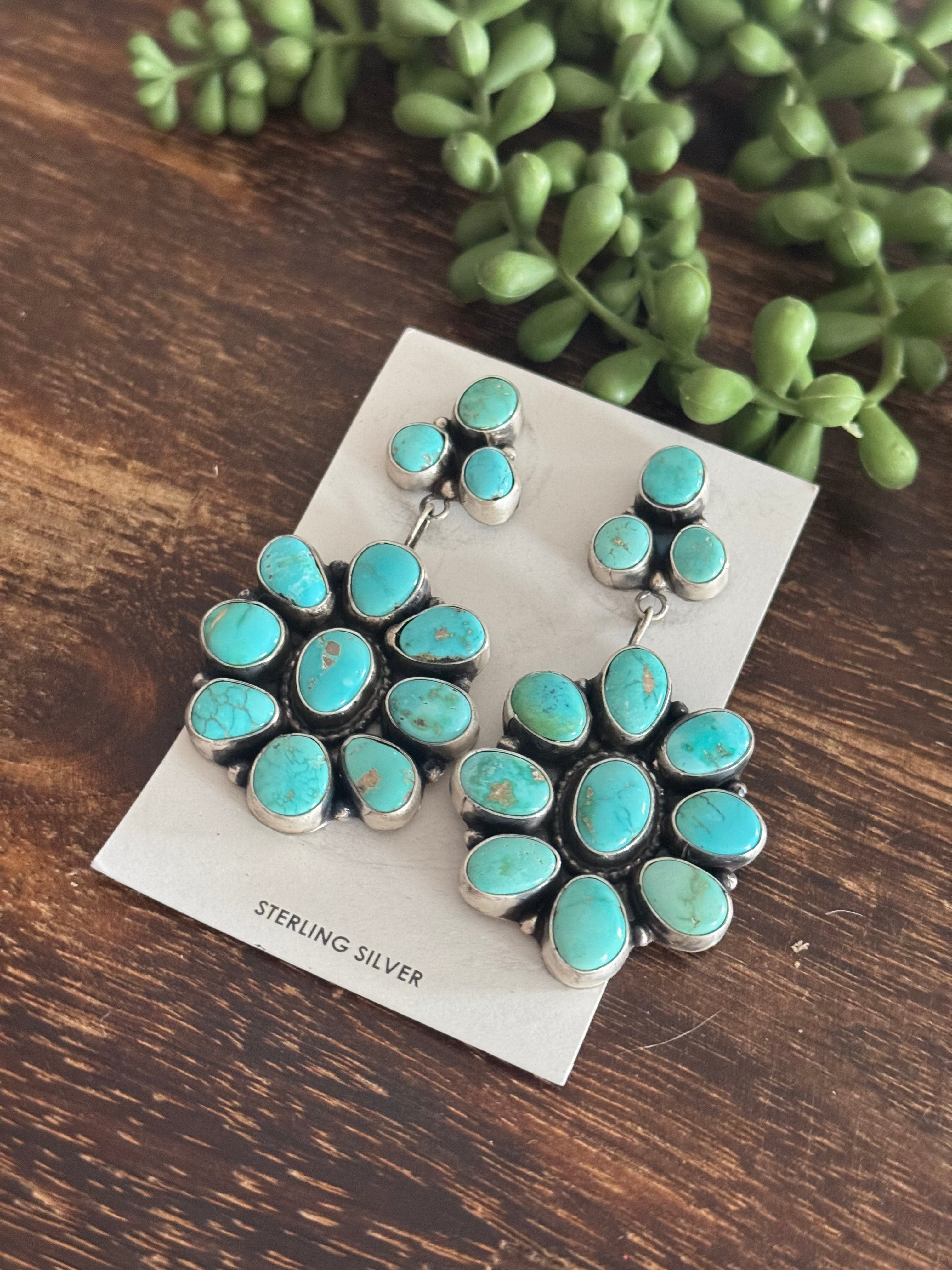 Lydia Begay Royston Turquoise & Sterling Silver Post Dangle Cluster Earrings. They measure 2 7/8 inches long and 1 1/2 inches wide. Signed by the artist and stamped sterling silver.