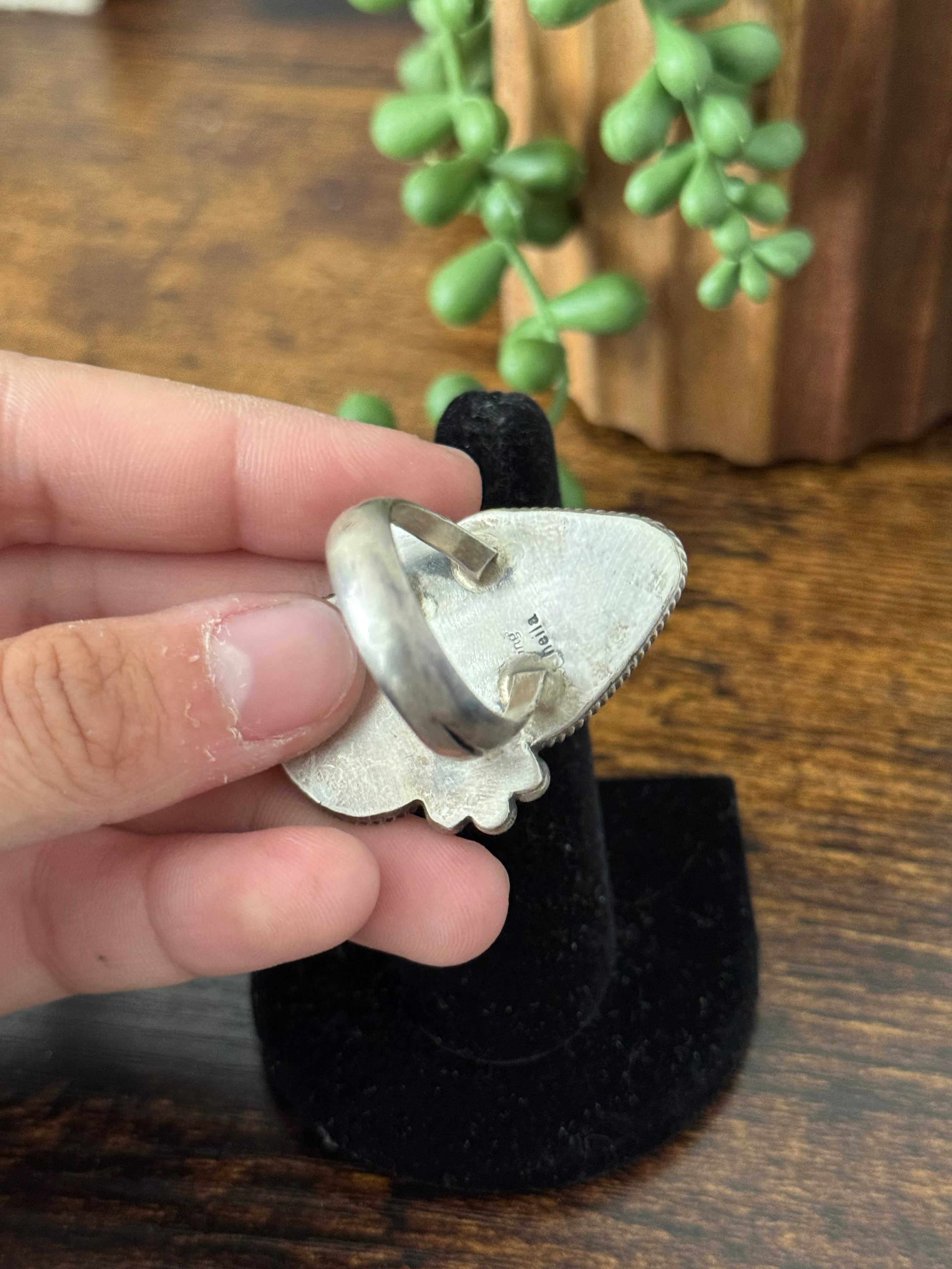 Sheila Becenti Sonoran Mountain Turquoise & Sterling Silver Ring Size 10. It measures 1 5/8 inches long and 1 1/4 inches wide. Signed by the artist and stamped sterling silver.
