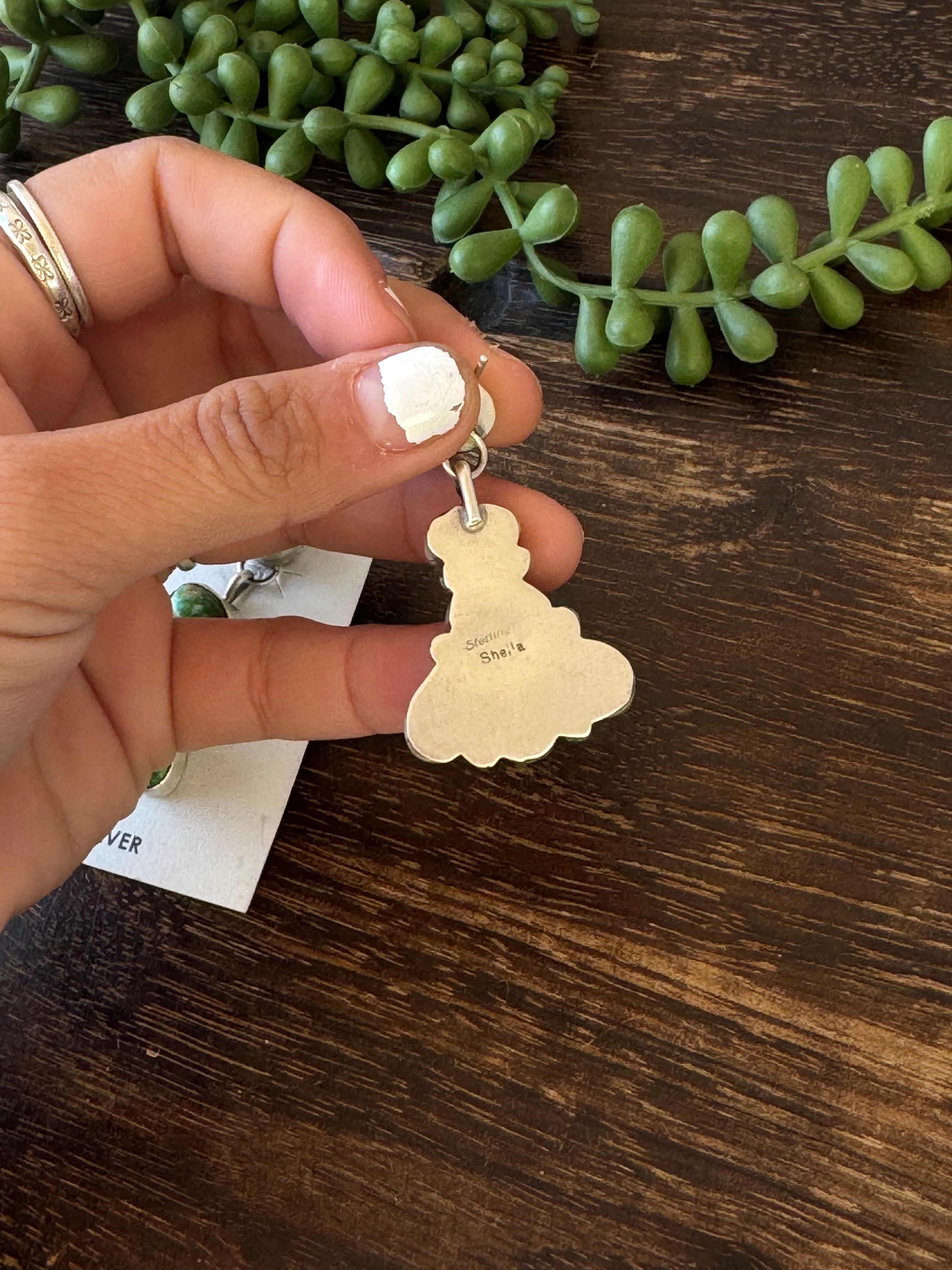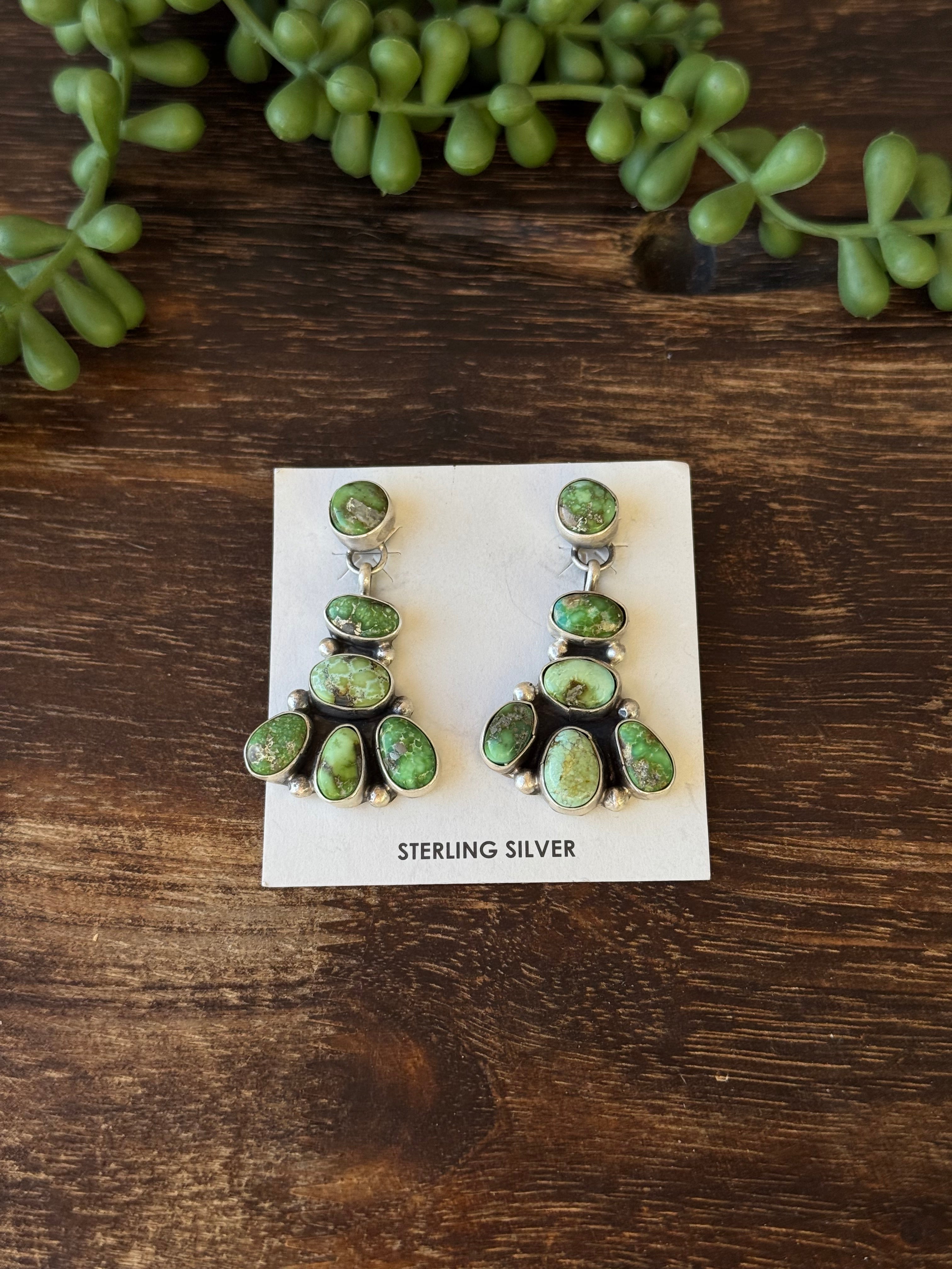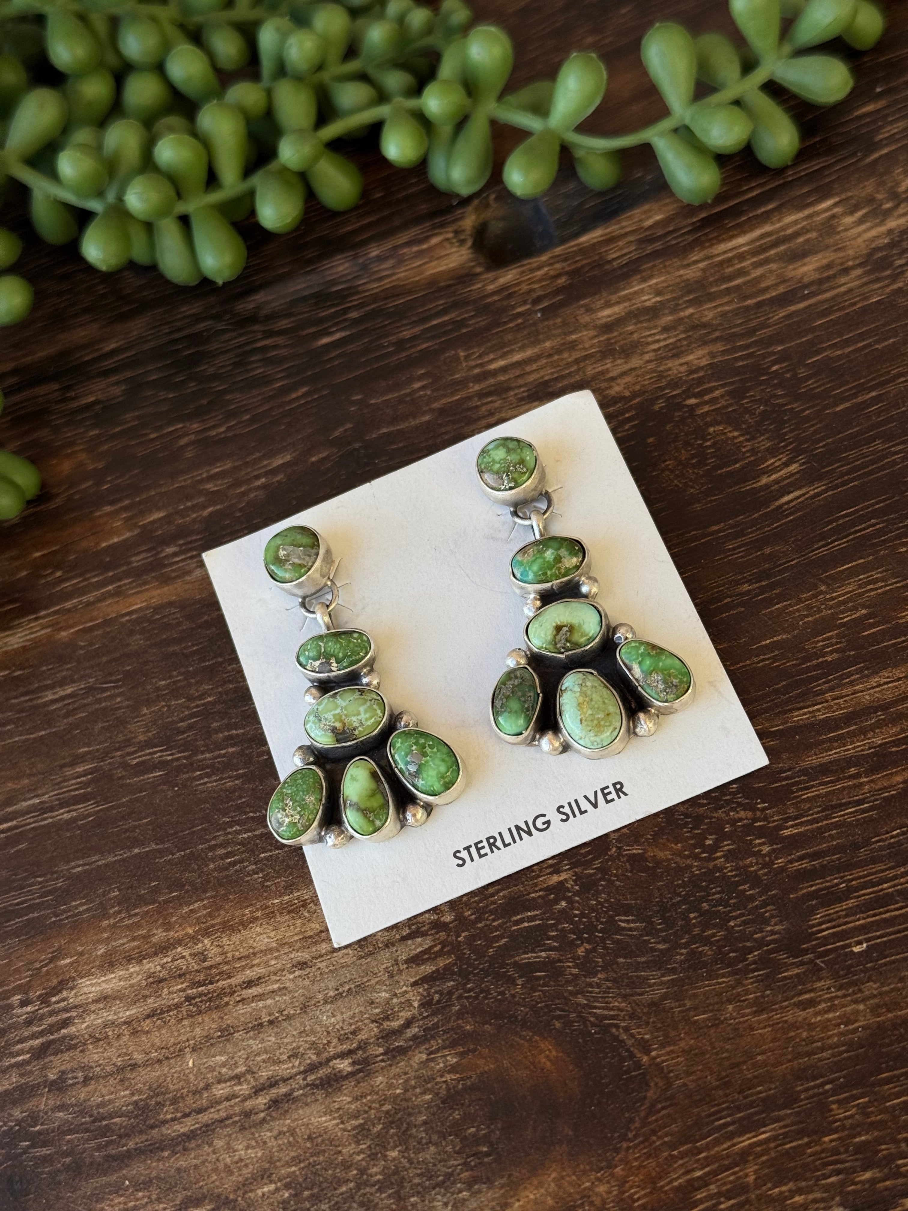 Sheila Becenti Sonoran Gold Turquoise & Sterling Silver Post Dangle Cluster Earrings. They measure 1 7/8 inches long and 1 inch wide. Signed by the artist and stamped sterling silver.